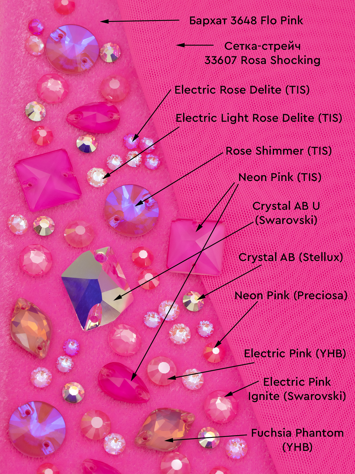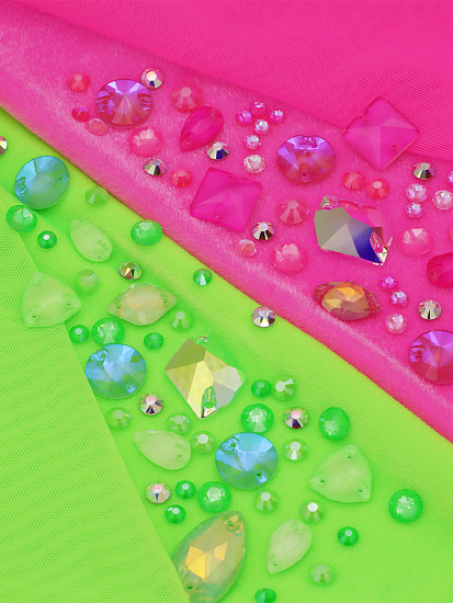 А компанию им составили стразы Swarovski, Stellux, Preciosa, YHB и TIS. Кристаллы в этих цветах наиболее удачно сочетаются с выбранными тканями.