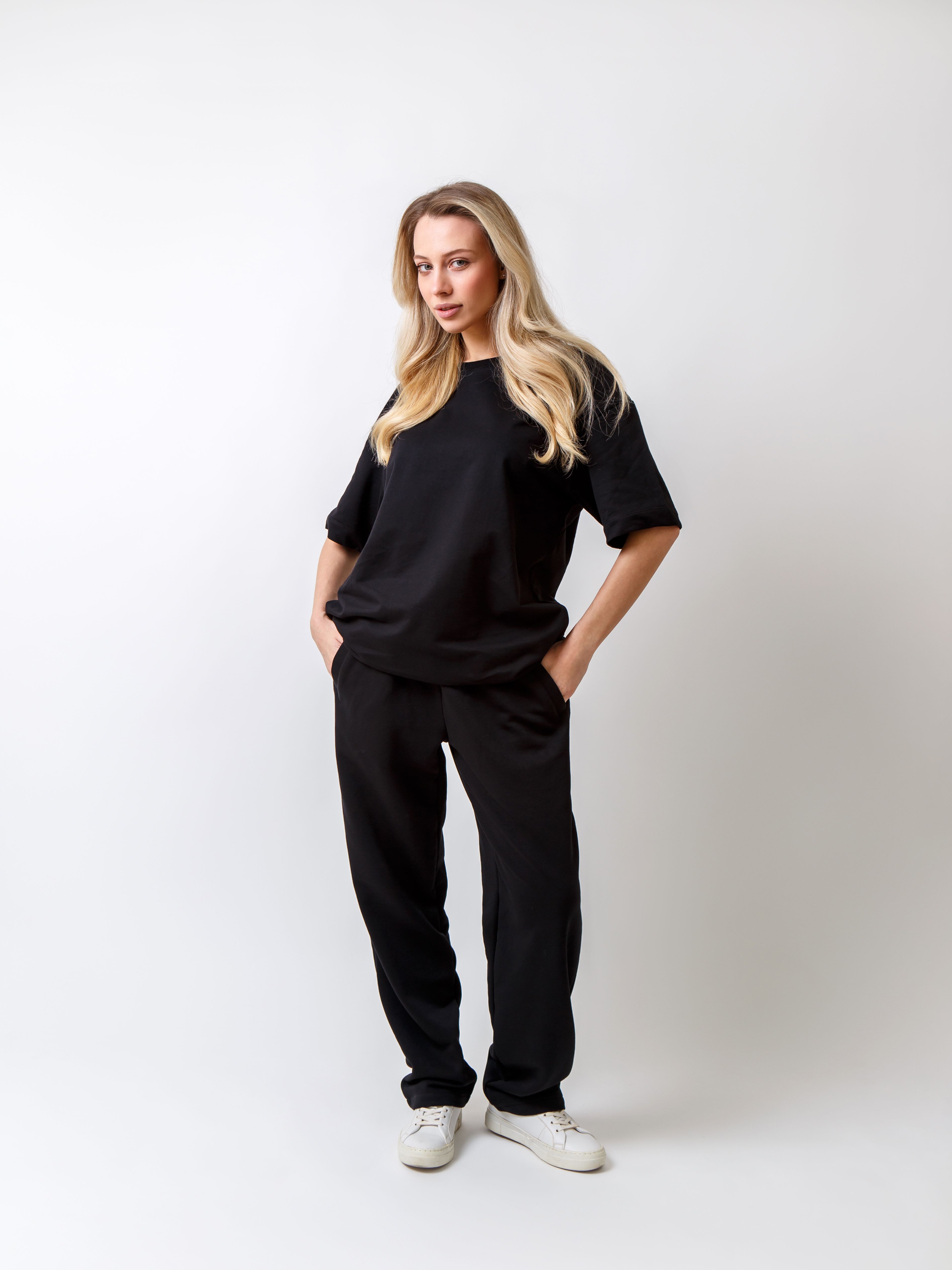 Джоггеры свободного кроя оверсайз с высокой талией, глубокими боковыми карманами и одним задним карманом. Снизу слегла заужены, манжеты отсутствуют.