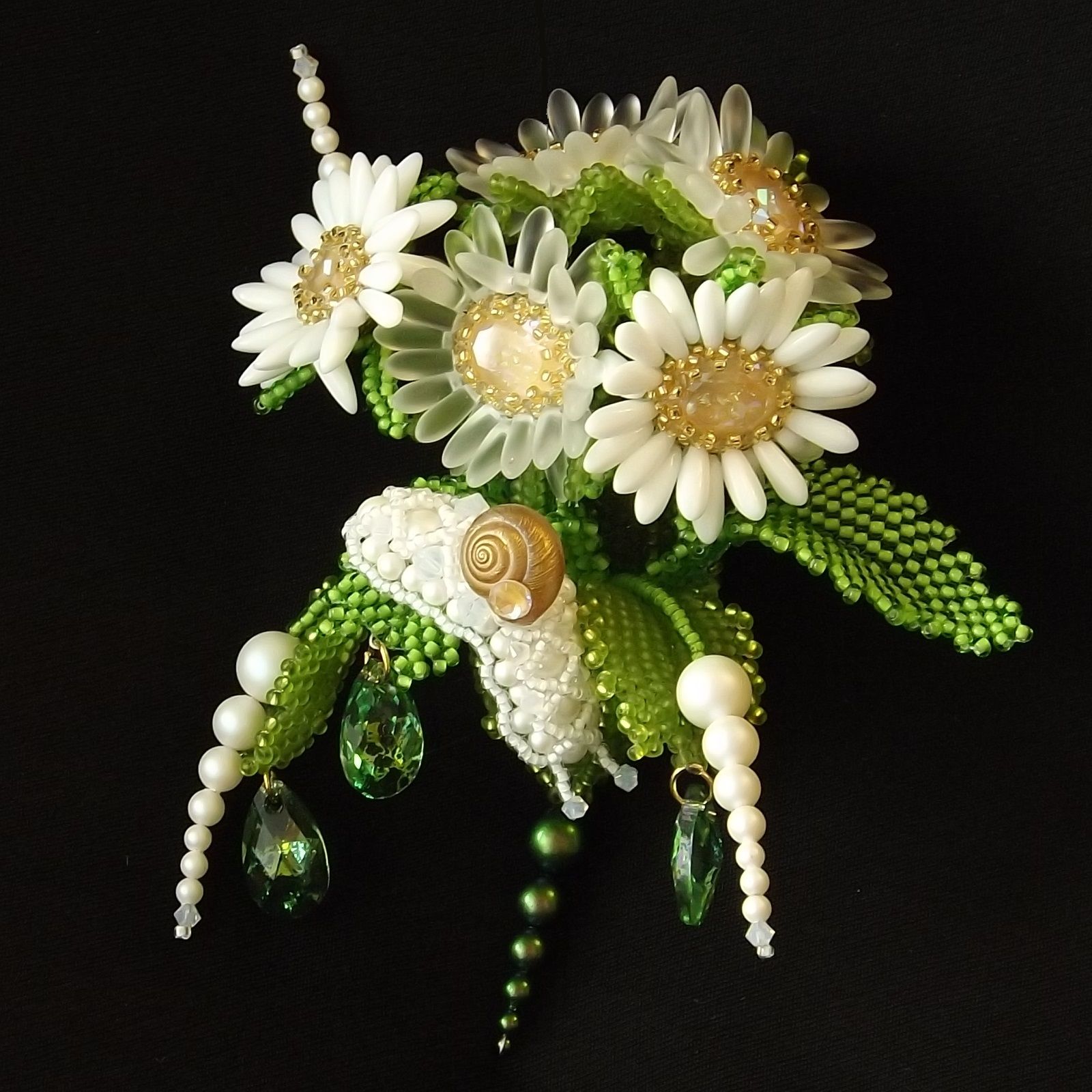 А если серьезно, всегда интересно, что получится, если из горстки бисера, бусин, фурнитуры, камней и черт его знает чего еще, пытаешься воплотить нечто, чтобы оно было похоже на живое: цветы, листья, животных. Кристаллы помогают в воплощении идеи, дают возможность оттенить или усилить сходство украшения с оригиналом; в зависимости от фактуры – передать настроение: сияюще-радостное или матово-грустное, приглушенно-задумчивое или ярко-дерзкое. Позволяют задержать образ во времени, преодолеть сиюмгновенность существования и снова и снова вызывать впечатление. В конце концов, они просто радуют глаз. И пусть с кем-то надолго останется букетик ромашек с любопытной улиткой.