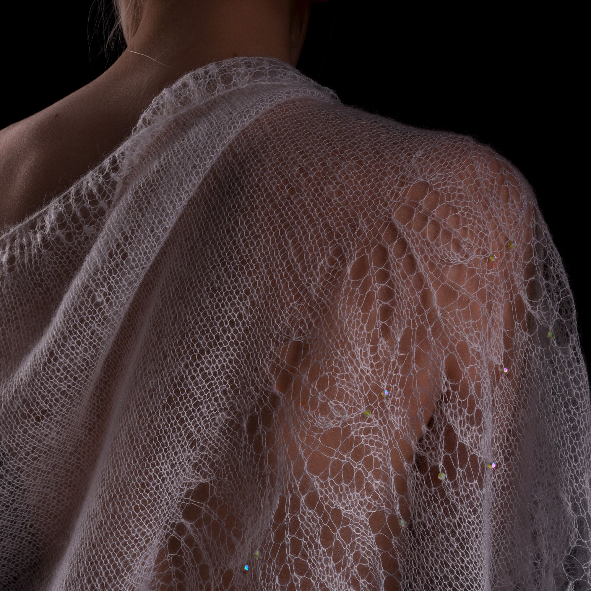 В своей работе я соединила эти символы — связала спицами из нежного мохера белого цвета шаль фишю, в тонком полотне создала букет роз, в ажурный узор цветов добавила кристаллы Сваровски. Преломление лучей света при попадании на грани создают невероятный эффект всего изделия. Мохеровая шаль поражает красотой и изяществом, придает облику аристократизм, очарование и утонченность.