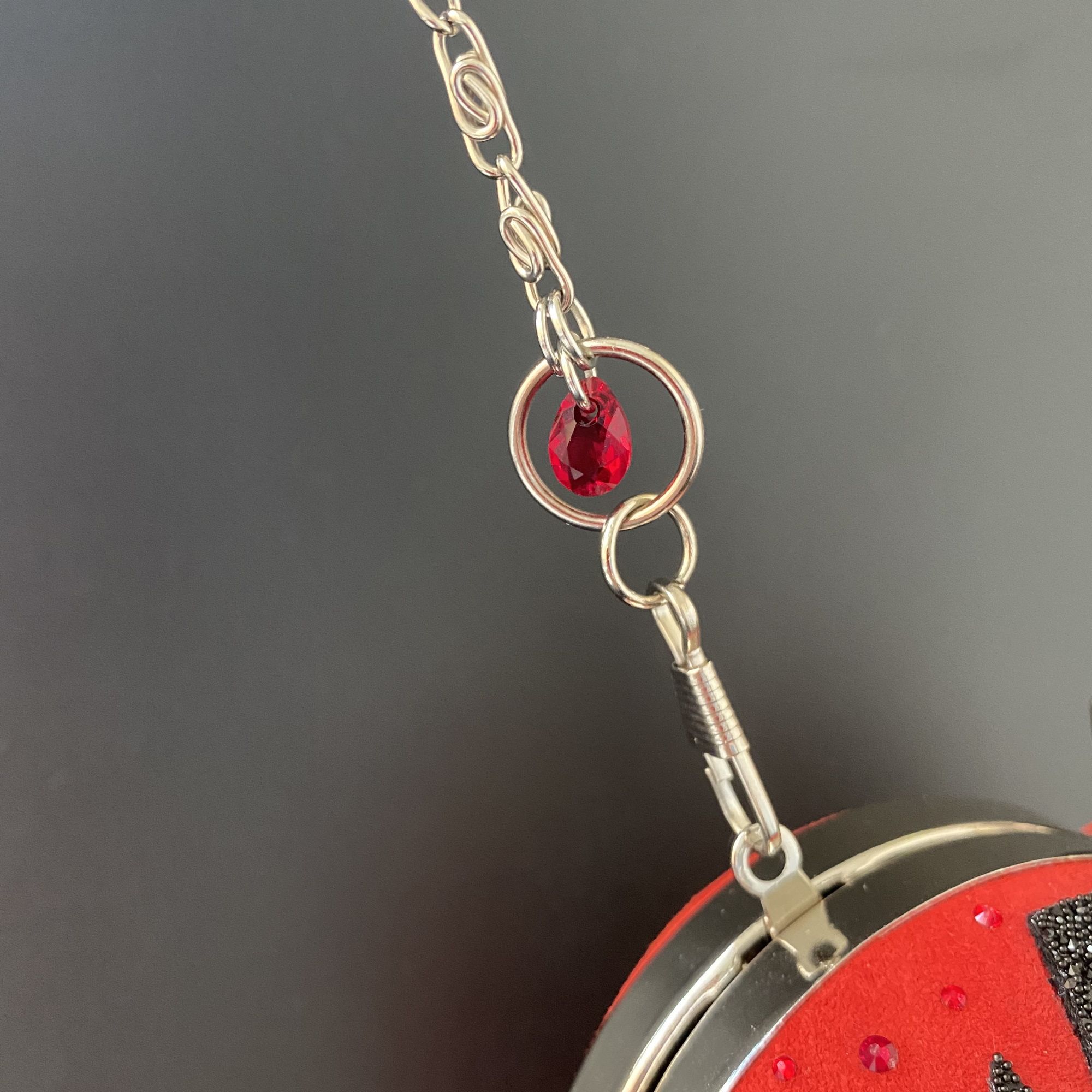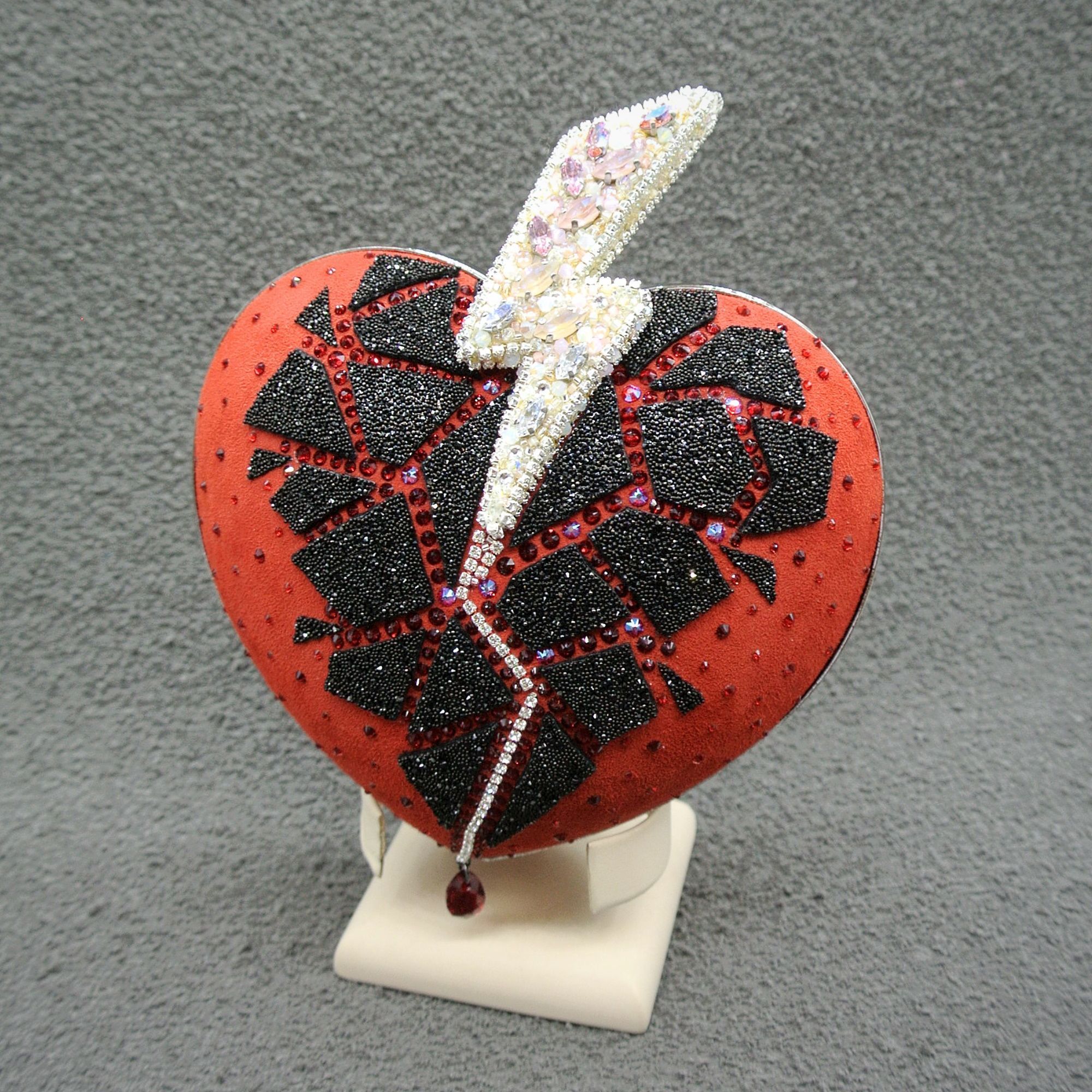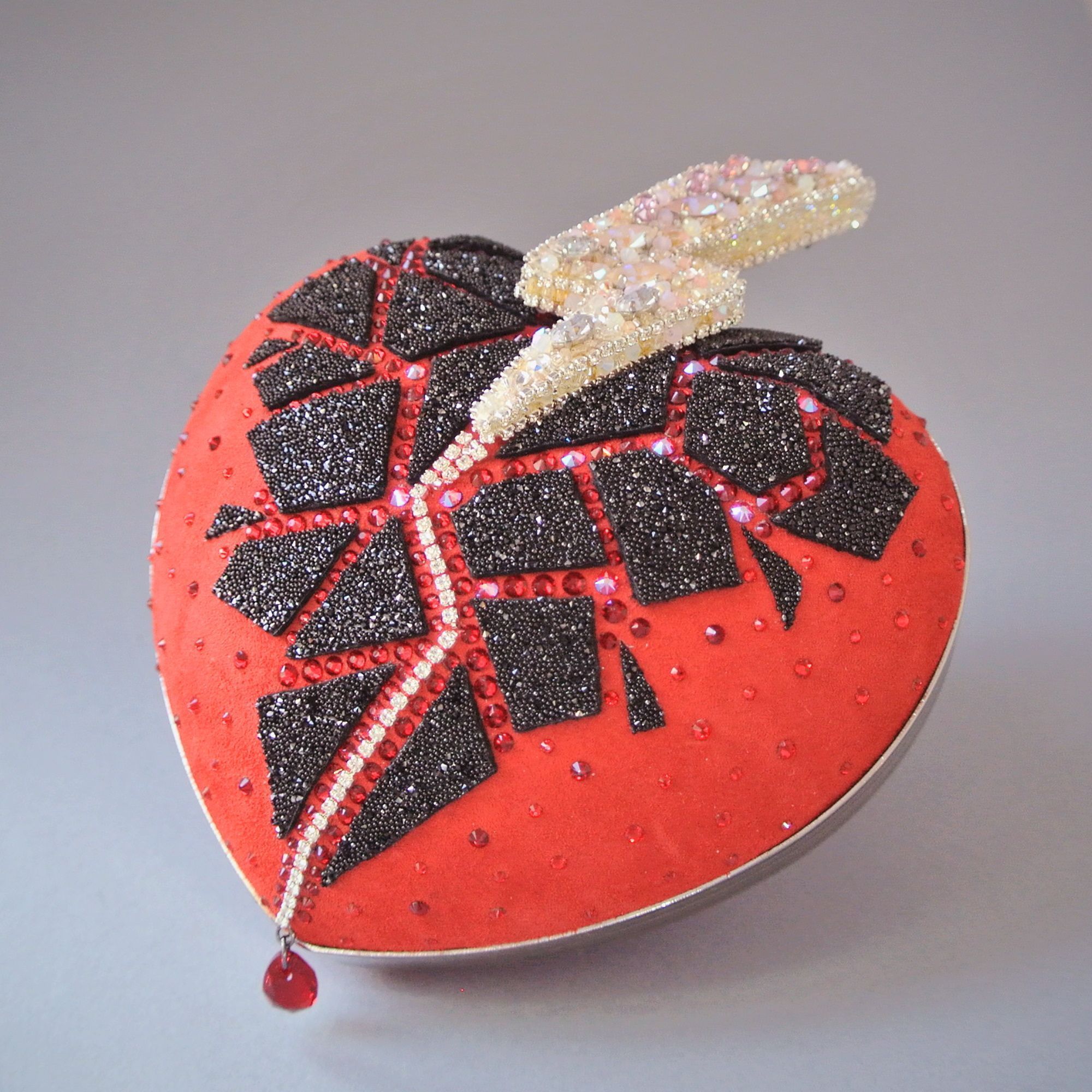 В наши сердца как будто ударила молния, и они почернели от горя. Моя сумочка символизирует такое сердце рукодельницы. Молния вся сияет кристаллами Swarovski. В месте удара сердце покрылось обугленной коркой, которая потрескалась, и в трещинах сверкают капли крови. Сердце плачет…