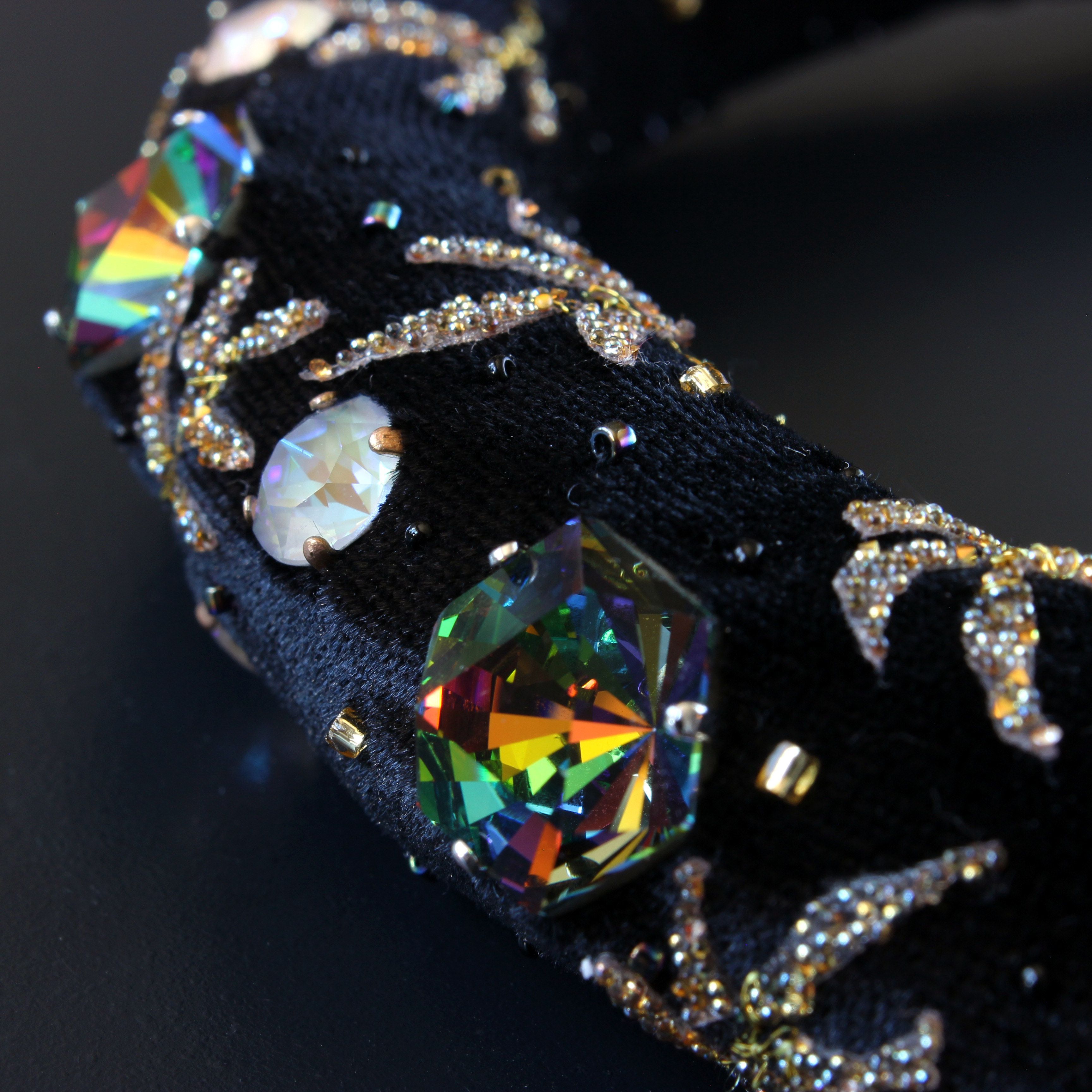 Чёрный бархат — прекрасный фон для блеска кристаллов, на нем они сияют особенно ярко. Мне захотелось создать объёмное, насыщенное блеском украшение, при этом лёгкое, уютное и одновременно благородное. Так вышло украшение в виде мягкого бархатного жгута, расшитого узором из моих любимый кристаллов.