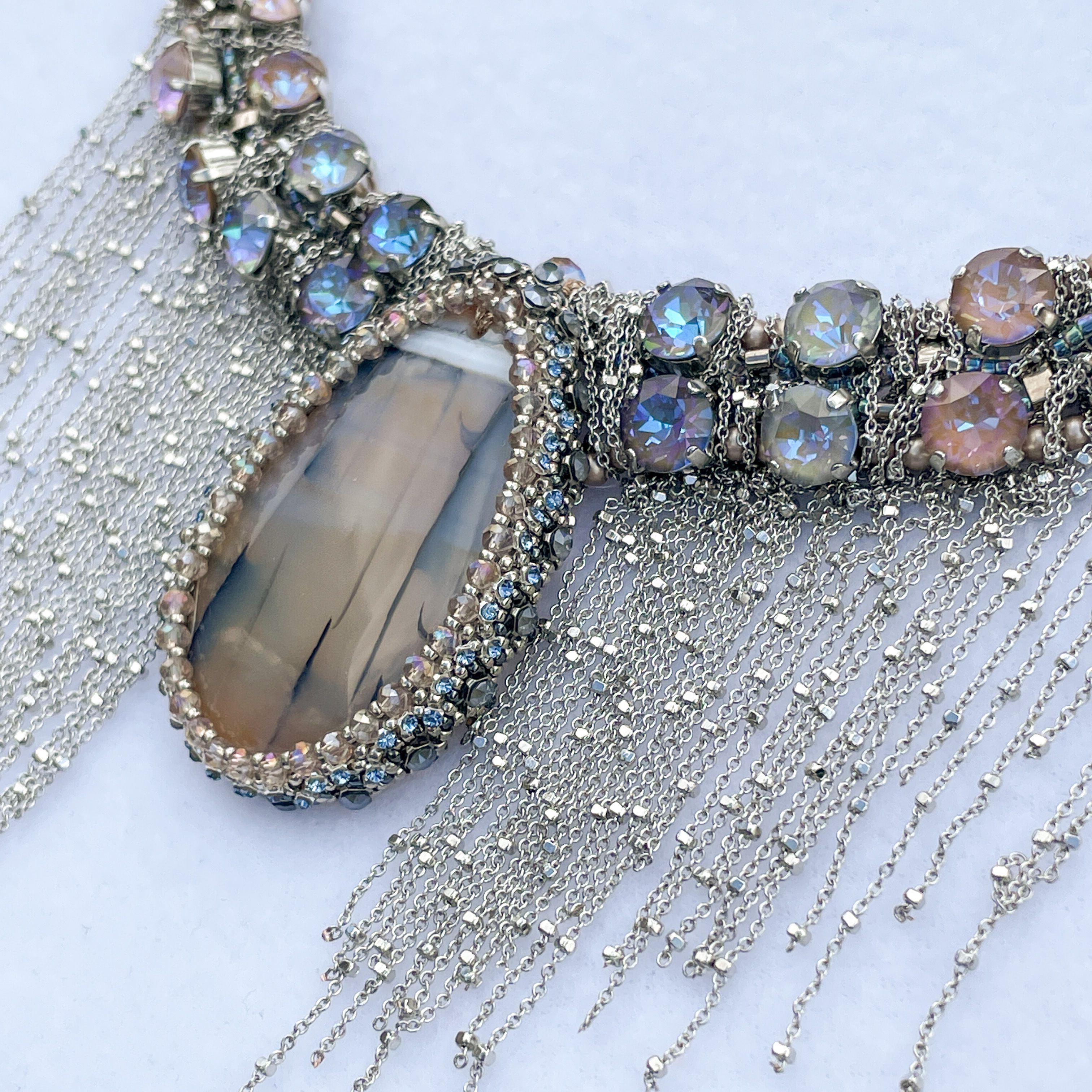 Мы всегда стоим перед выбором, и каждое наше действие запускает определённую цепочку событий. Так и в колье Crystal Vibes каждое наше движение, наклон или поворот, повторяется в бликах кристальных граней и в струящихся утонченных цепочках. Нежнейший градиент приглушённых тонов кристаллов, повторяющийся лейтмотивом в центральном элементе, подчёркивает изысканный аристократичный вкус обладательницы этого колье: она словно снизошла к нам прямо посреди королевского приема, ее образ дополняет высокий парик, веер и платье с открытым декольте и сотнями слоёв пышных юбок.
