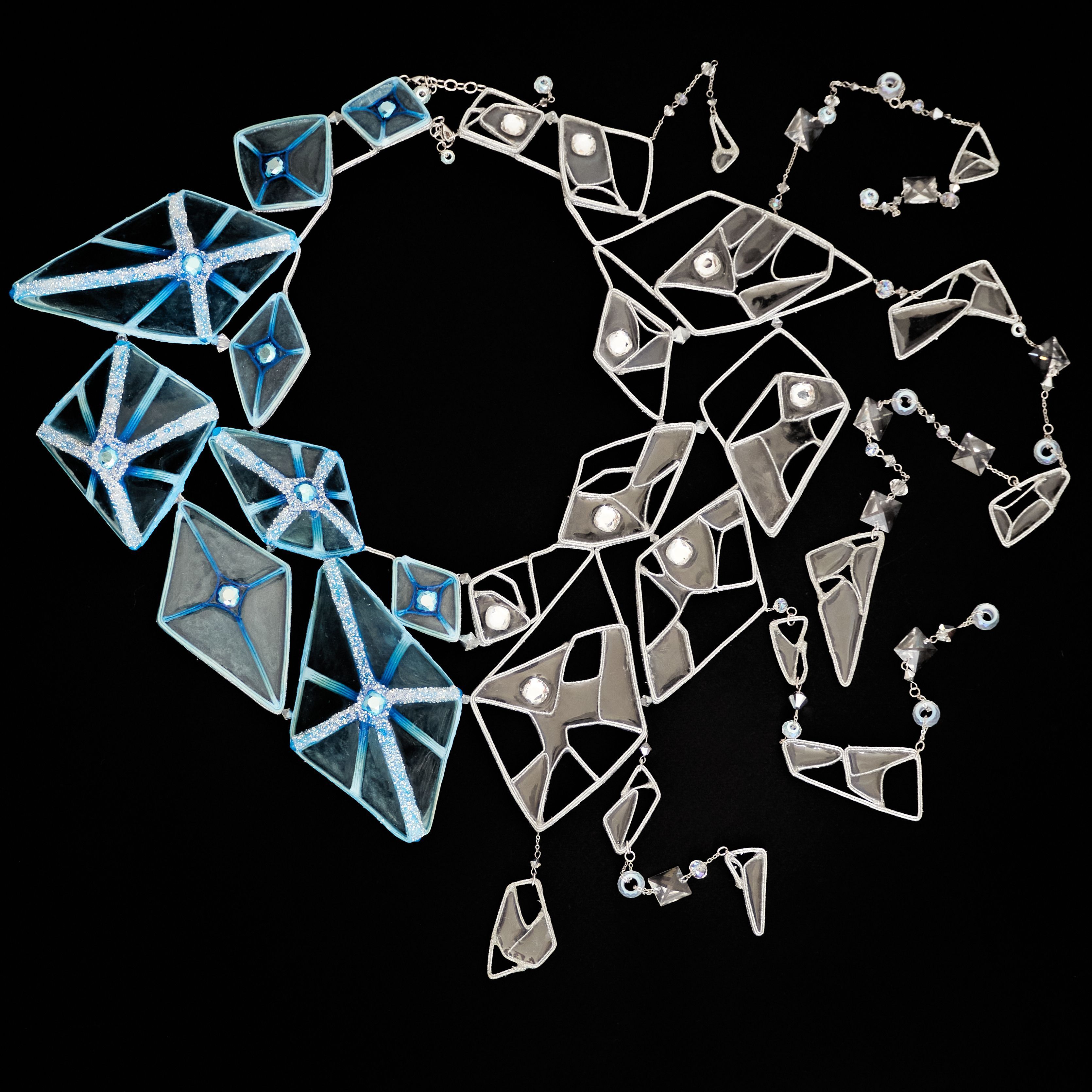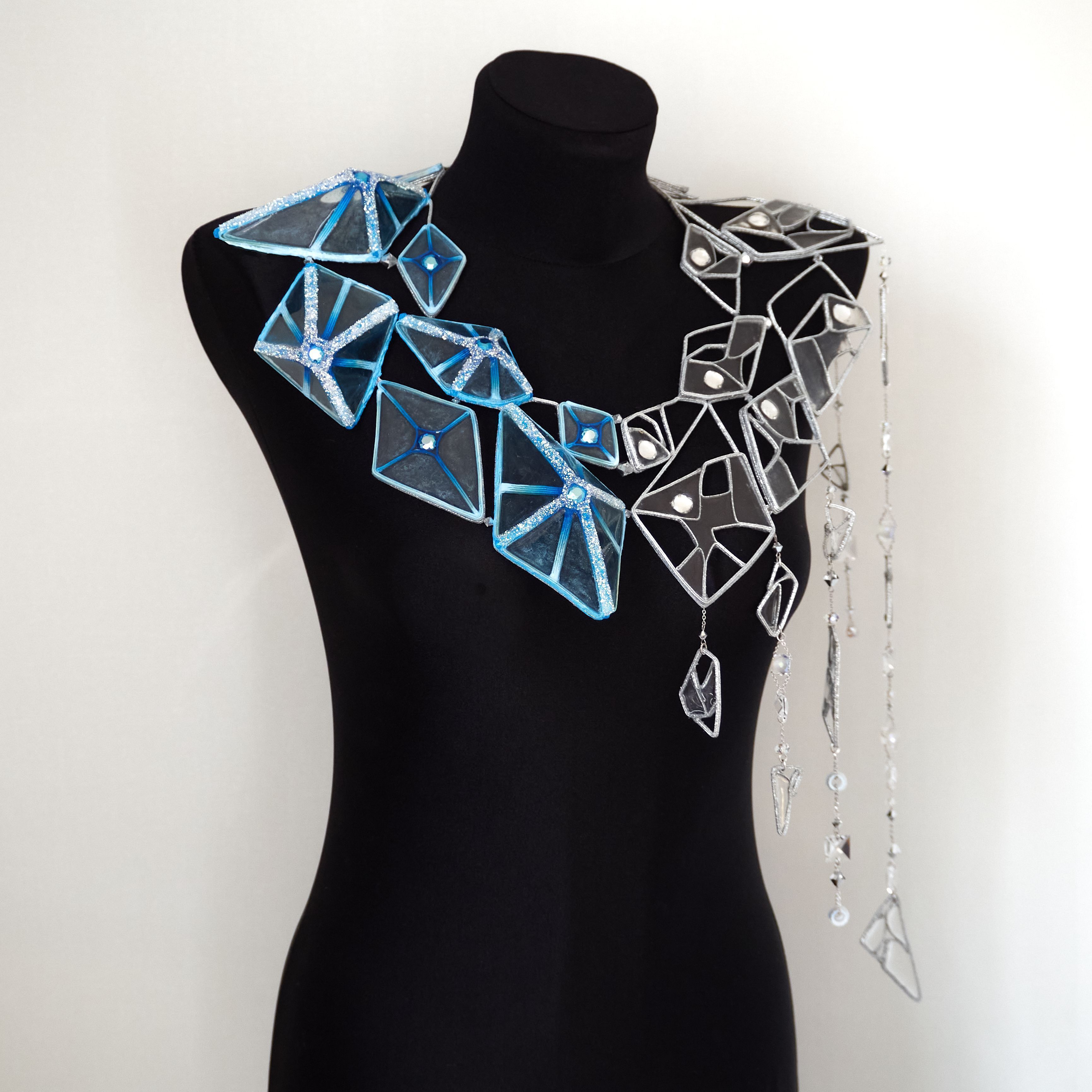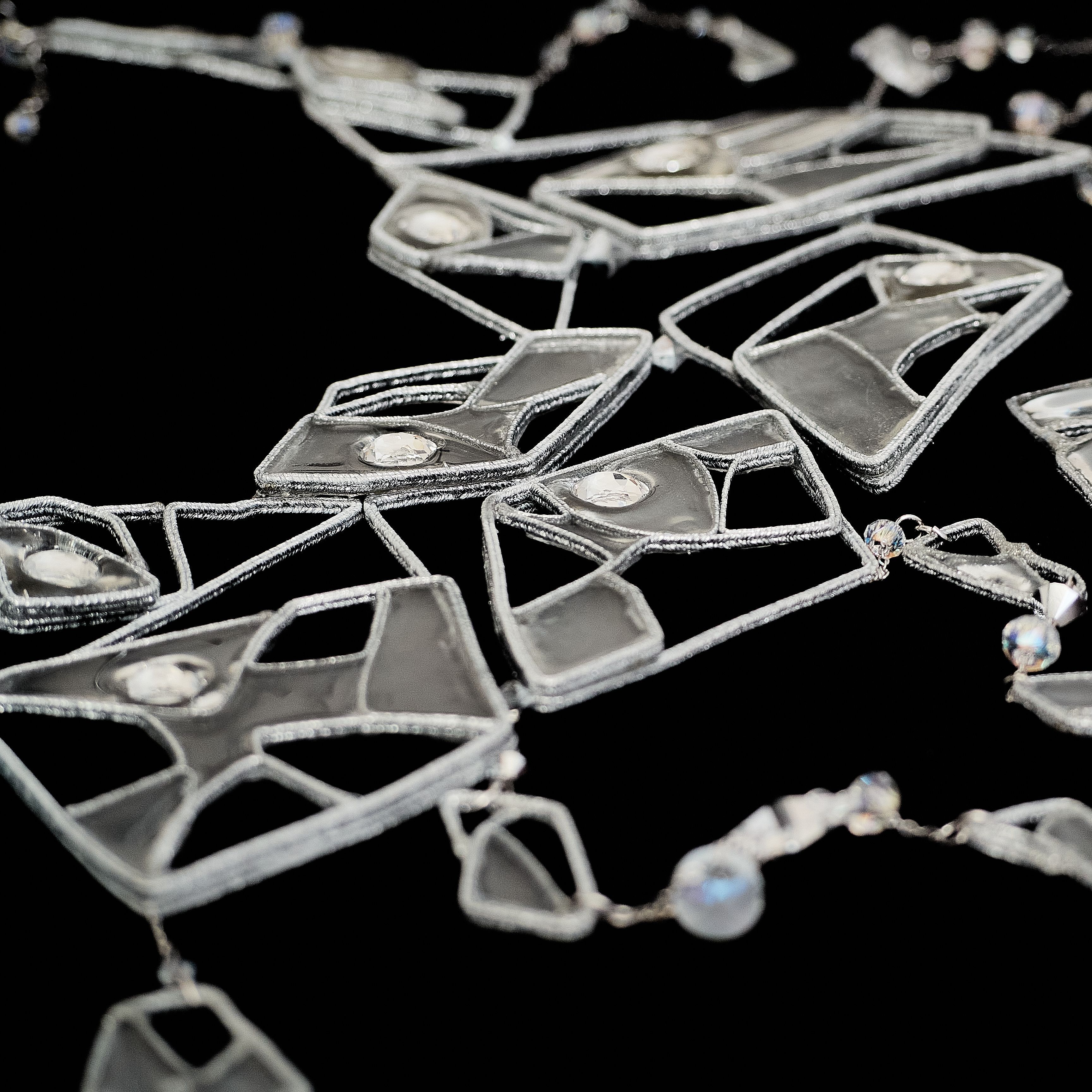 Левая же сторона выполнена в виде разбитых кристаллов с разлетающимися осколками. Каждый осколок на бахроме соответствует недостающему кусочку разбитого кристалла на колье, их можно собирать как мозаику.