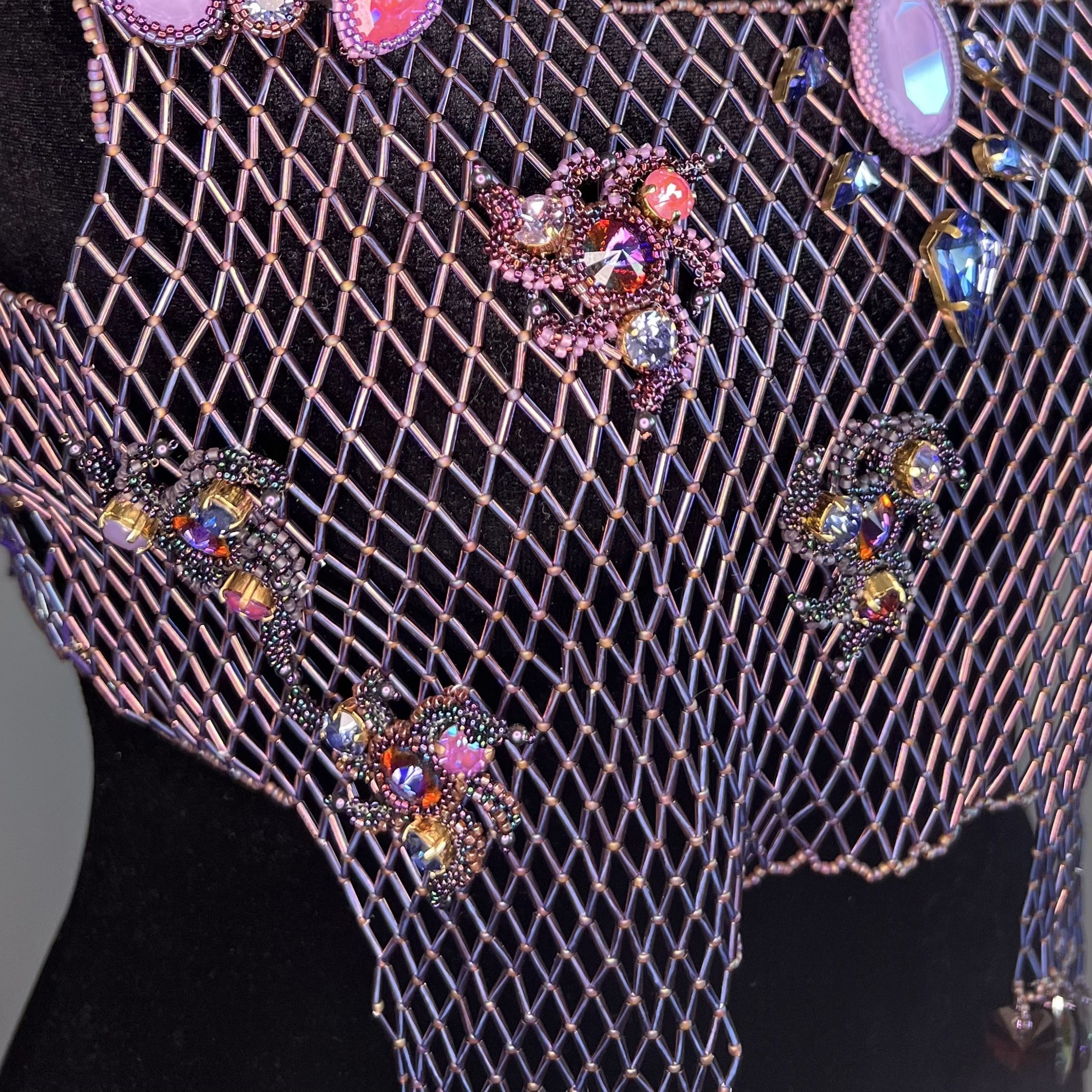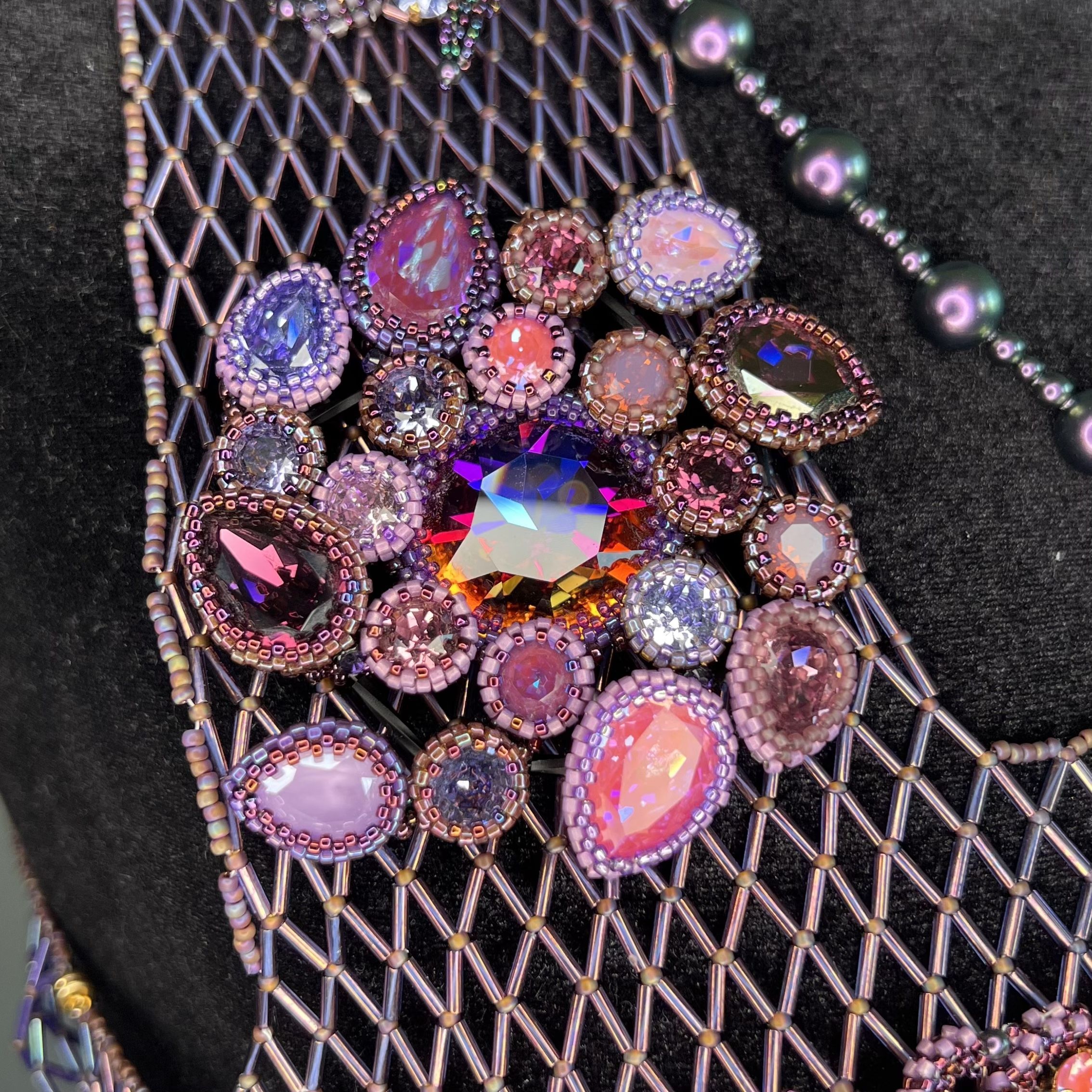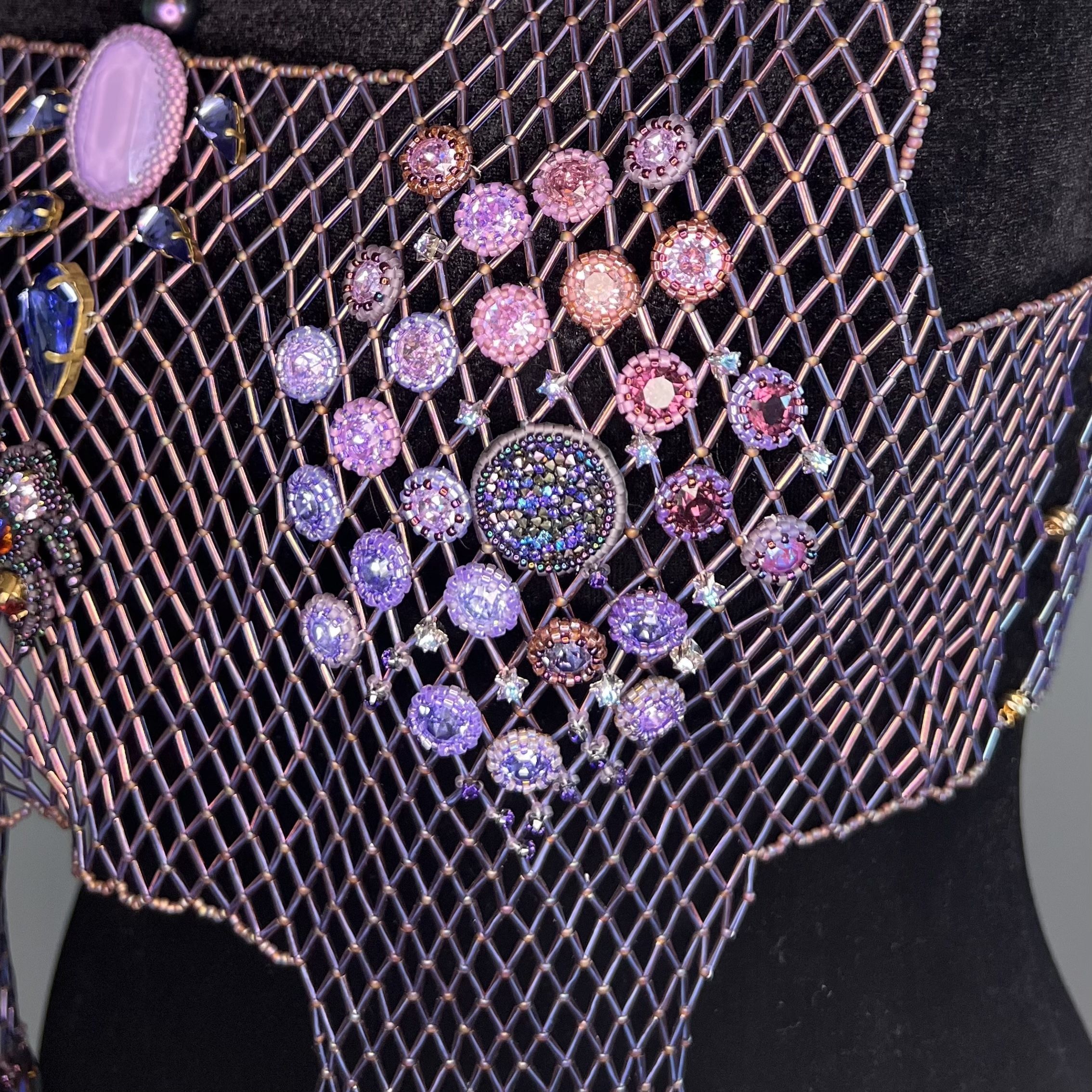 Для воплощения темы космоса я выбрала украшение большого формата – ажурный жилет. Все элементы акуссуара выполенены в различных  техниках плетения.  Для раскрытия темы космоса мне хотелось использовать разнообразные формы и максимальное число кристаллов различных оттенков для изображения вселенной, туманностей и скоплений звезд.