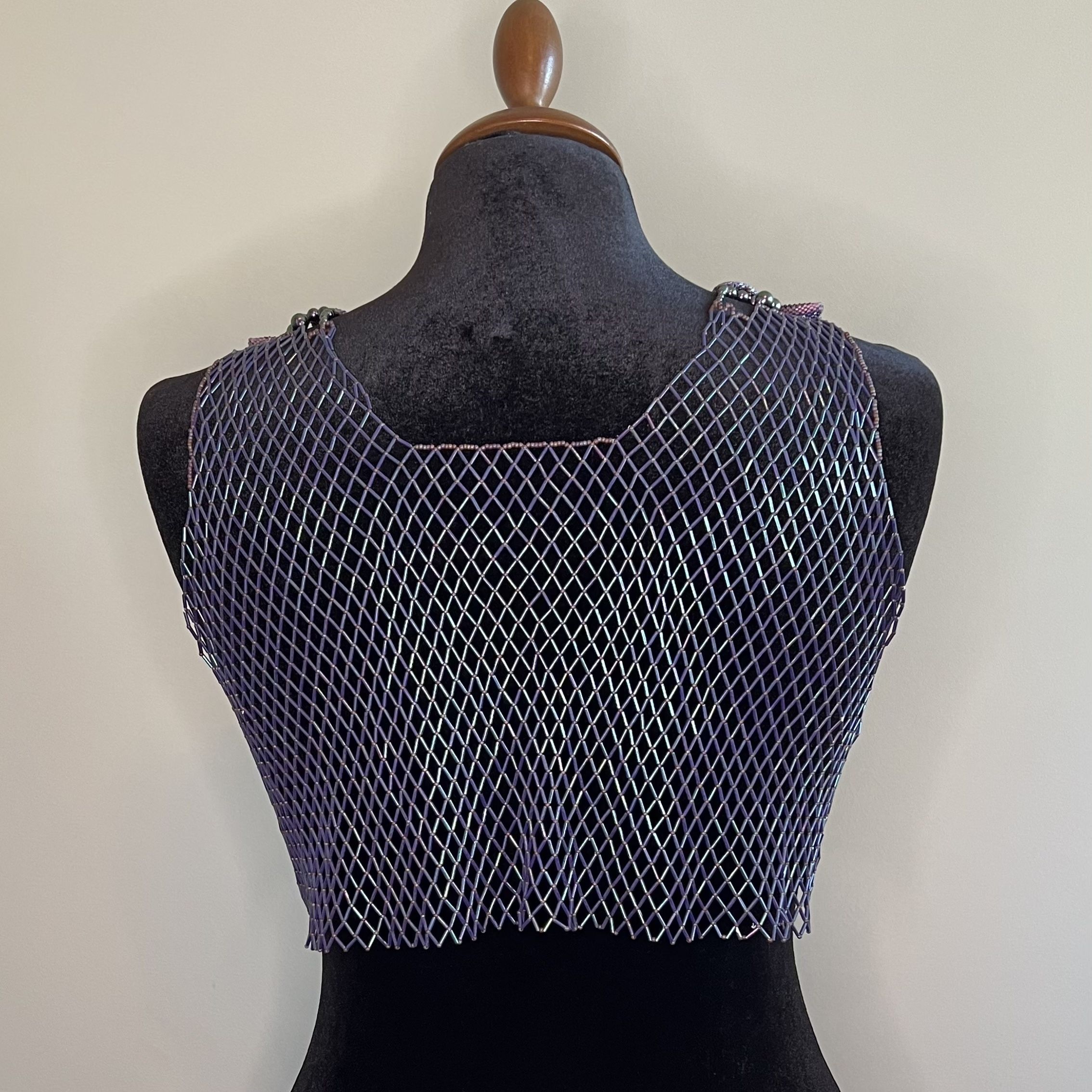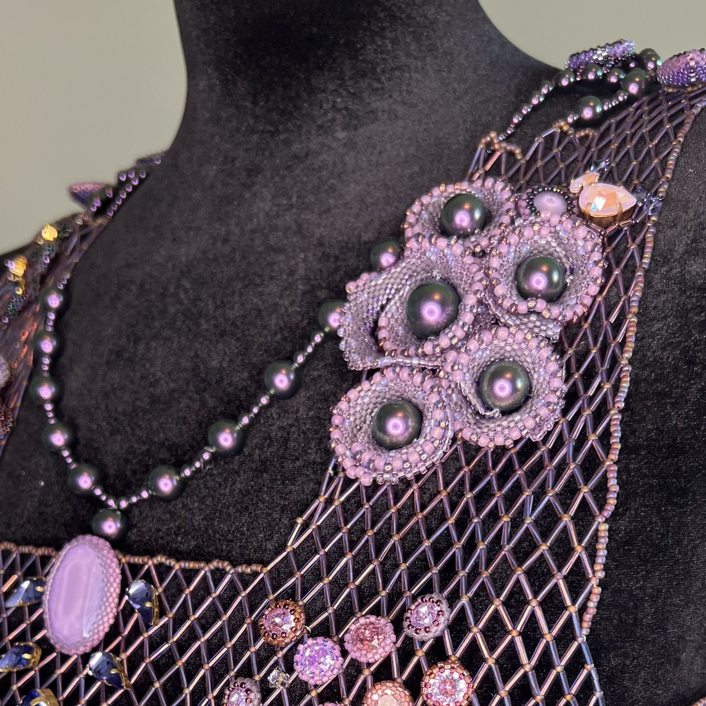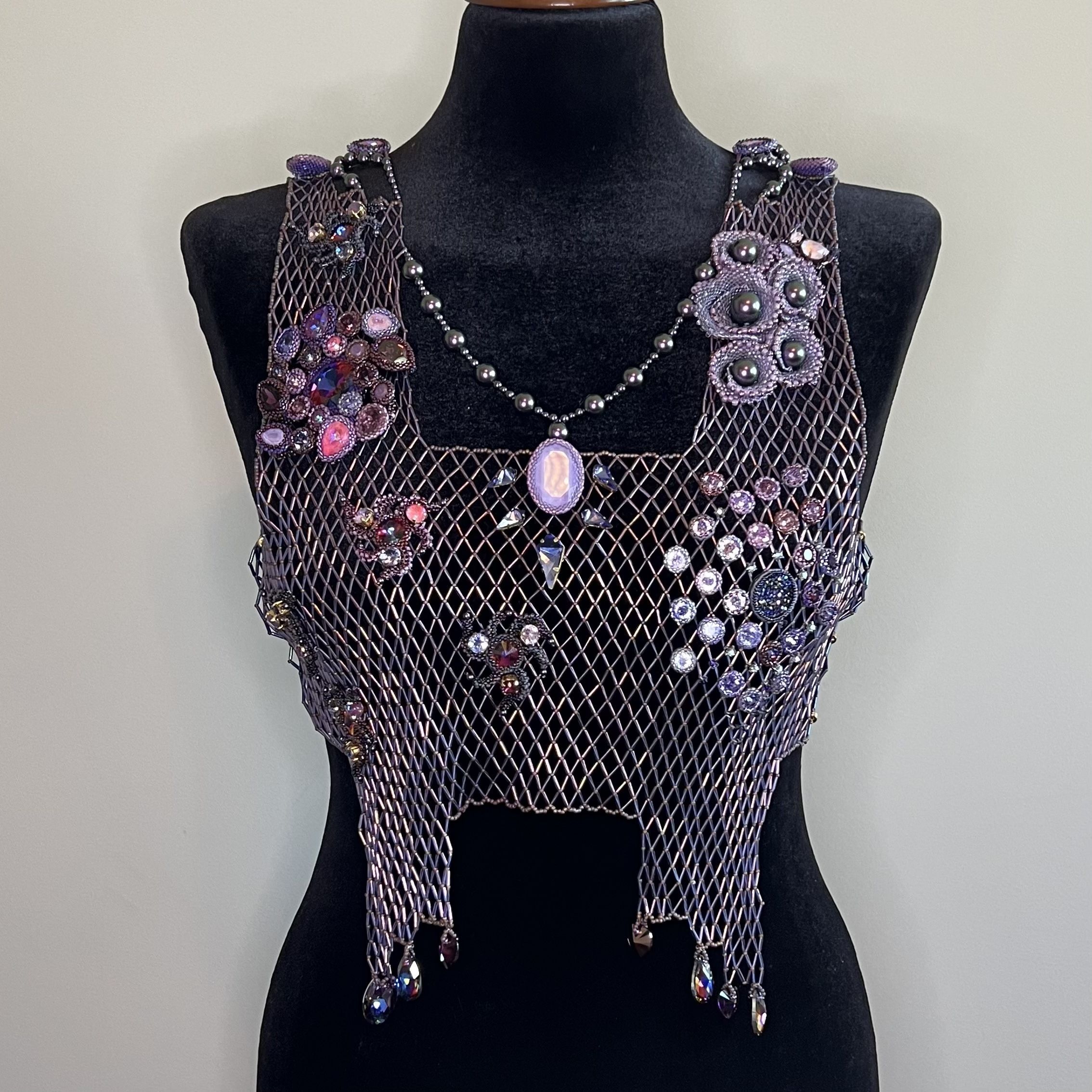 Для воплощения темы космоса я выбрала украшение большого формата – ажурный жилет. Все элементы акуссуара выполенены в различных  техниках плетения.  Для раскрытия темы космоса мне хотелось использовать разнообразные формы и максимальное число кристаллов различных оттенков для изображения вселенной, туманностей и скоплений звезд.