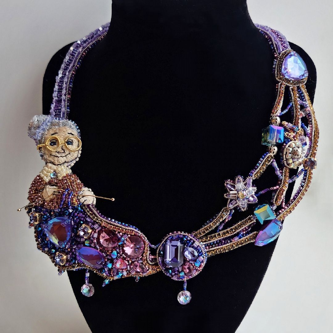 На моём колье изображена милая бабушка, которая вяжет спицами переливающееся всеми гранями кристаллов полотно Вселенной.Из клубка бесконечности выпускаются мерцающие нити, уходящие в глубину миров, переплетая между собой человеческие судьбы, временные эпохи и события. Своими руками бабушка выстраивает по задуманному ей плану планеты, наводит порядок и упорядочивает хаос. На её лице играет милая, непринуждённая улыбка, ведь только ей известны ответы на волнующие тысячелетиями человечество вопросы. Она видела зарождение жизни и именно она связала первую петлю, давшую начало Вселенной.