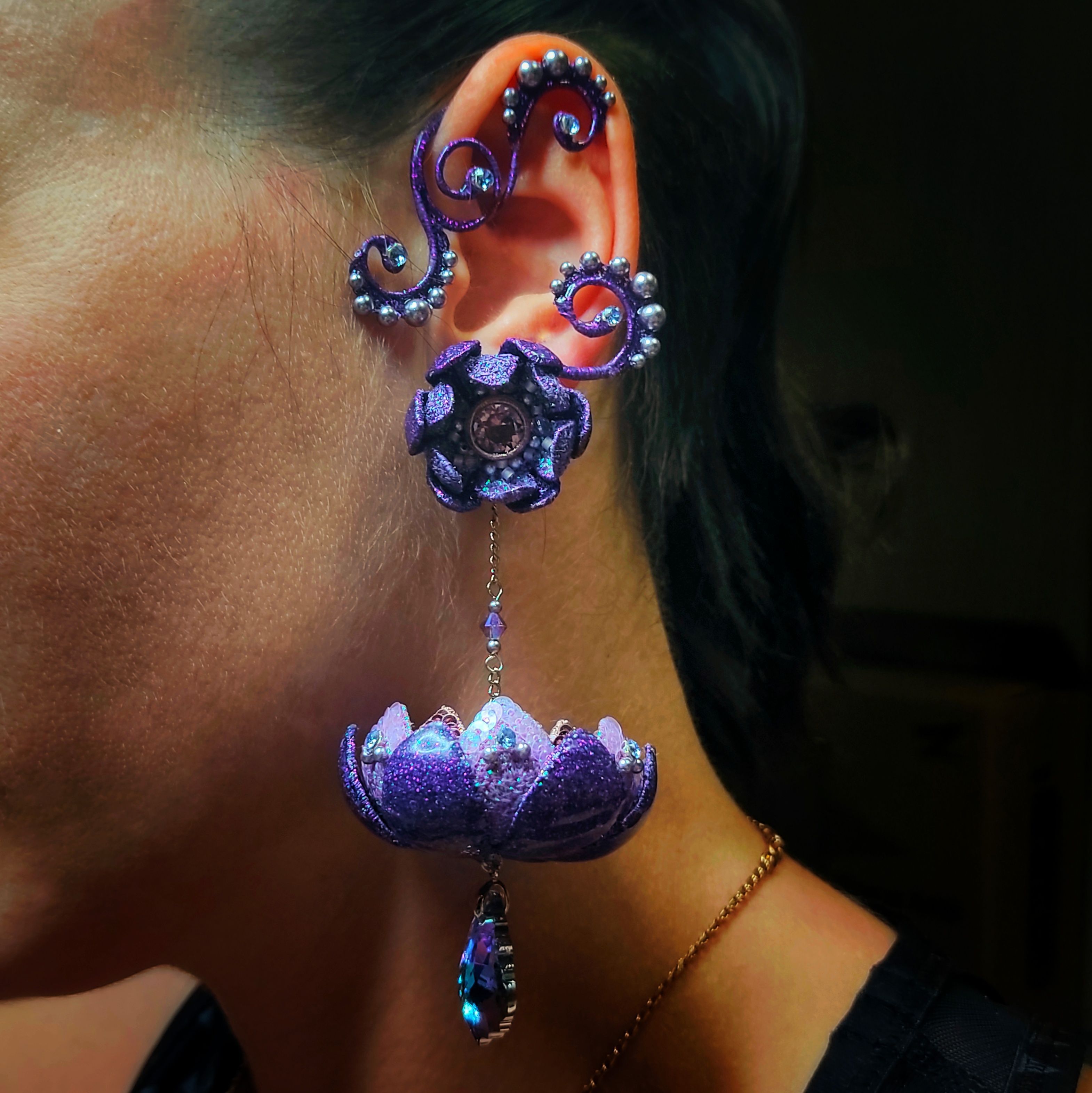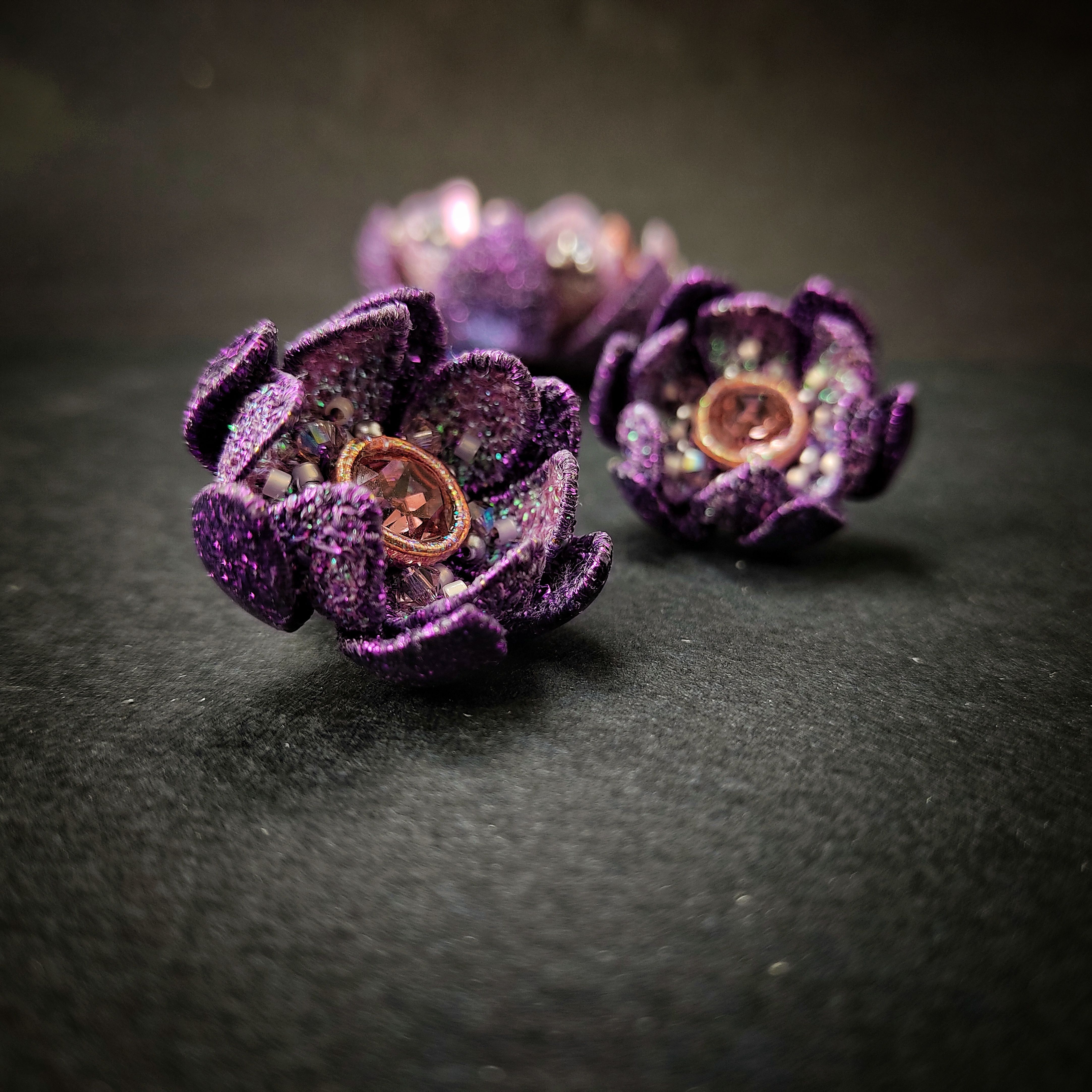 Цветы выполнены в технике свободно-ходовой машинной вышивки с использованием проволочного каркаса. Кафф выполнен из проволоки и металлизированных нитей с ввязыванием кристального жемчуга крючком.
