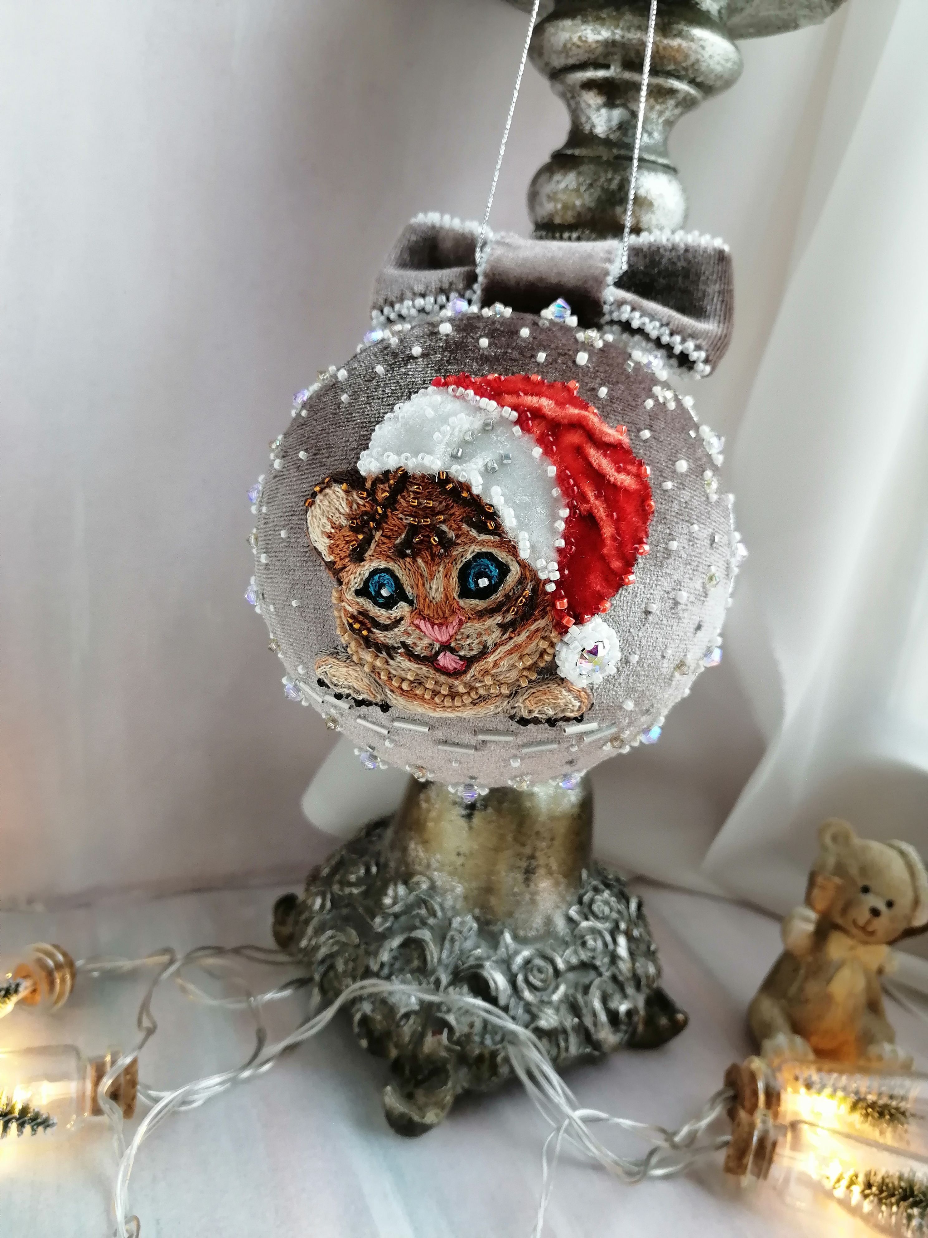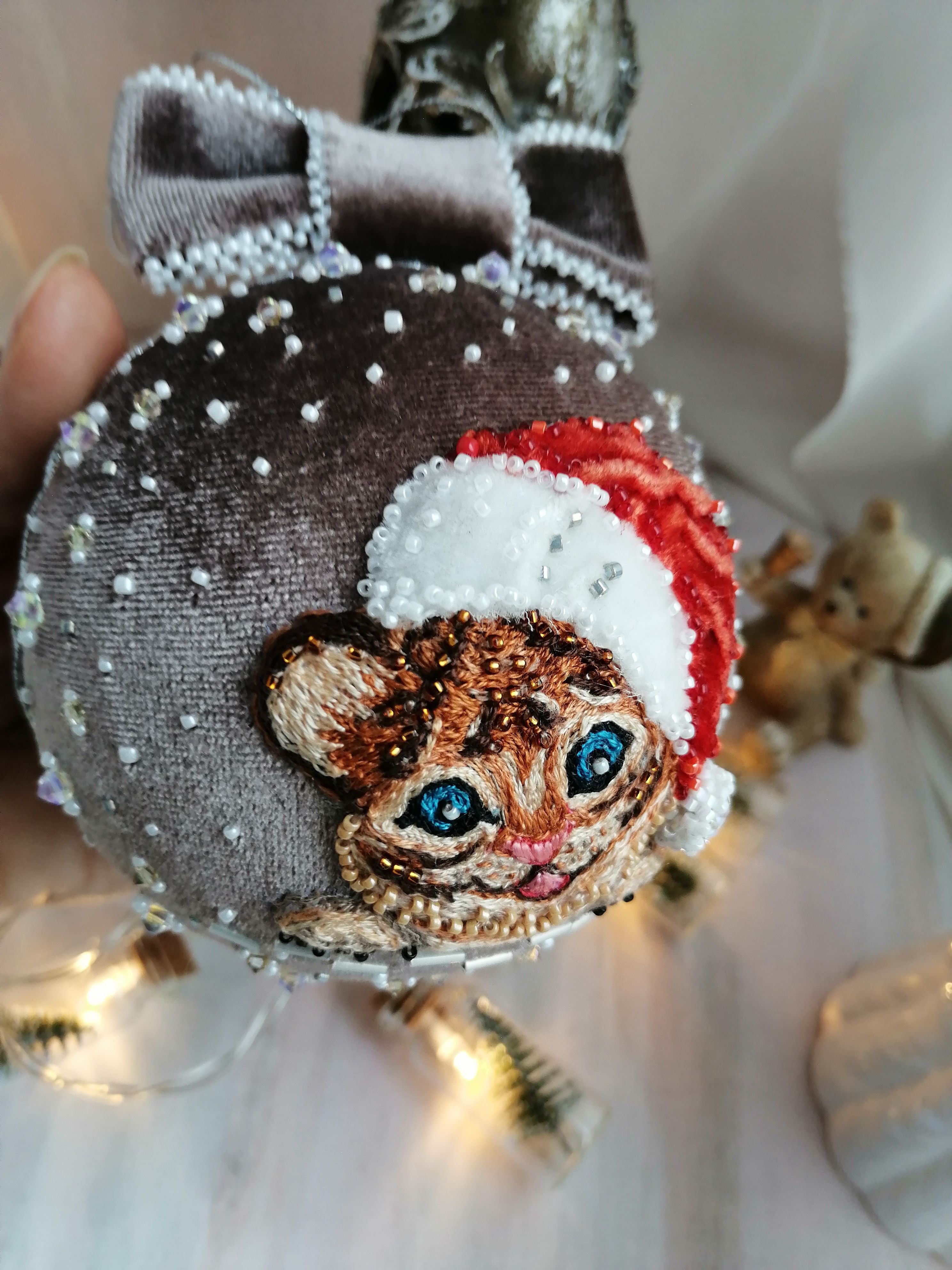 Ёлочная игрушка "Бархатный шар с тигренком"