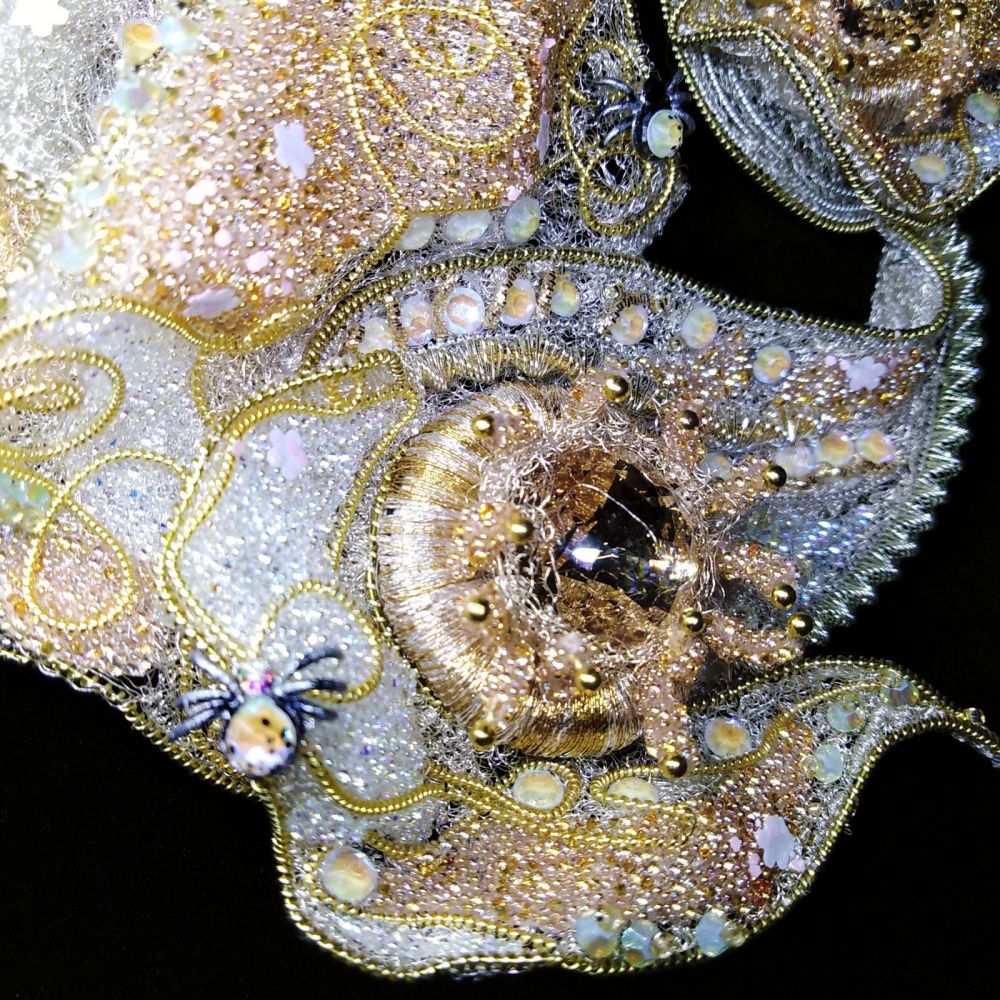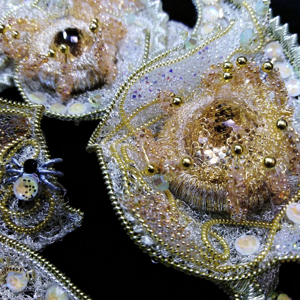 Название броши «Карамель в паутине» может ассоциироваться с женским романом или кондитерским десертом. Но именно простая карамель, рассыпанная на дорожке в парке, стала идейным вдохновением для создания украшения. Она так переливалась своей «медовостью» и « янтарностью», источая сладостный аромат под лучами солнца, что не могло оставить без внимания подползающих всякого рода букашек.