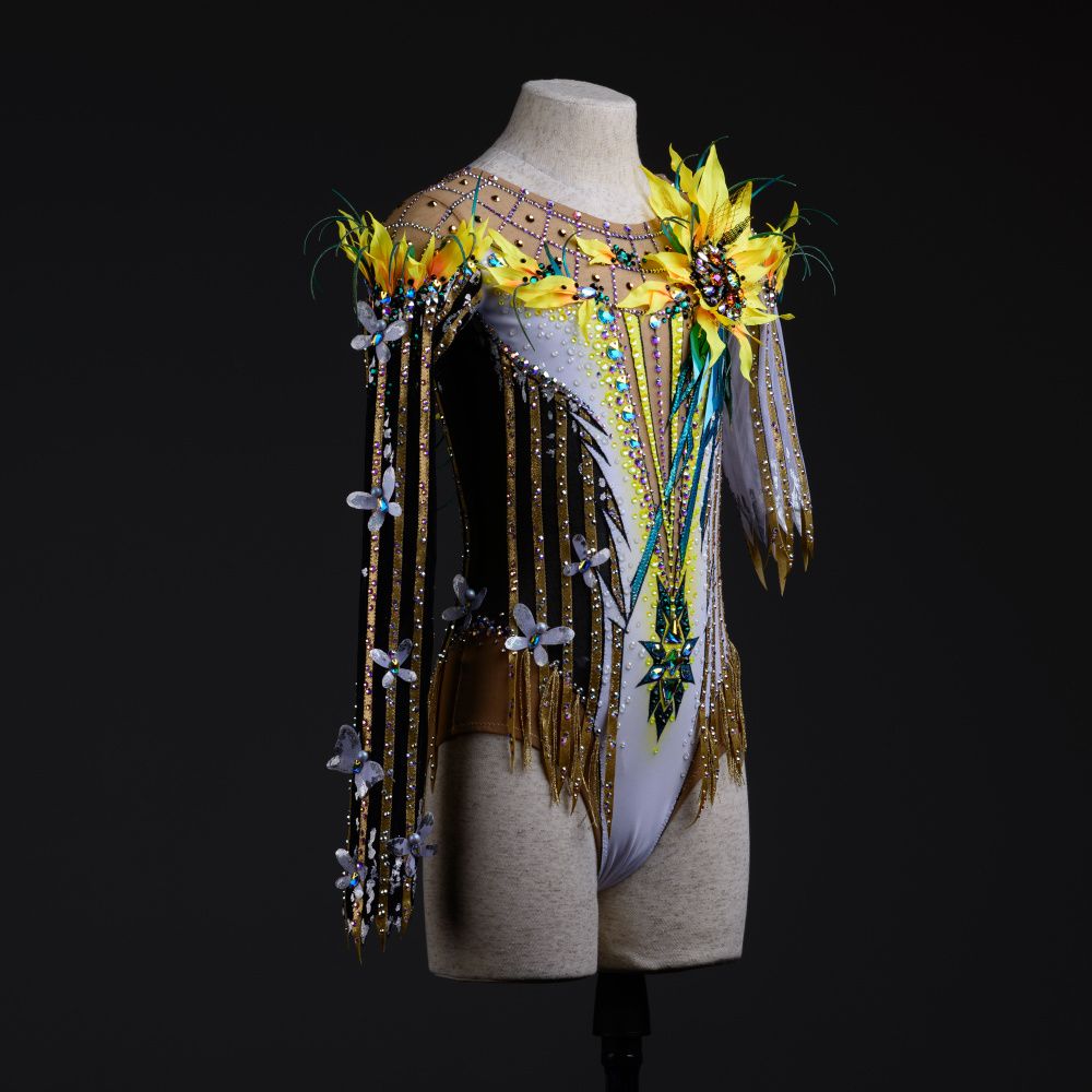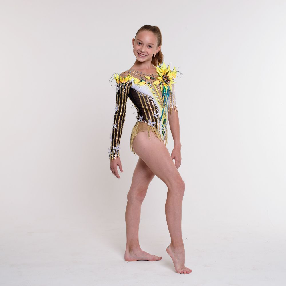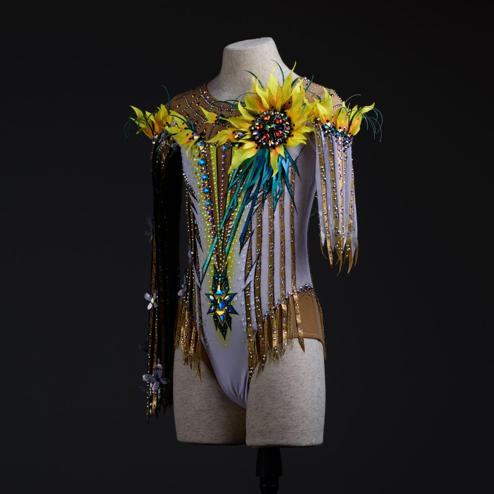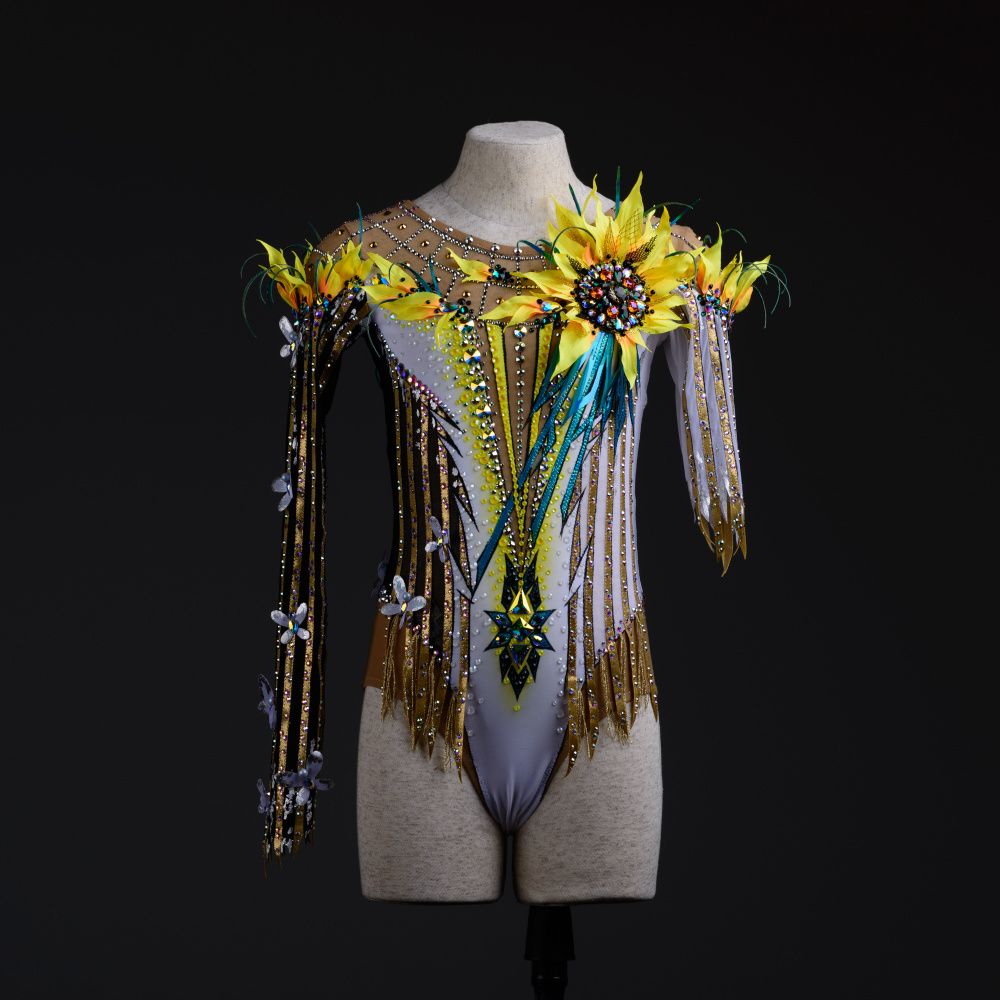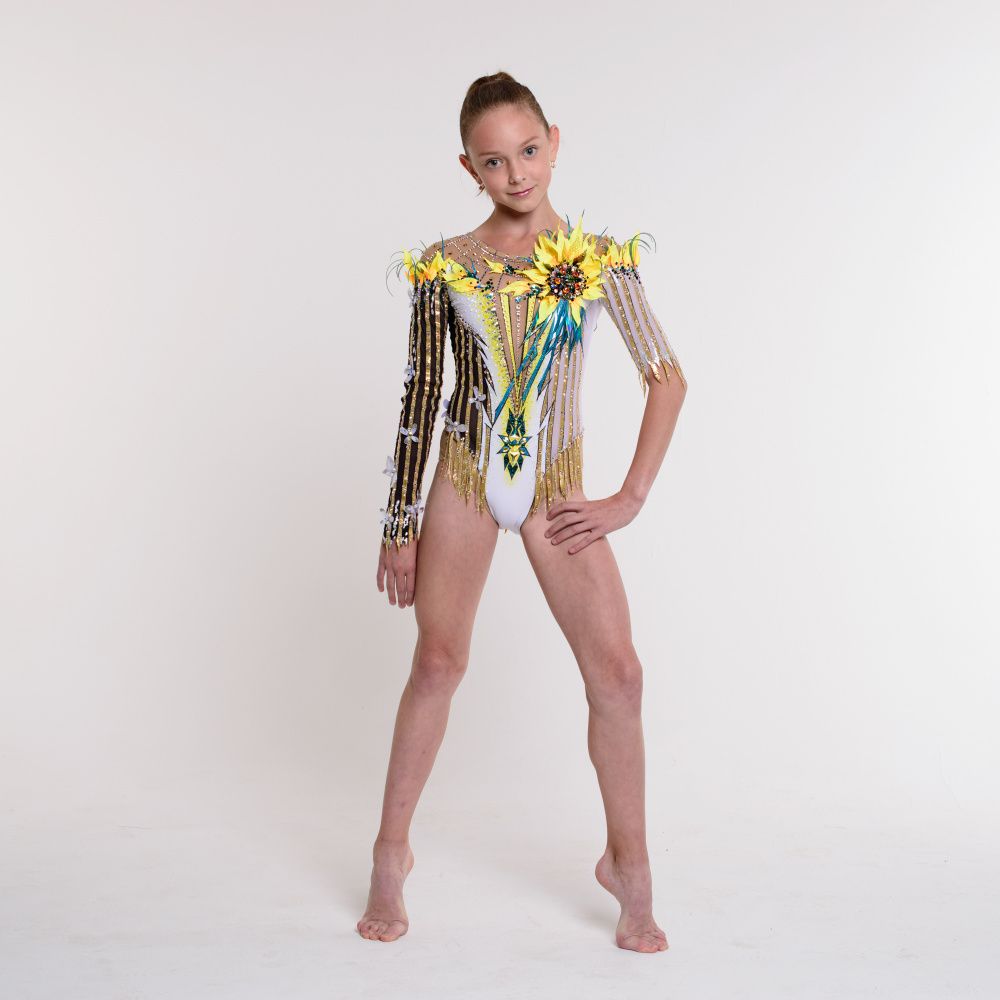 Центральным символом в нашей работе является подсолнух - это символ тепла, радости, стремительности и благодарности. Именно солнцу он обязан своей красотой, ведь каждый раз он раскрывается при его появлении, непрерывно поворачиваясь в направлении солнечных лучей. На наш взгляд, эта работа является наглядным подтверждением фантастической истории происхождения этого чудесного цветка. В одном из древнегреческих мифов    повествуется о том, как водяная нимфа по имени Клития была выброшена из прохладных глубин на берег песчаного острова.   Очарованная ярким светом, она отдыхала на берегу и удивленно наблюдала за невидимым ею дотоле золотым солнечным шаром, который передвигался по небу. Это зрелище так завлекло ее, что она пожелала всегда любоваться этим небесным светилом. Мольбы Клитии были услышаны. Ее русалочий хвост ушел в песок, приковав ее к месту, ее серебряные волосы свернулись в лепестки вокруг ее лица, а из ее пальцев выросли зеленые листья. Нимфа превратилась в подсолнух - цветок солнца, чей цвет отражает золото солнечного диска и каждый день следует за его движением. Костюм гимнастки символизирует волю к победе, самосовершенствованию, умение преодолевать препятствия на пути, осознавая, что жизнь состоит не только из светлых полос (черные и белые вставки по бокам) Бабочки - это символ быстротечности жизни, напоминание о том, что жизнь должна быть окрыленной счастьем, прожита достойно, легко!