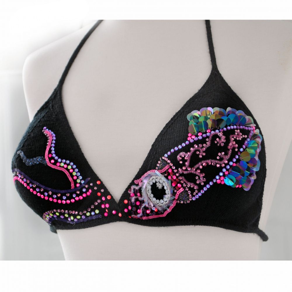 Где как не в темных глубинах океана открываются новые грани сияния? Глубоководные обитатели еще далеко не все изучены, а сколько еще их предстоит открыть? Сколько завораживающе мерцающих неоновых чудищ сейчас охотится и таится в глубинах мирового океана... Именно такими образами вдохновлялась я, когда нащупывала идеи для конкурсной работы: черная глубина океана и игра неоновых огней ее обитателей. Так пришёл образ кальмара, а в качестве носителя изображения решила использовать раздельный черный купальный костюм. Его для меня связала моя мама.