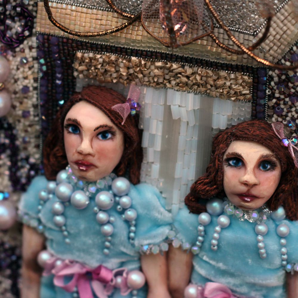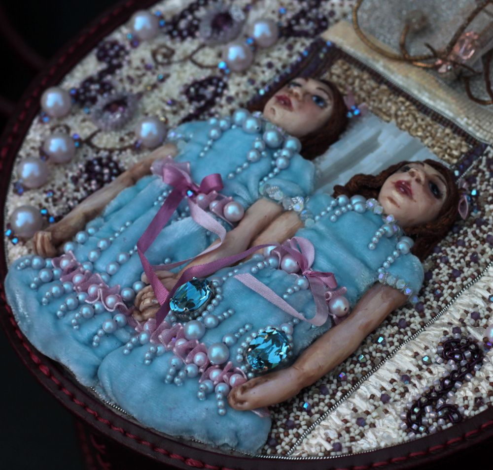 Лепка из полимерной глины и роспись – авторские, девочки полностью объемные, так же объемная люстра над ними. Использованы: вышивка канителью и трунцалом, объем с помощью шелкового бархата, ленты, вышивка рафией, гладью хлопковыми нитками, французскими узелками металлизированными нитями, пайетки, множество видов бисера и стекляруса, в том числе антикварные.