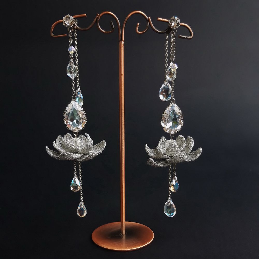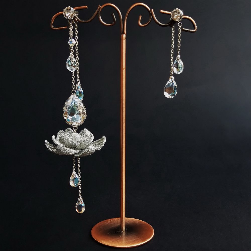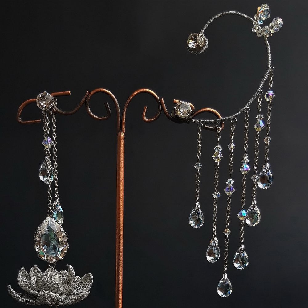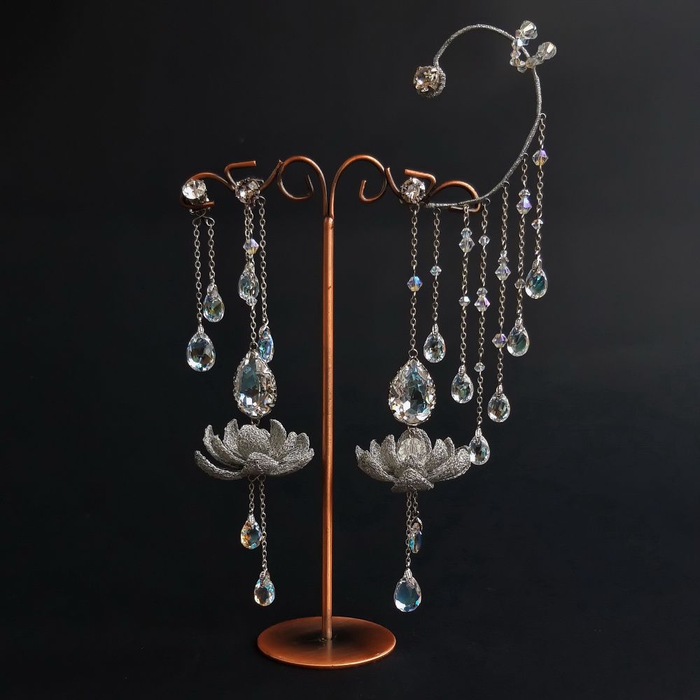Крупные кристаллы-капли с эффектом Ignite хотелось оставить максимально открытыми, поэтому вправила их в спаянную самодельную оправу из безель-проволоки. Основные серьги с лотосами комбинируются с серьгой-каффом, маленькой серьгой-пуссетом и декоративными заглушками