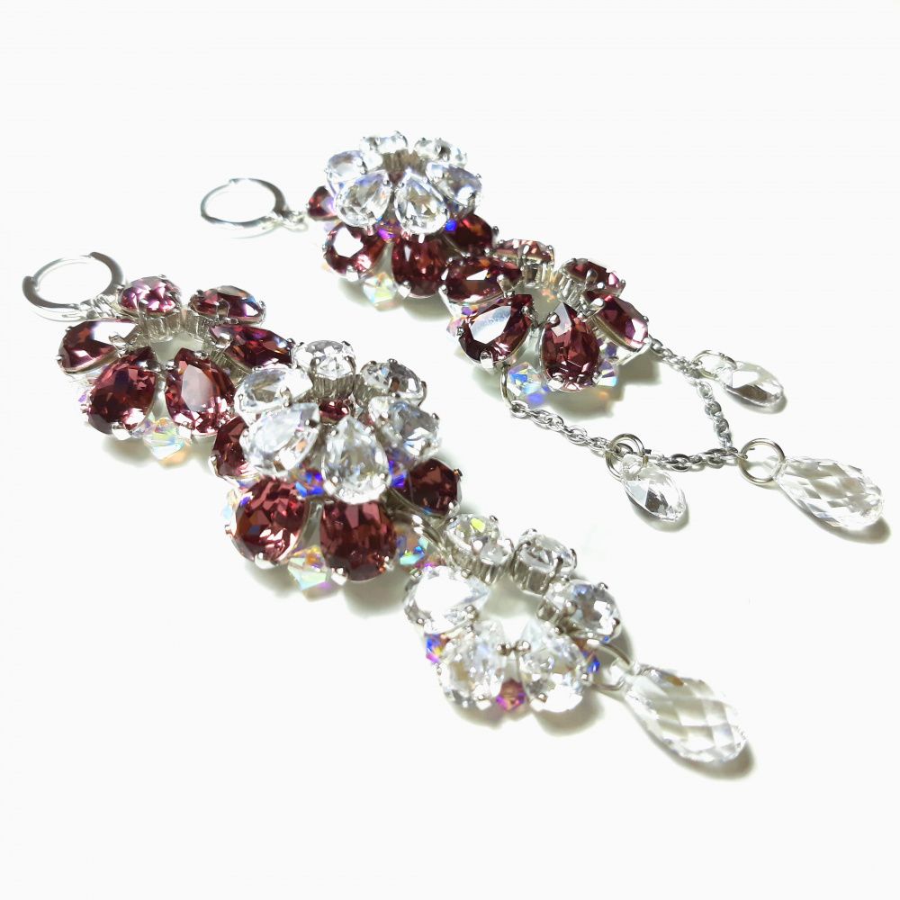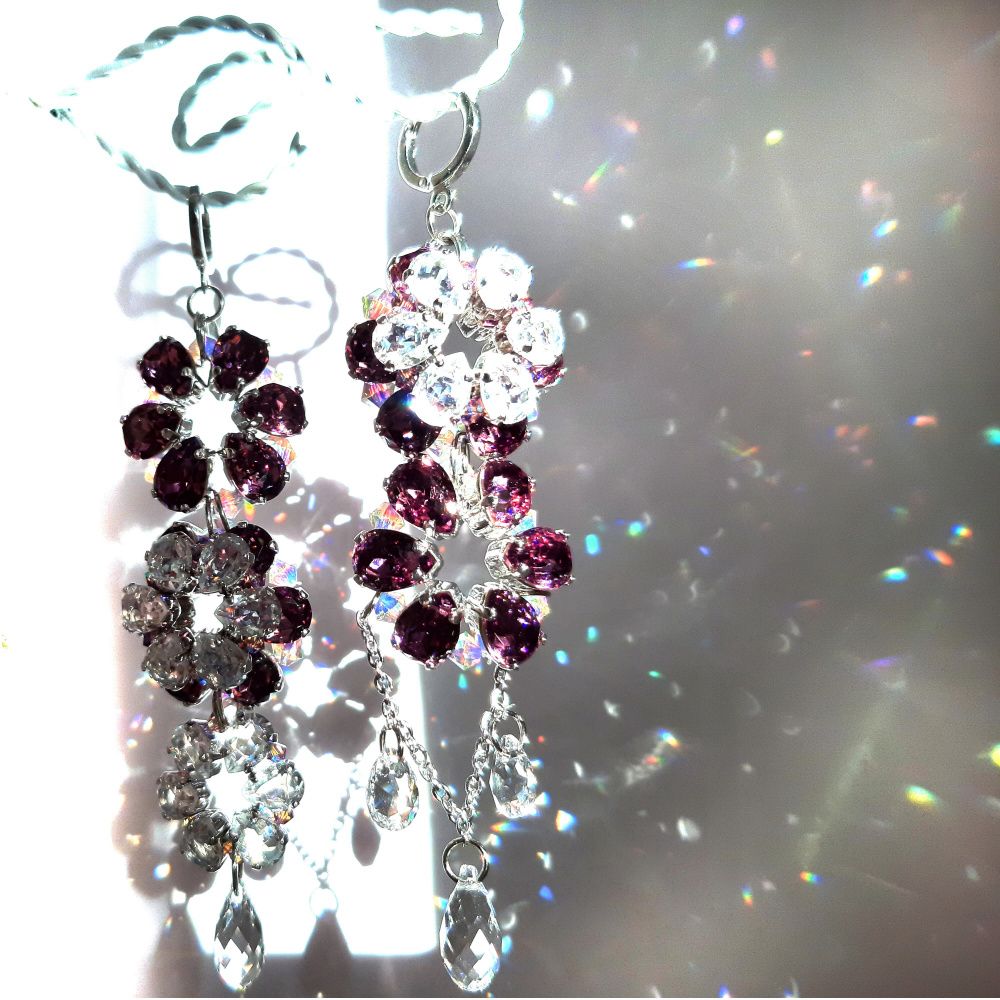 Сияющие ассиметричные серьги олицетворяют новую современную девушку блистающую в любой ситуации. На выпускном вечере или просто в кафе - она точно не останется незамеченной. На принцессе может быть кружевное платье или кожаная косуха, но надевая эти серьги она будет уверена - настало время сиять. Основная задача это тренда показать хрустальные кружева в различных вариациях, дополненные мелкими металлическими деталями. Это новая готическая романтика, которая появляется на улицах наших городов. Завораживающий цвет iris в форме капли выступает здесь основным кристаллом, а белые кристаллы с эффектом ignite, которые использованы в многослойной композиции подчеркивают магическую красоту iris и пропускают его свет и оттенок. Биконусы с эффектом AB 2x дополняют здесь остальные кристаллы и зажигают их словно маленькие огоньки.