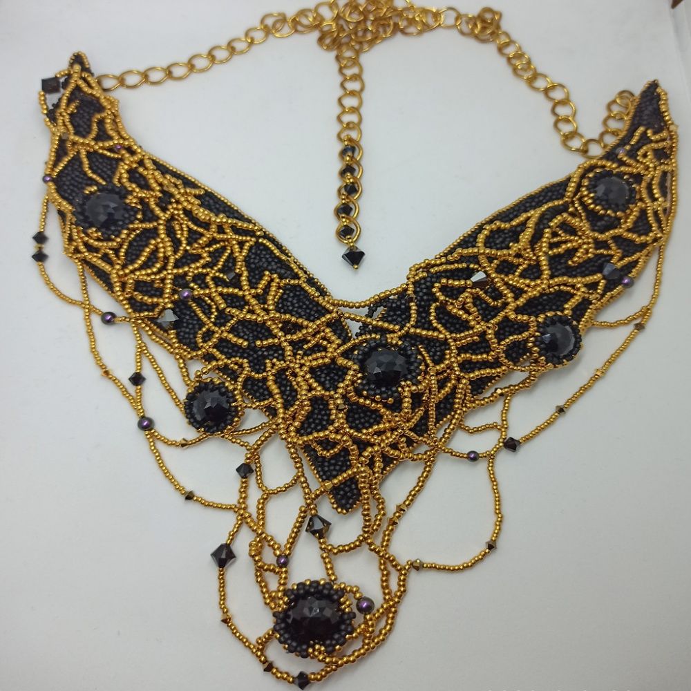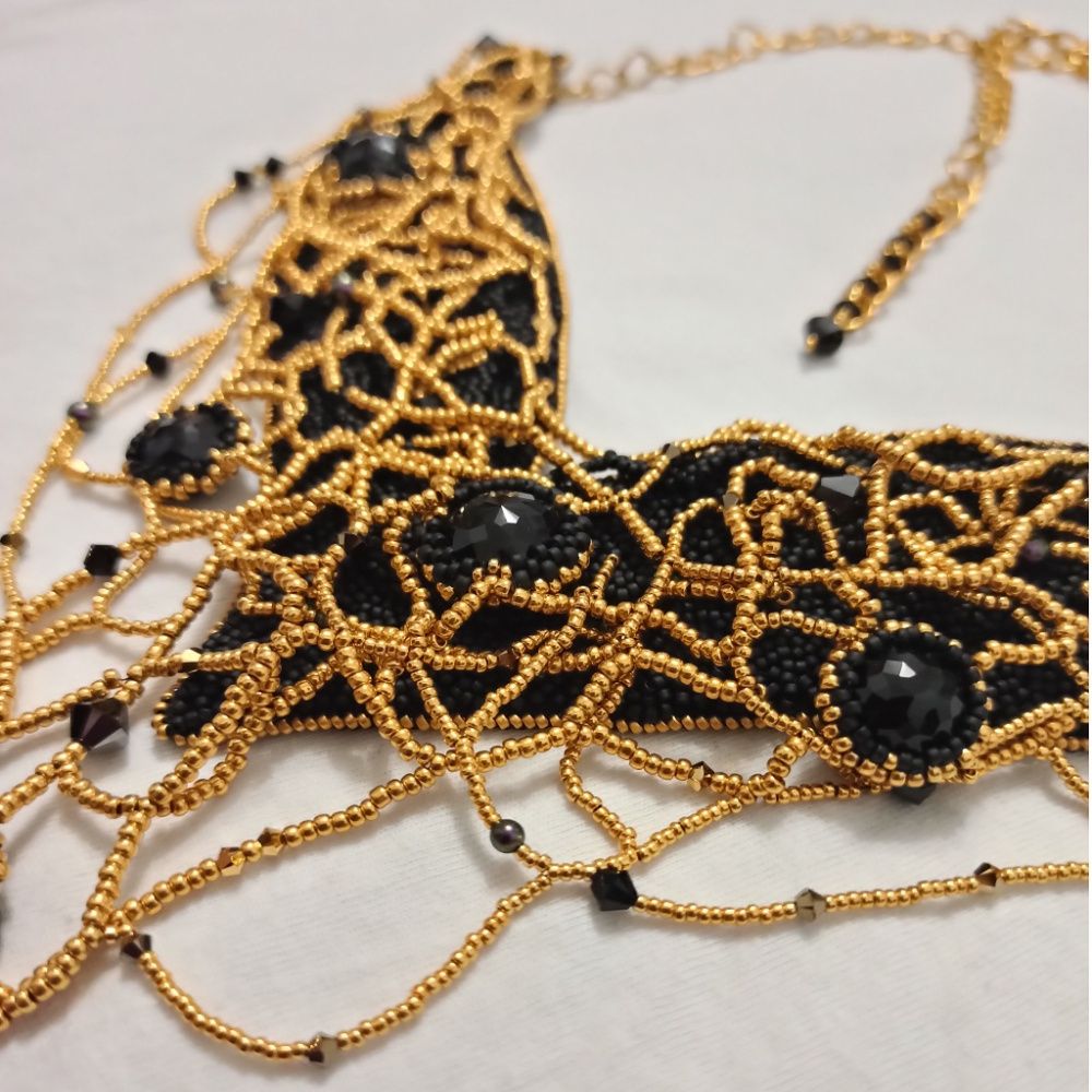 Мы привыкли к потрясающему блеску и сиянию кристаллов Swarovski. Но среди них есть и другие. Как черный бриллиант, кристалл Dome Round Stone цвета Jet, редкий и уникальный образец. Он абсолютно не пропускает свет и не даёт традиционного преломления в гранях, а его блеск исходит только от поверхности. Я выбрала кристалл не за его ослепительное сияние, а за его индивидуальность. Путь в мир драгоценностей черному бриллианту открыл амбициозный дизайнер ювелирных украшений Фаваз Груози, основатель ювелирного дома de Grisogono. А я решила придать огранку черным бриллиантам Swarovski! Этот кристалл приобрел новые грани сияния в блеске благородного золота. И я внутренне выросла, когда работала над этим колье, я хочу еще больше творить, развиваться и выбирать свои черные уникальные бриллианты придавая им огранку и сияние.