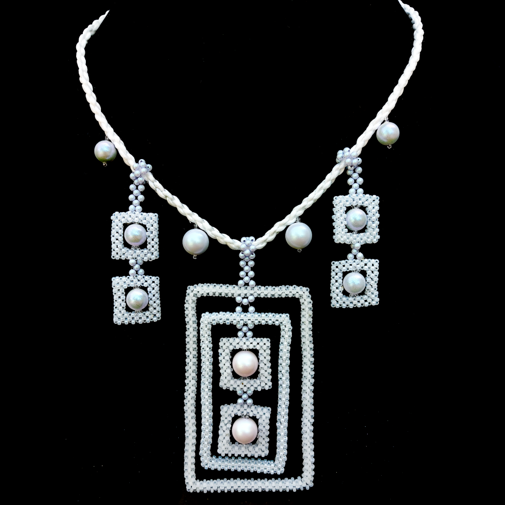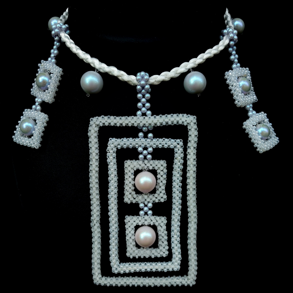 Колье Эскимо — это розовый и голубой жемчуг из новой коллекции Swarovski в прямоугольных рамках из бисера. Лаконичное украшение в котором можно "и в пир, и в мир".