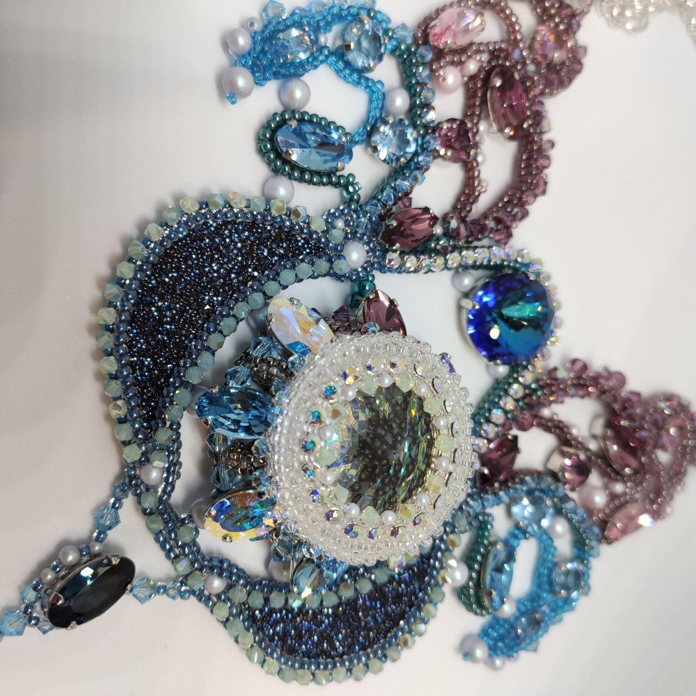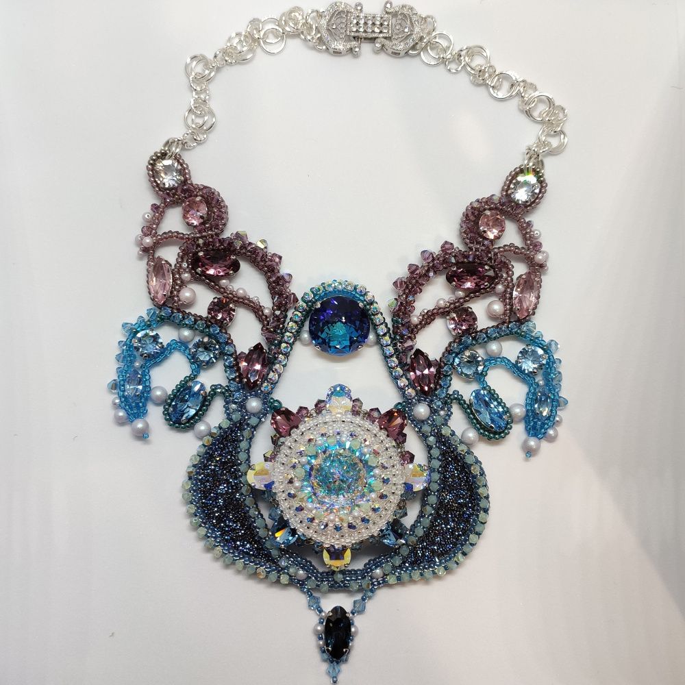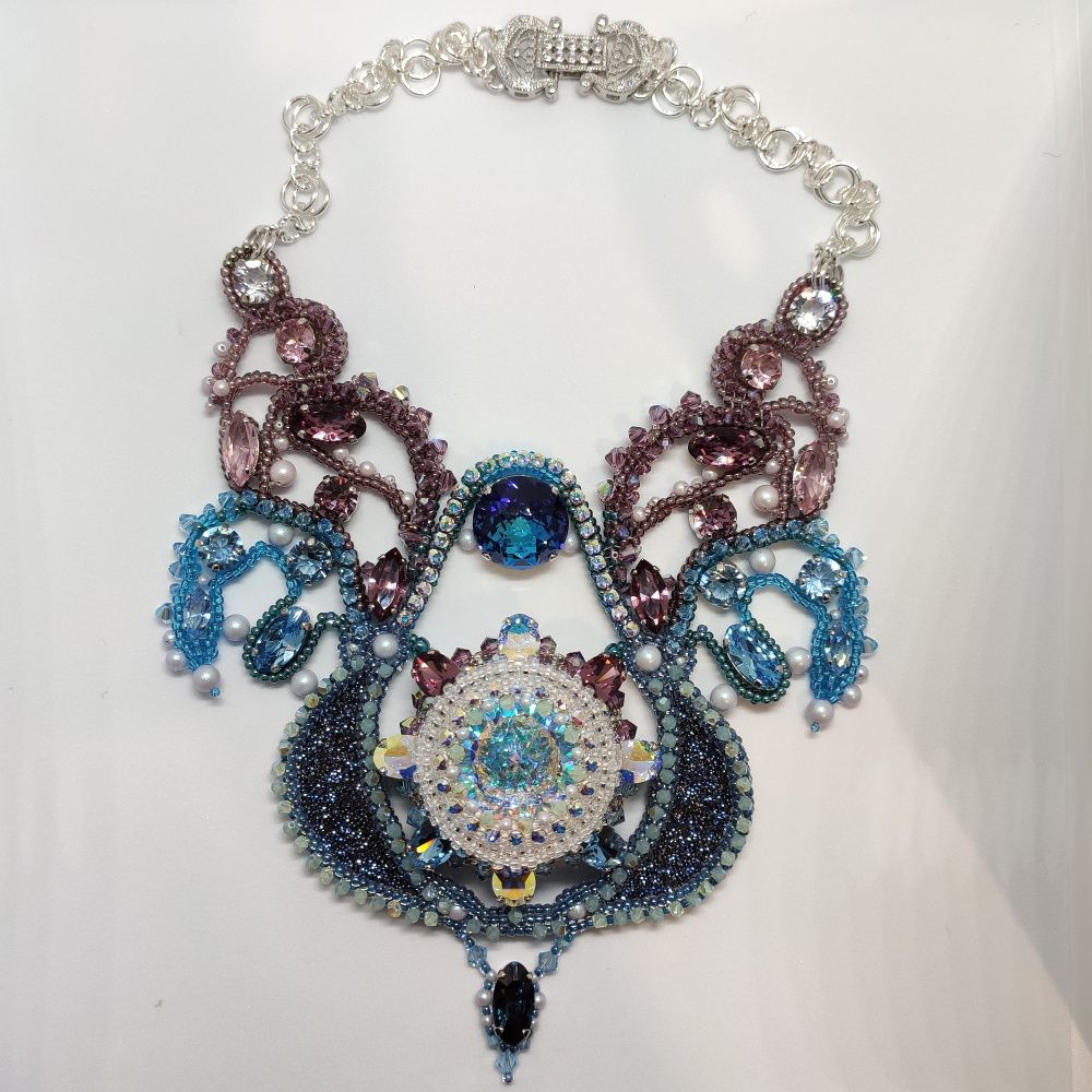 Колье выполнено в технике плетения ндебеле. Основным элементов в колье является кристалл Dome Crystal AB в размере 18 мм из коллекции «Время сиять». Невероятное количество граней дает ему особое свечение. Кристалл без фольгированного покрытия создает эффект призмы и Dome открывается для нас своими «новыми гранями сияния». В динамике элемент напоминает фейерверк (так появилось название конкурсной работы). Остальные элементы дополняют центральную часть, напоминая нам о падающих искрах фейерверков. Темные элементы украшения символизируют ночное небо, благодаря которому мы можем наблюдать всю красоту фейерверка. Конкурс посвящен 125-летию Swarovski, а праздник без фейерверка не праздник.