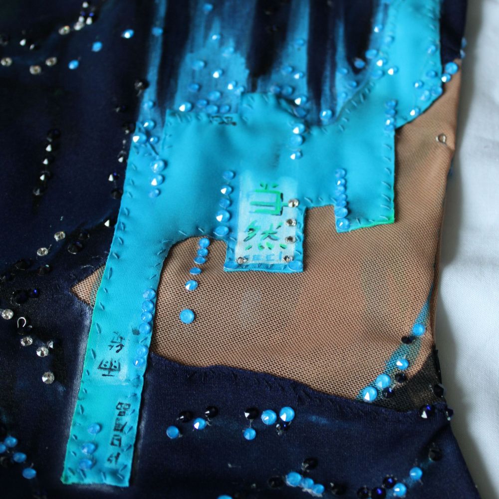 Вдохновленный кинокартиной «Бегущий по лезвию 2049» костюм стремится передать чарующее и футуристическое сияние ночного города, его ярких рекламных экранов и подсветки. Все слоганы на купальнике написаны на китайском языке. Для передачи буйства цвета неспящего мегаполиса использовались стразы линейки electric в цветах blue и green.