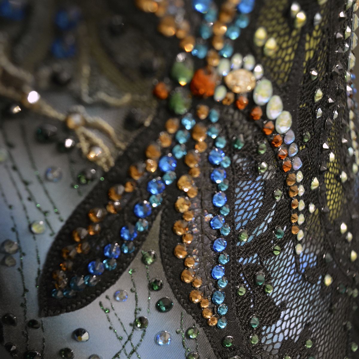 Хотелось и обыграть цветовым сочетанием, и использованием различных материалов- шифона, гипюра, бархата, кружева... Ну, и конечно же - много страз!
