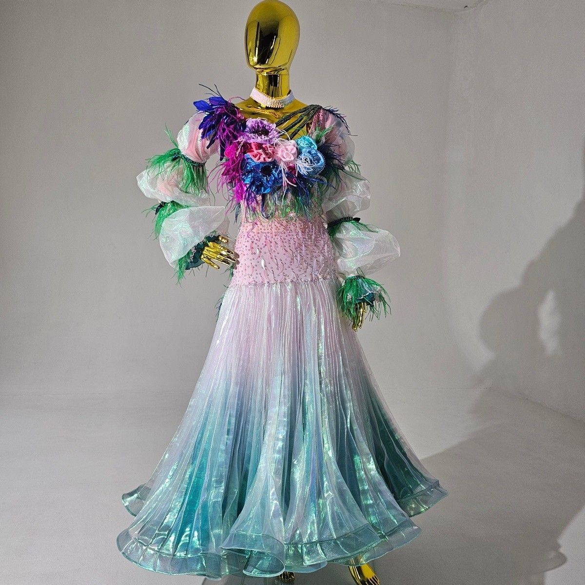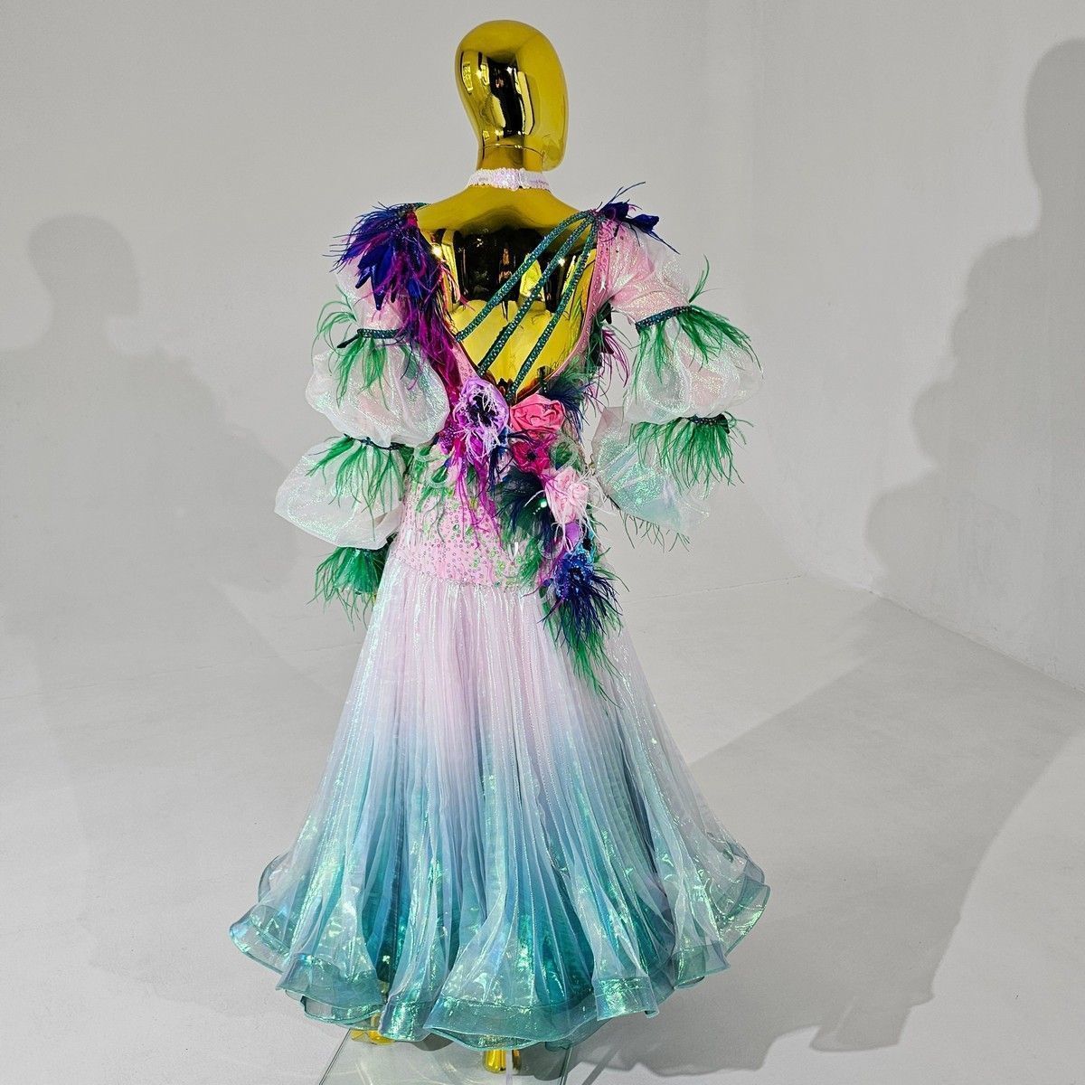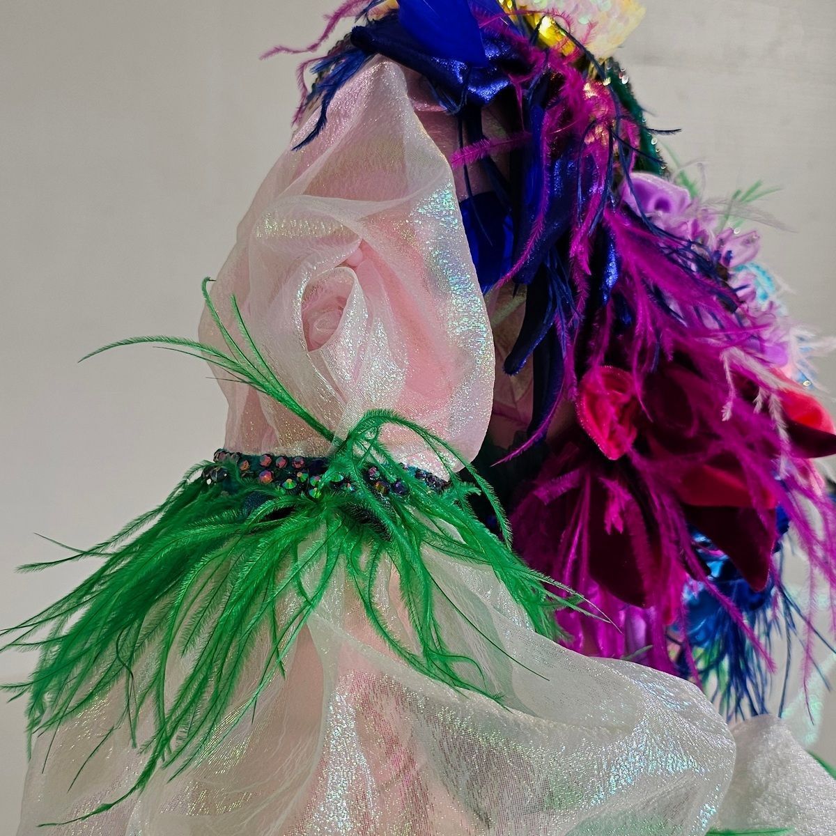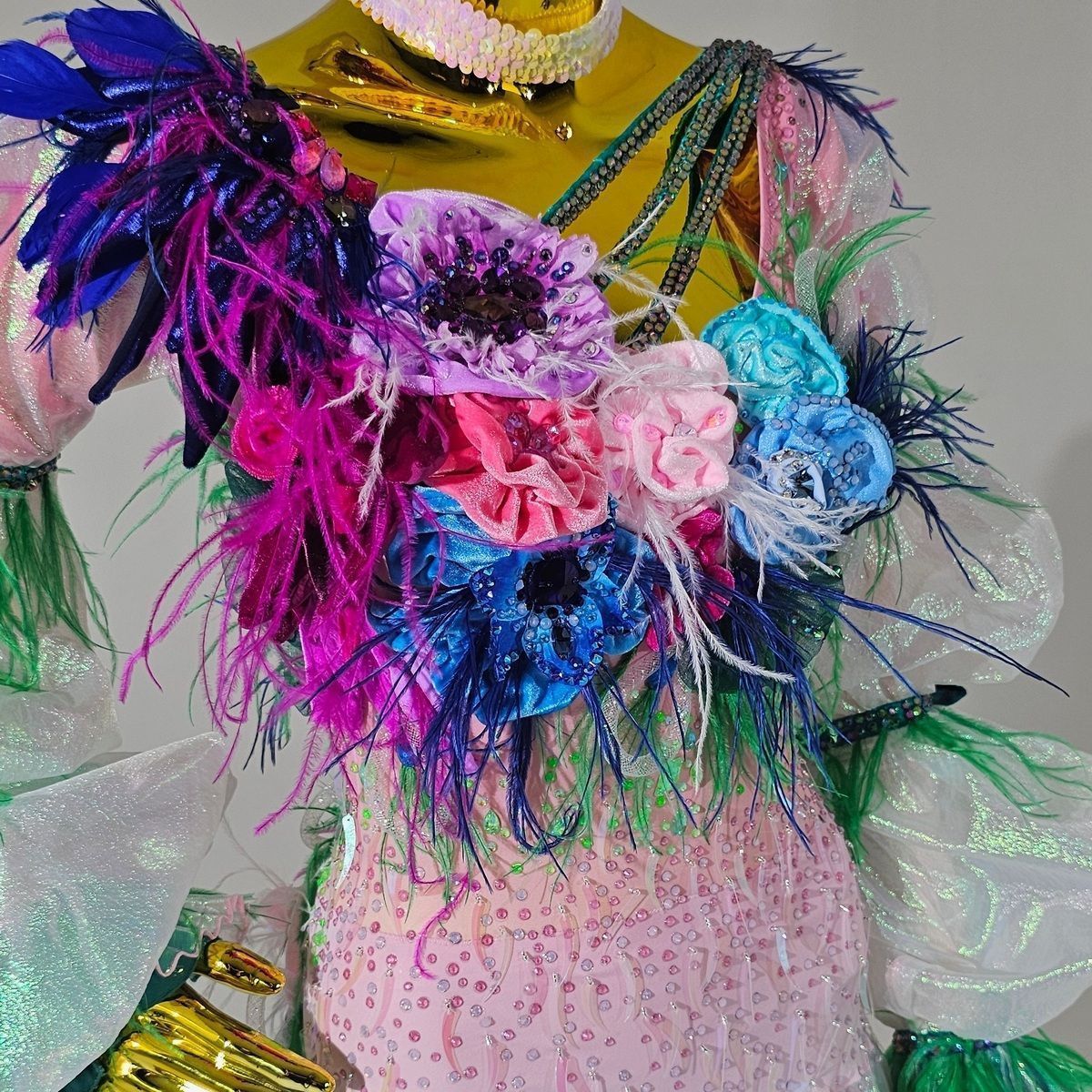 Создавая платье Лесной Девы, я старалась использовать необычные материалы с неземным отливом и свечением – градиенты, органзу. Рукава скроены в виде буфов из роз, а трава выполнена из страусиных перьев, собранных в пучки. Стразы с неоновым эффектом усилили «эльфийское» свечение наряда.