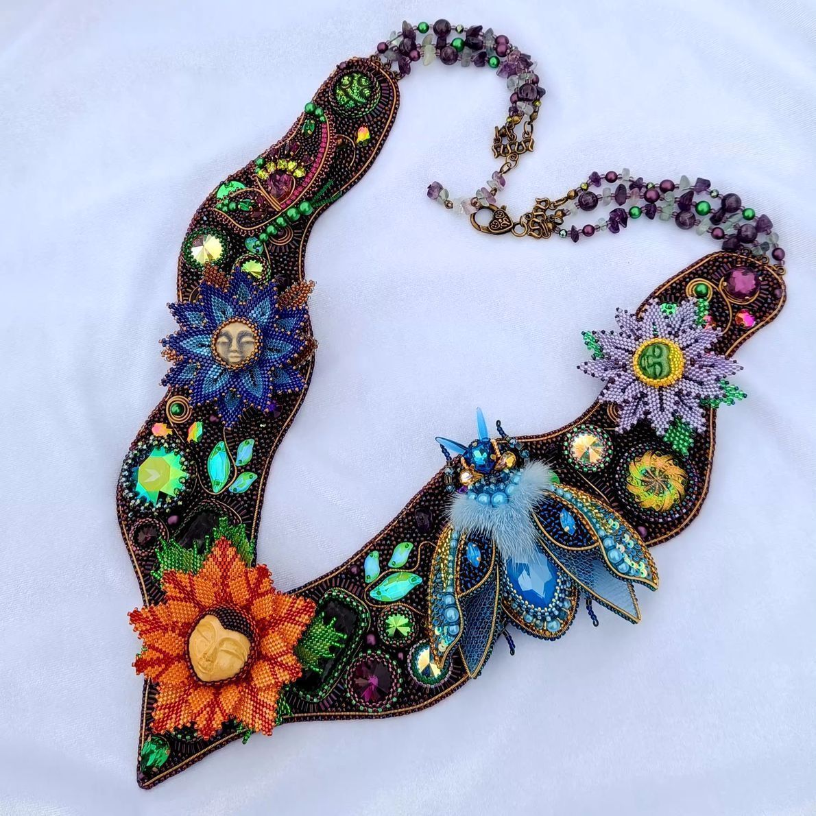 Аметистово-зеленая основа с растительным узором расшита кристаллами, флюоритами, аметистами, богемскими пуговками и бусинами лэмпворк. Это благородный и дорогой сад камней, богатство которого в материалах, формах, глубине цвета.