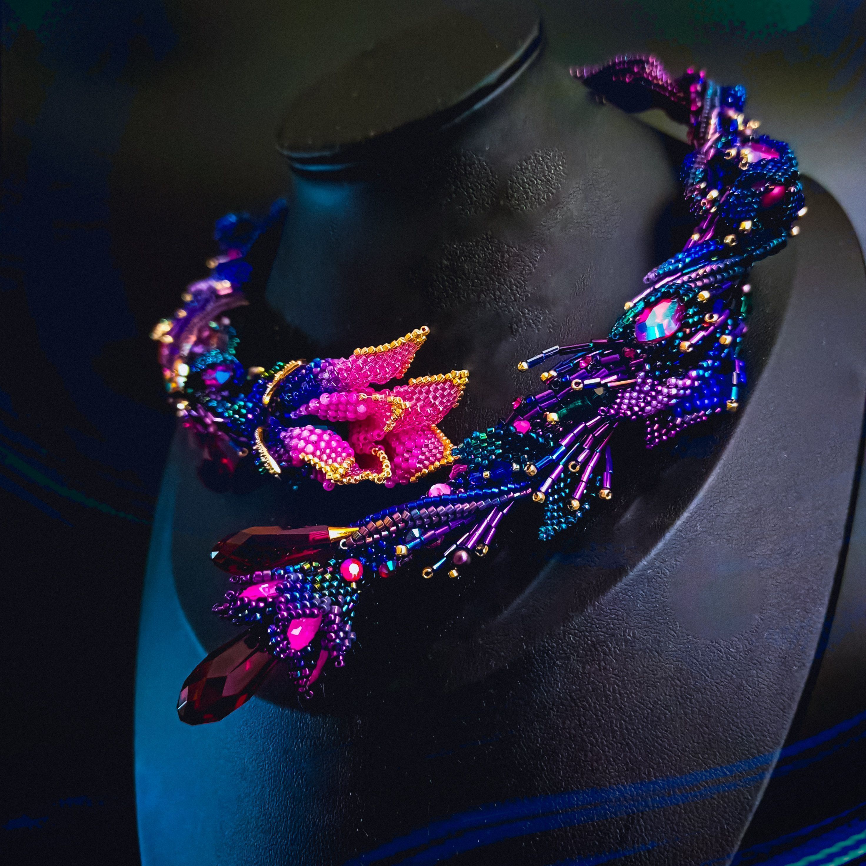 Однажды юная фея-ювелир, очарованная этим зрелищем, решила увековечить танец цветка. Она собрала капли лунного света, нити звездной пыли и росу с лепестков. Ночь за ночью фея плела удивительное ожерелье, вплетая в него грацию и магию танцующего цветка.