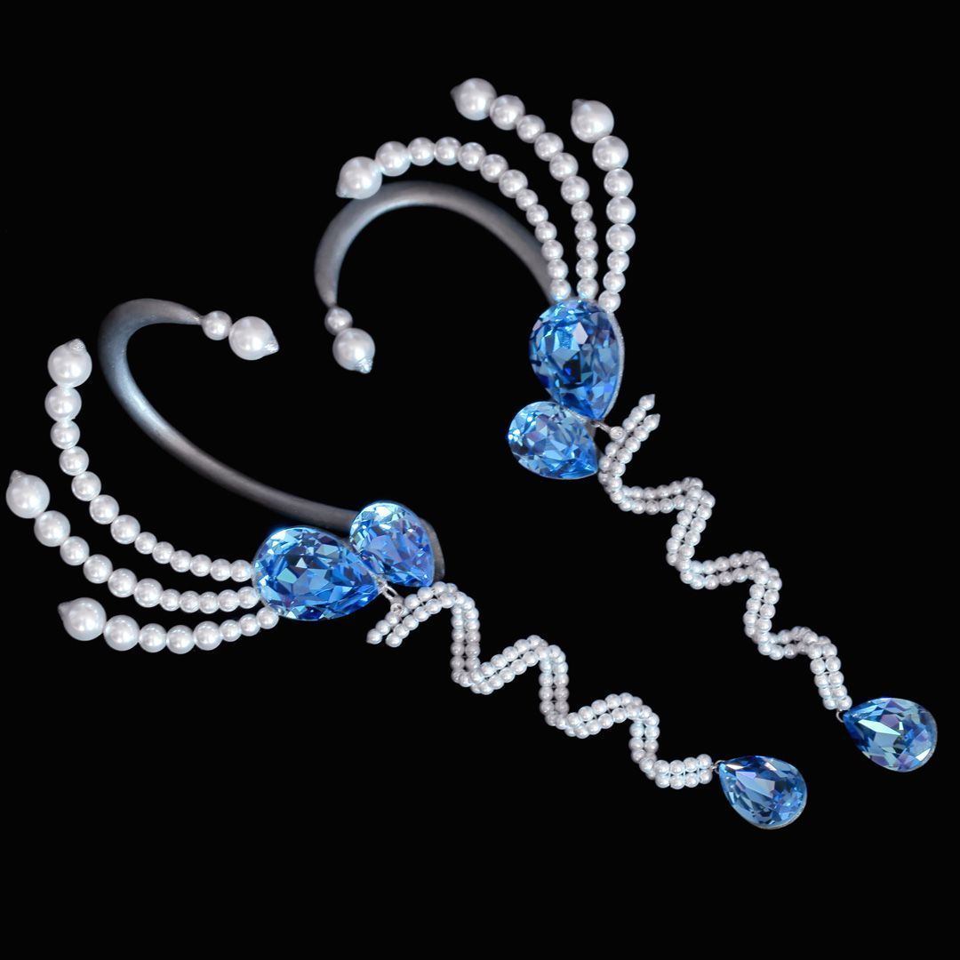 Украшение парное, выполнено в виде кафф. Их конфигурация полностью разработана и создана с нуля собственноручно. Все элементы собраны в единую монолитную структуру, за исключением подвижного подвеса, который добавляет небольшой игривости запечатлённому образу.