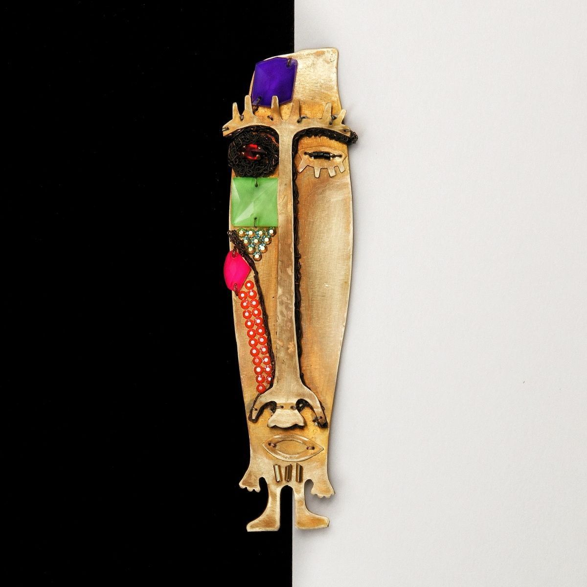 Крупная брошь в виде антропоморфной личины. За основу взяты личины, найденные в Казымском кладе в Сибири в 2014 г. Сокровища клада могут относиться как к периоду Кулайской культуры (быть современниками скифов и сарматов), так и являться материальными свидетельствами существования ранее неизвестного народа на территории Сибири.