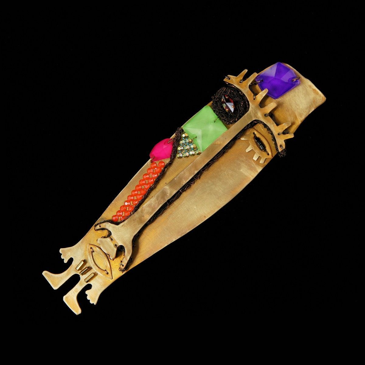 Брошь Anthropomorphicus как бы разделена на 2 части: одна часть приближена к историческому образцу - лаконична и строга, другая часть декорирована кристаллами разных форм и размеров в неоновых ярких цветах - дерзка и вызывающа.