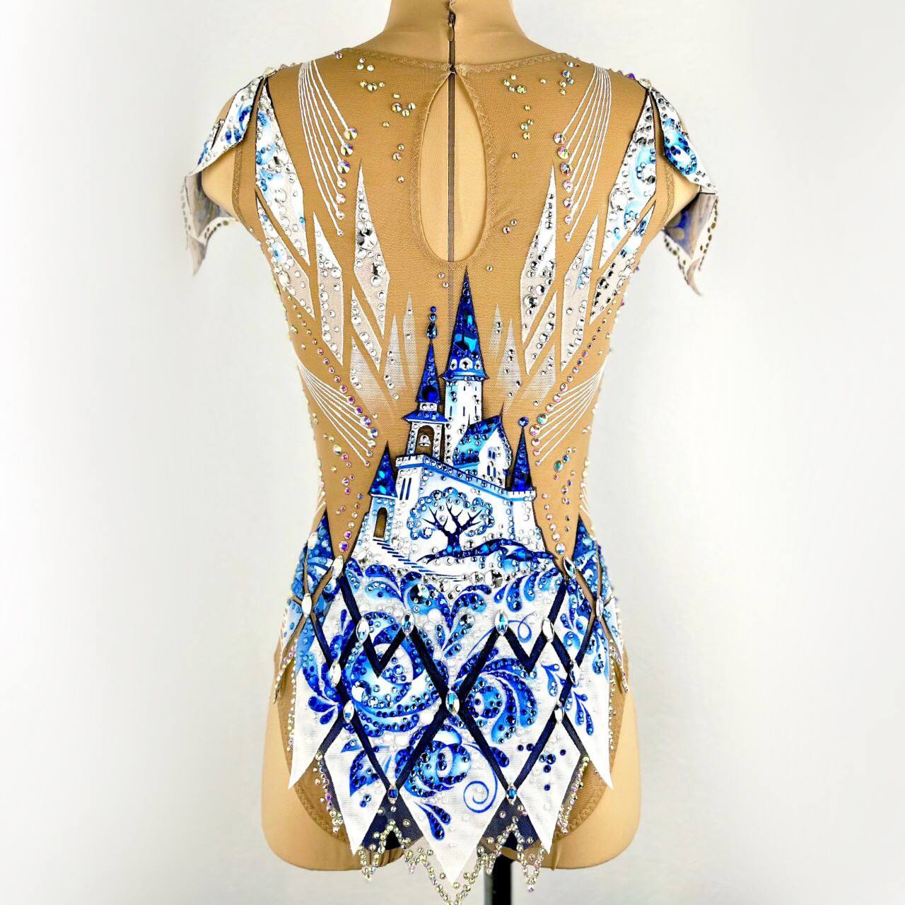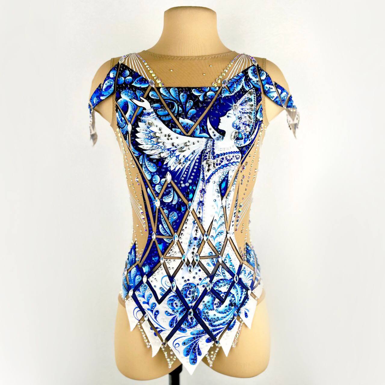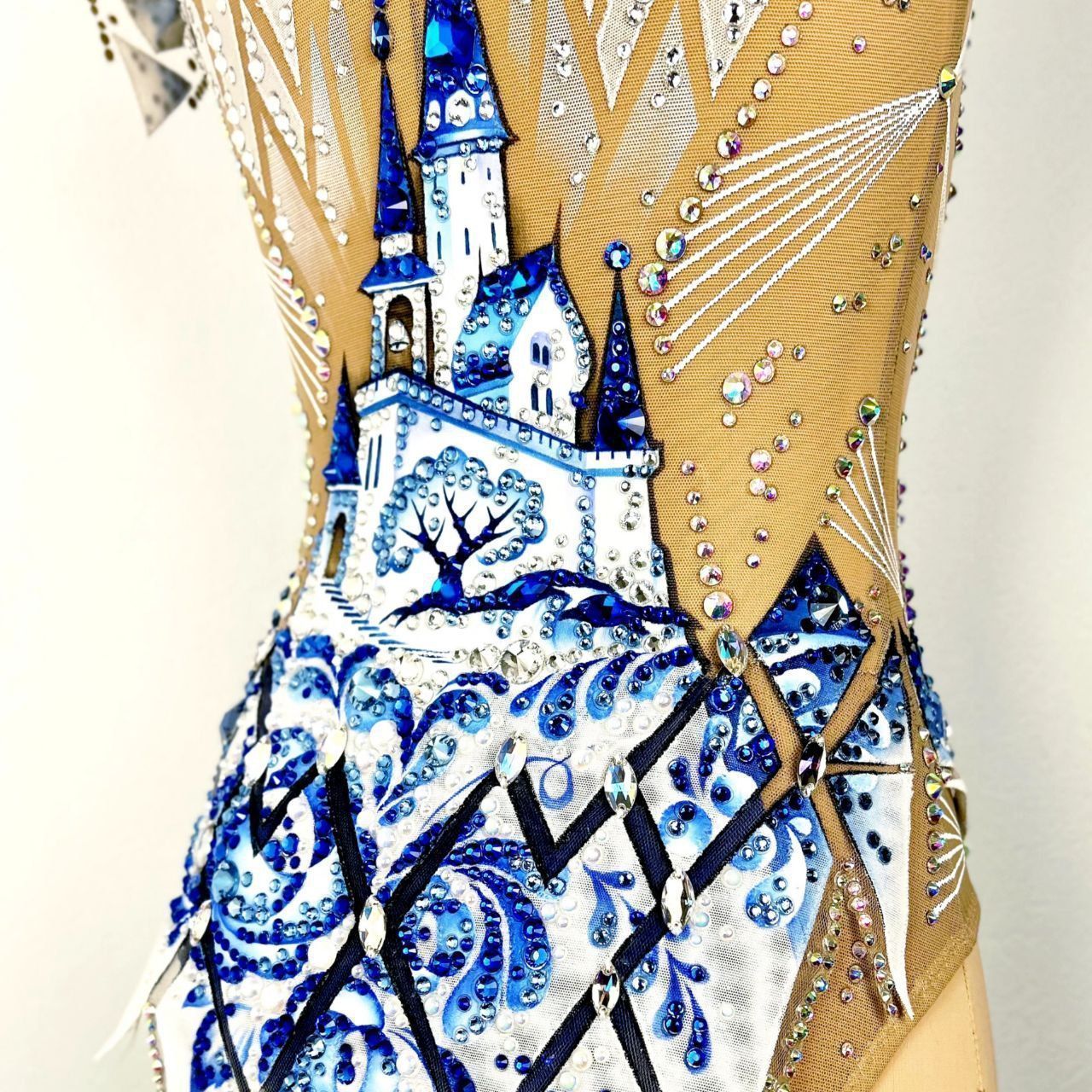 фарфоровая посуда в серванте, искусно расписанная гжелью, белые льняные нити,