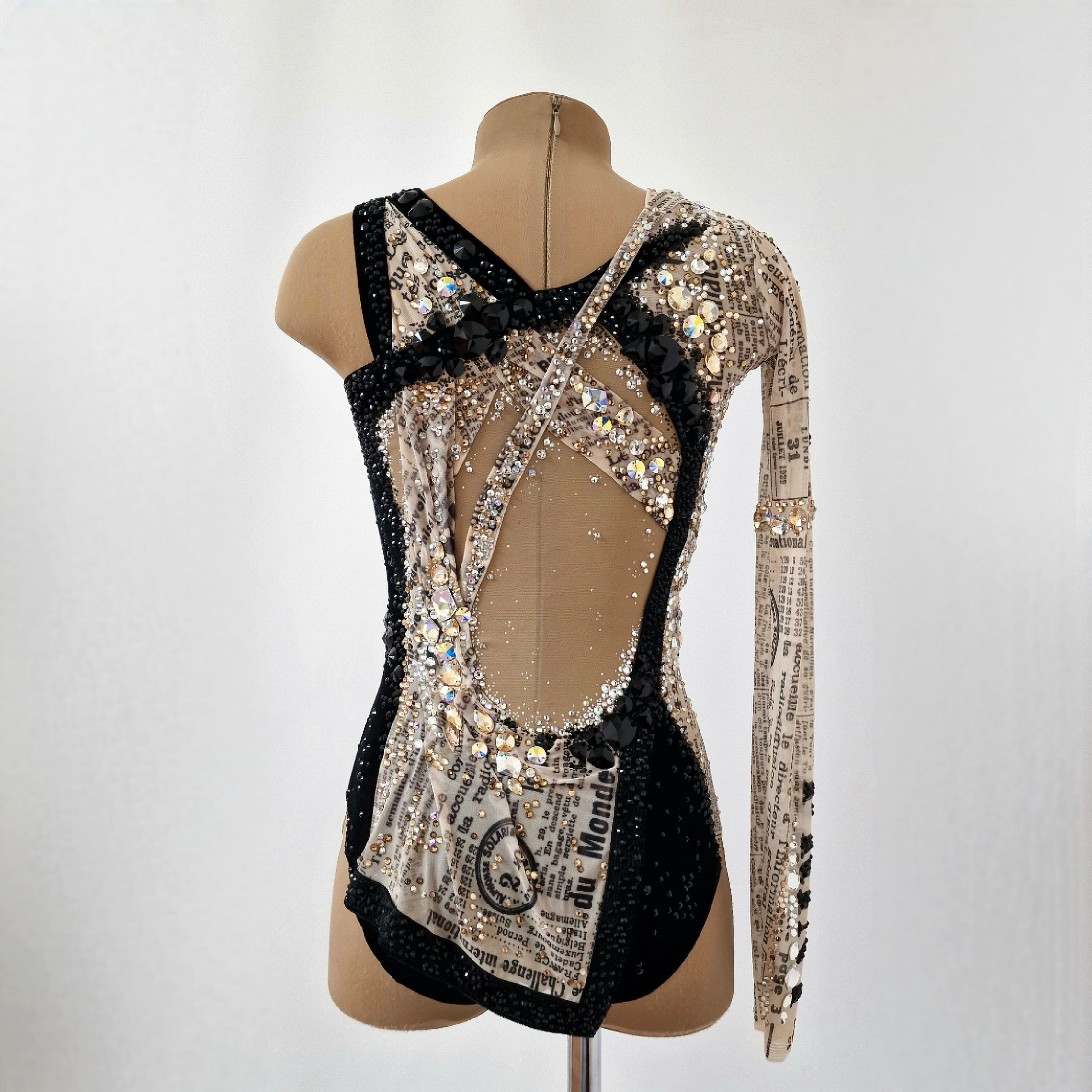 Купальник для художественной гимнастики "Мадемуазель Коко", создан по мотивам маленького чёрного платья - легенды мира моды. Он будто отражает жизнь знаменитой Габриель. С одной стороны - блеск, роскошь и признание, с другой - интриги, зависть и сплетни.