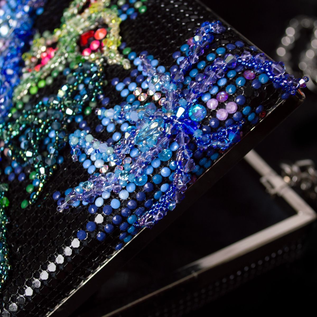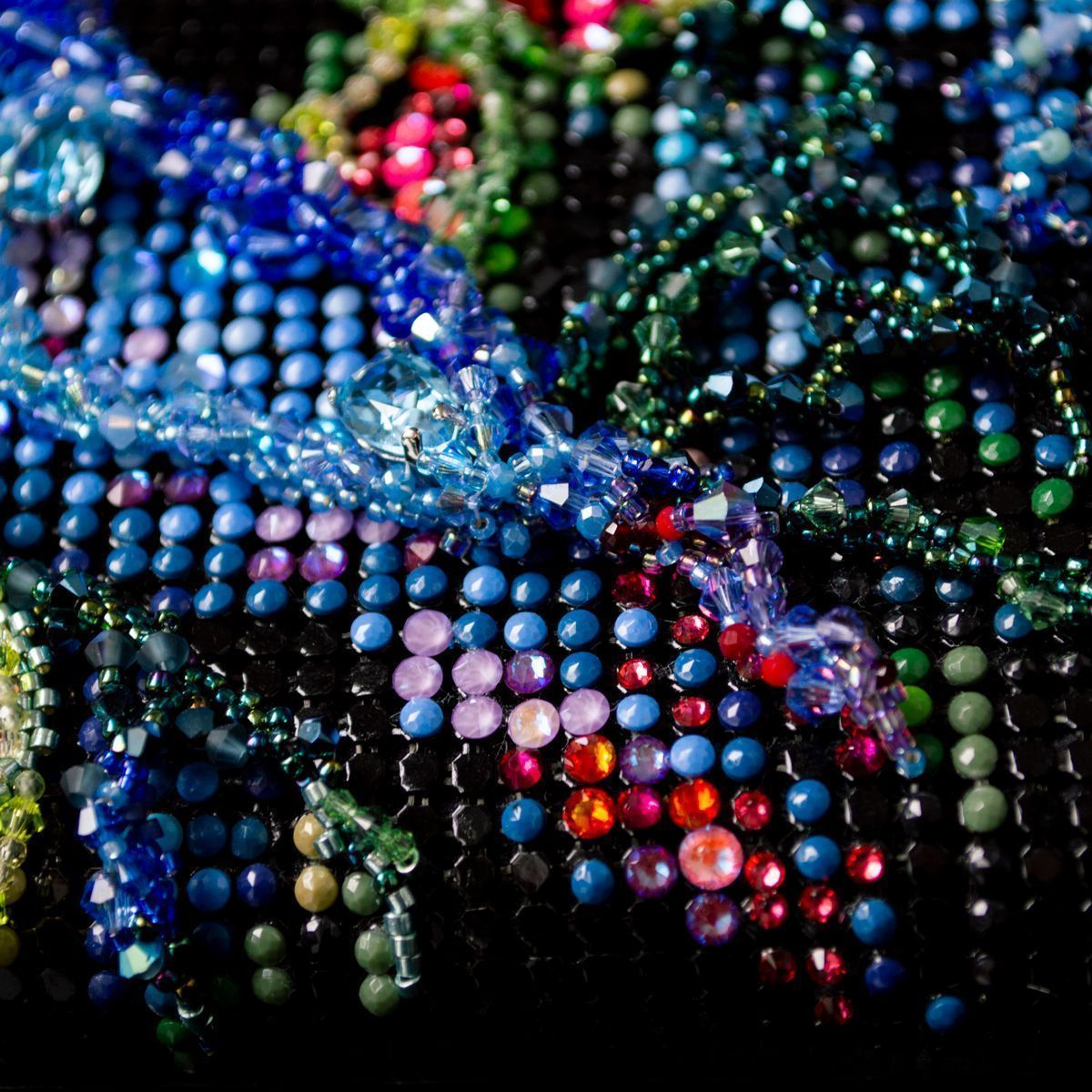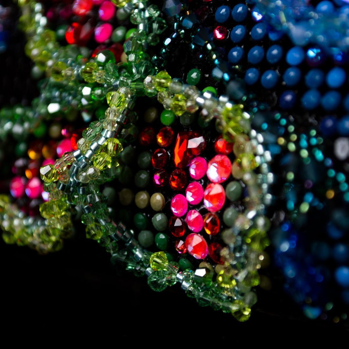 Техники бисероплетения добавляют объема и текстурности. Бисер и бусины, тщательно переплетенные в узоры, создают рельефные элементы подчеркивая роспись, делая её еще более яркой и живой.