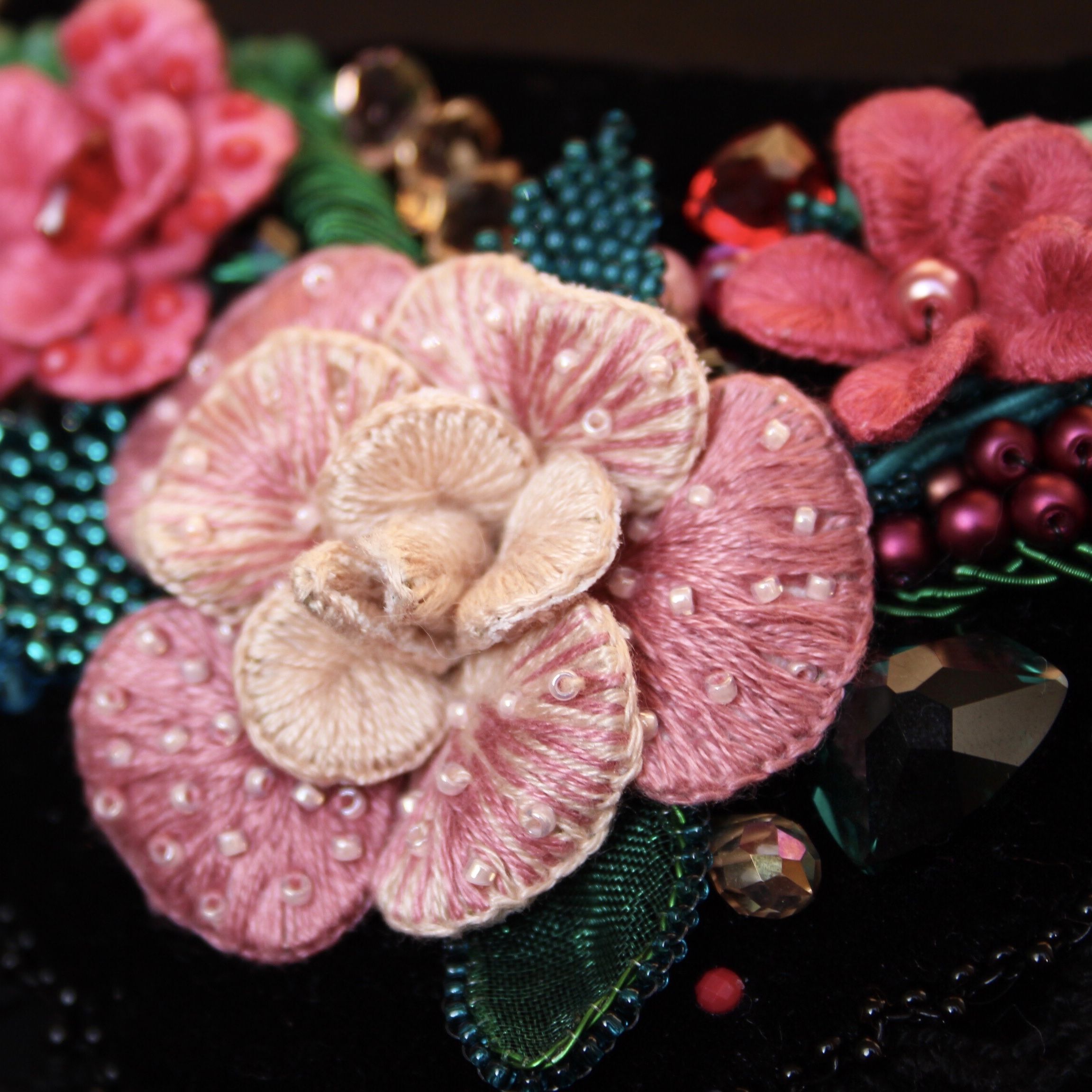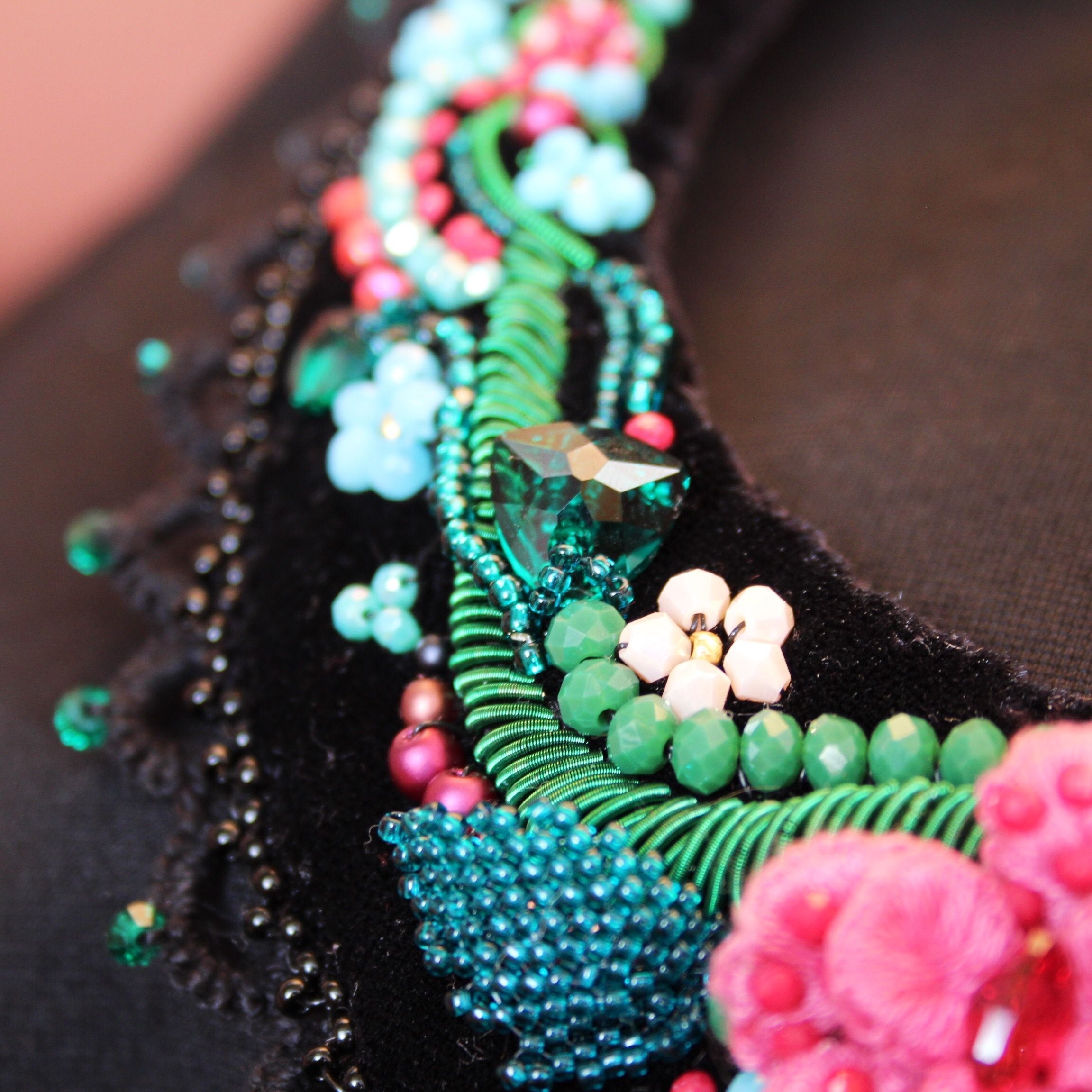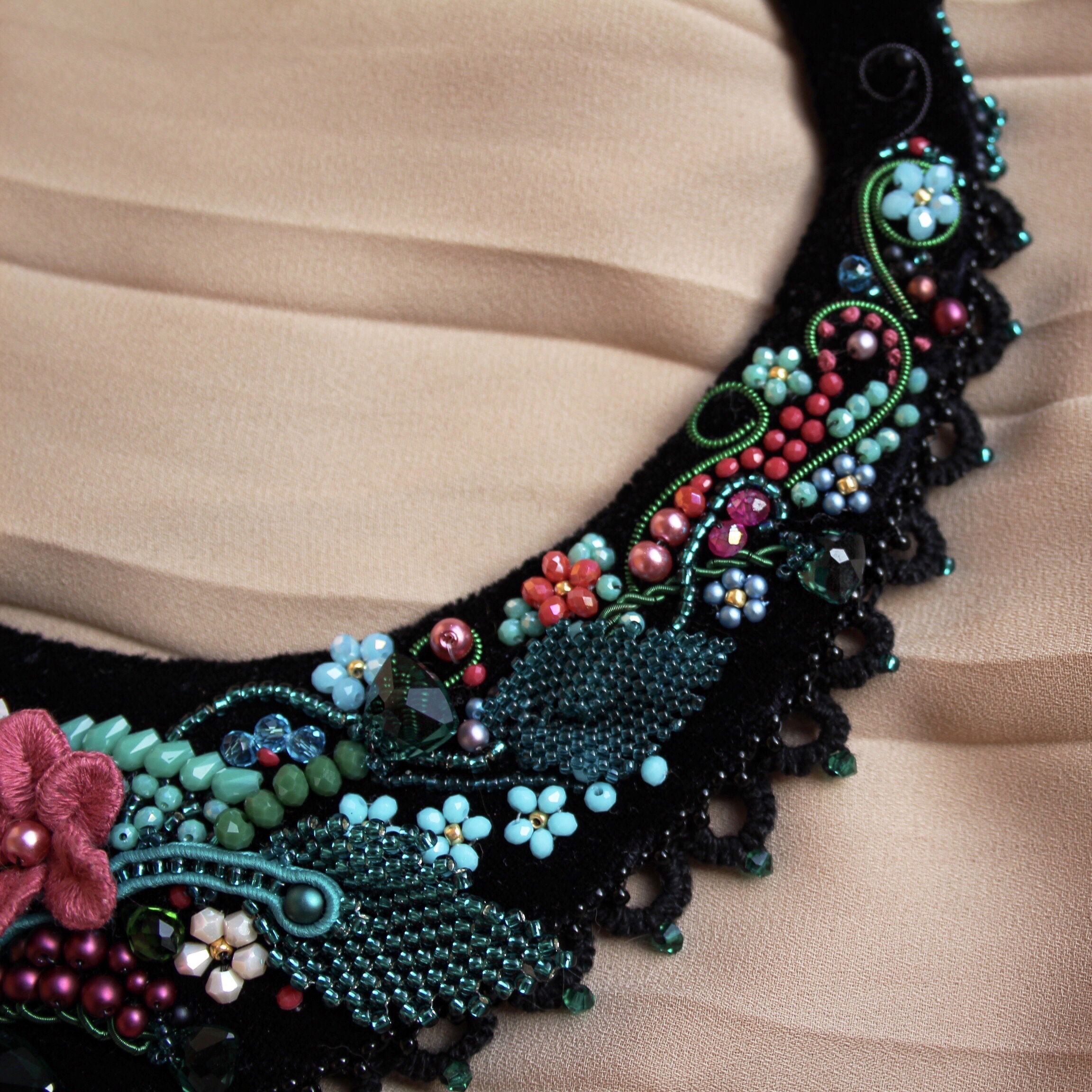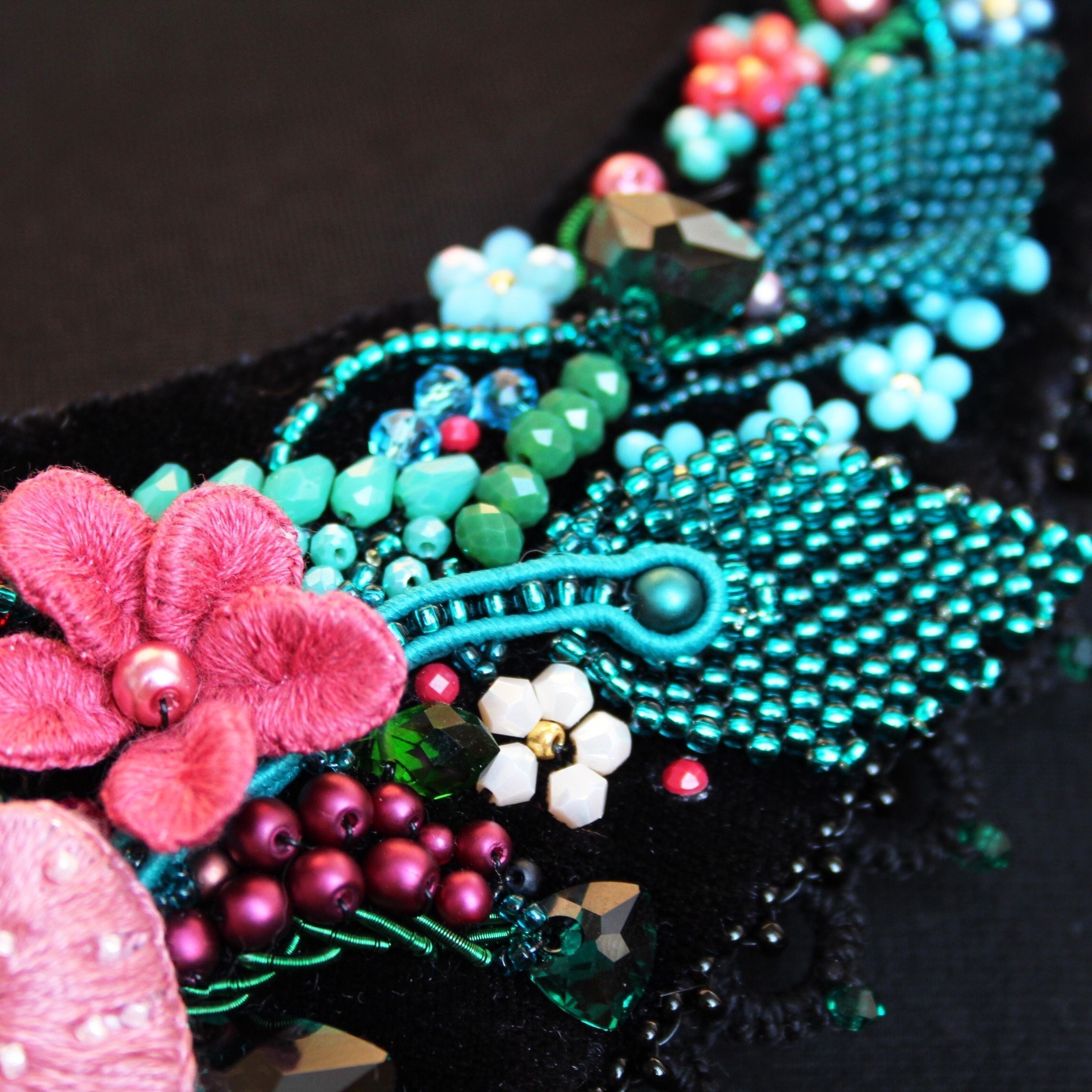 Часто с краю подноса прослеживались золотые узоры, роль которых в моем рукотворном колье выполняет кружево-фриволите, создавая интересный узор, соприкасаясь с кожей. Главные акценты работы – кристаллы триллианты в двух цветах: эмеральд и скарлет – выполняют роль закрытых бутонов и покрытых свеже выпавшей росой листьев. Крупные цветы, расположенные в центре колье, выполнены в технике объемной вышивки, листики – в технике мозаичного плетения, стебли в основном представлены канителью и вышитыми в ряд бусинами.