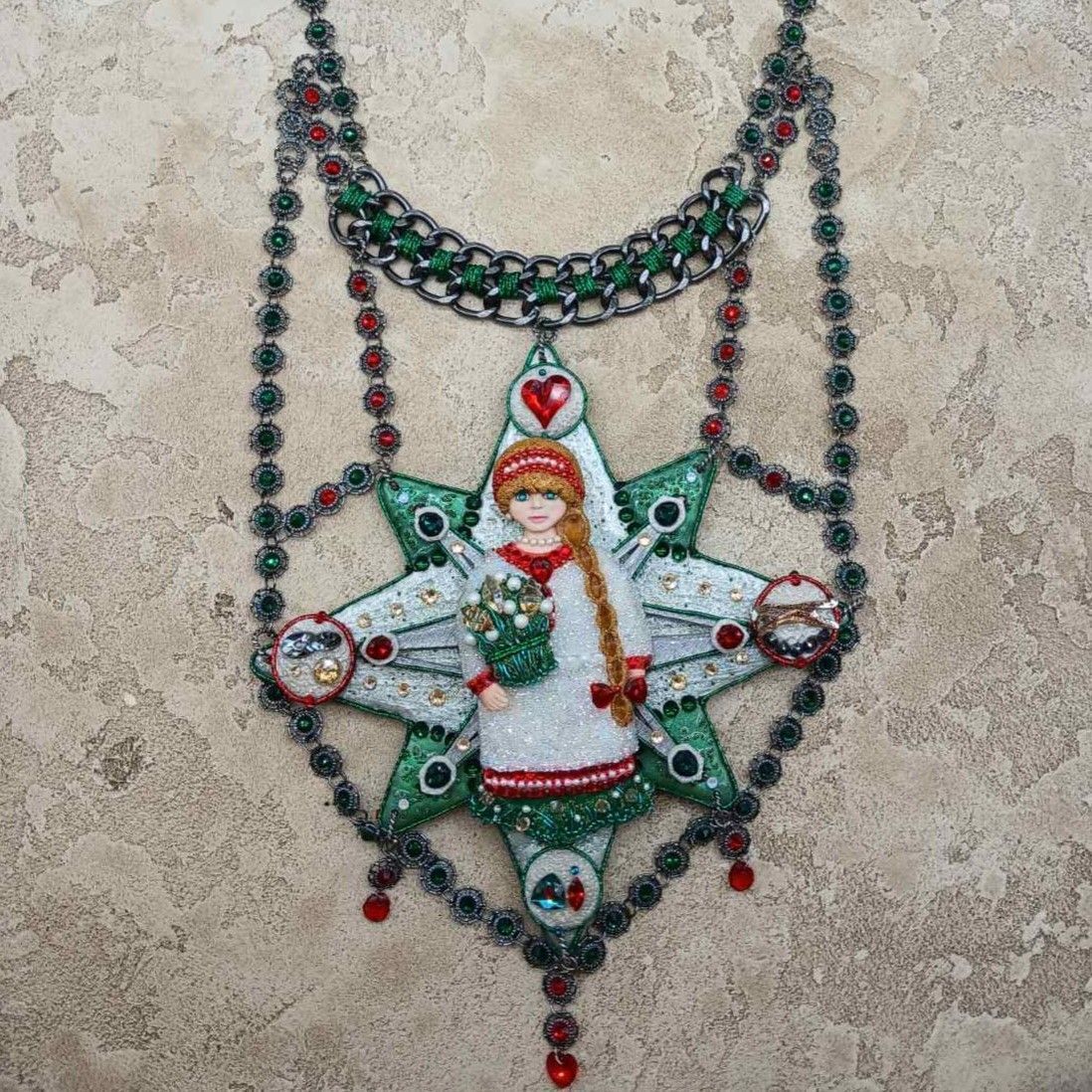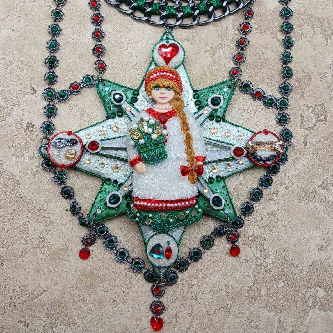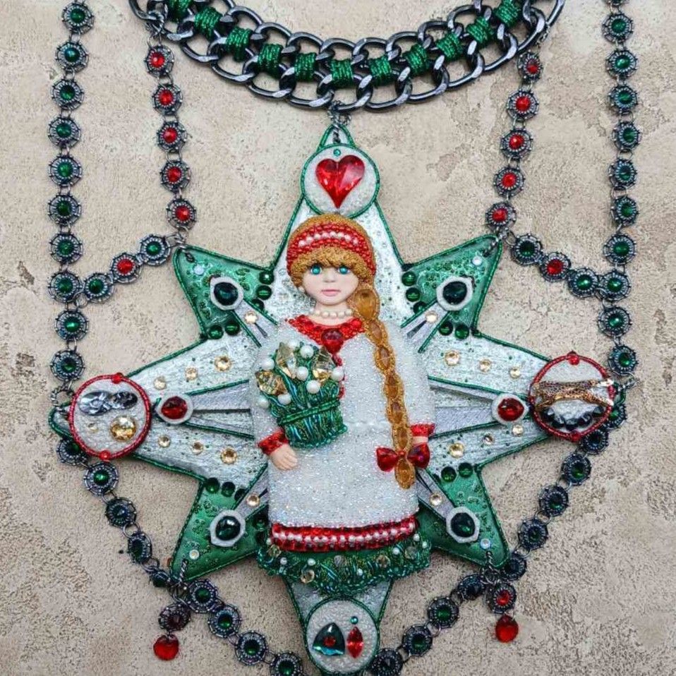 Для участия в конкурсе я создала колье, представляющего собой восьмилучевую звезду – октограмму, которая символизирует гармоничную связь духовного и телесного. Центральным элементом колье является девушка в древнерусском наряде, олицетворяющая почитание традиций и наследия предков. Сзади девушки находятся стрелки компаса, который указывает на возможные варианты будущего: элемент с красным сердцем указывает на безусловную Любовь, элемент со знаком бесконечности – на вечность бытия, элемент с бегущим гепардом – указывает на жизнь в гармонии с природой, ну и последний элемент, располагающийся внизу – представляет собой схематичные буквы AI, обозначающие искусственный интеллект. Любой из данных вариантов будущего возможен, все зависит только от выбора человека здесь и сейчас. В наших силах создать прекрасное будущее, нужно только верить в себя и открыть Любви свое сердце.