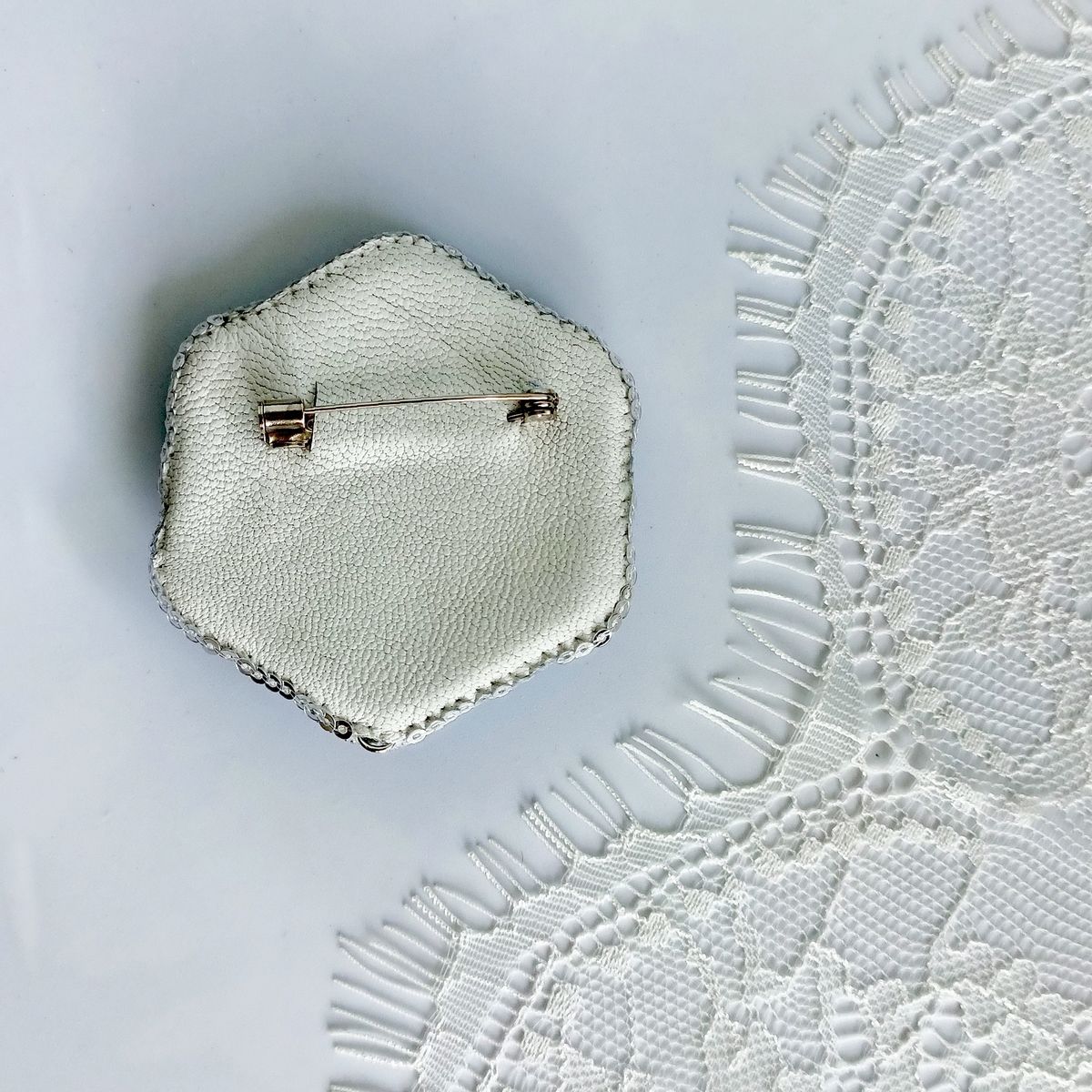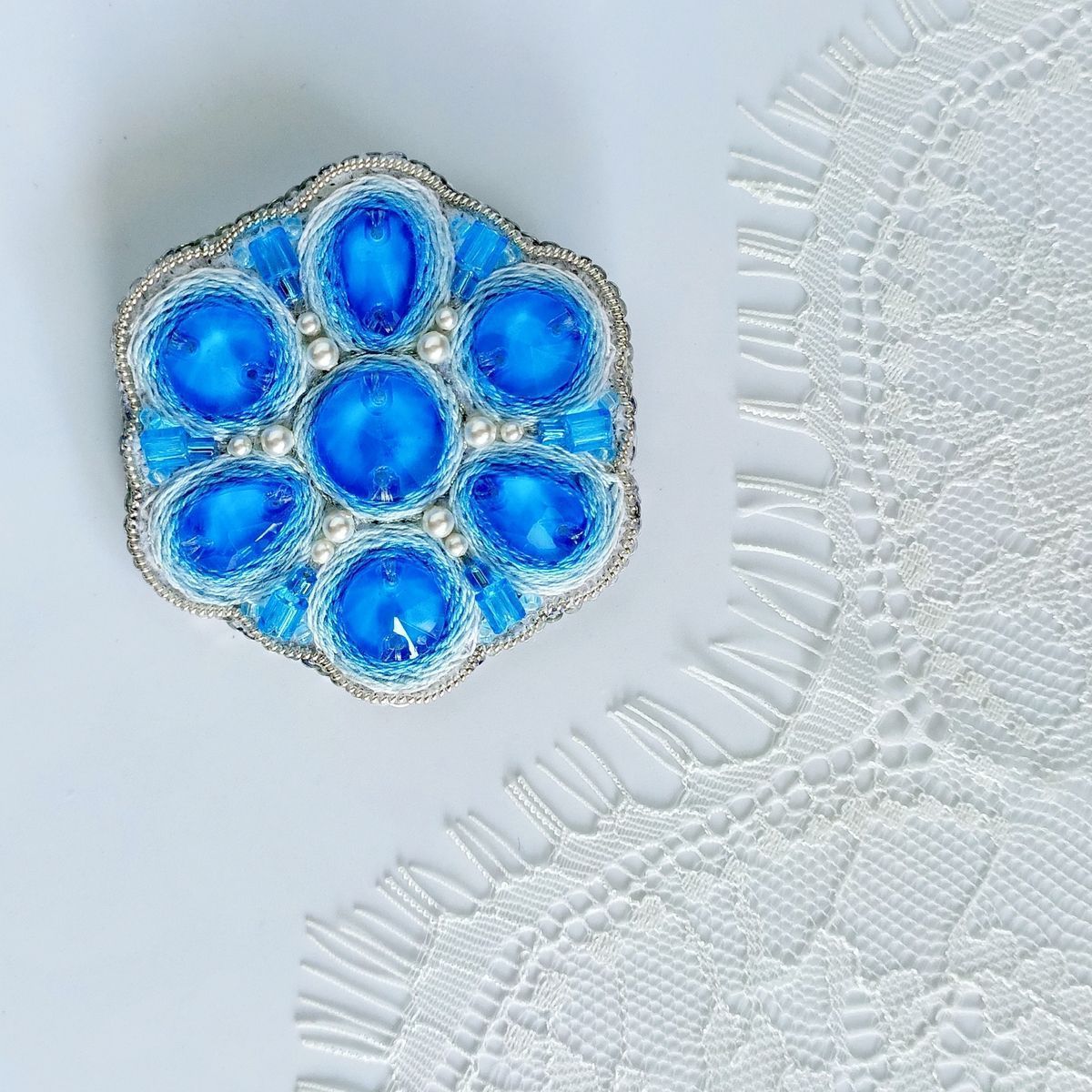 Также при изготовлении броши использованы металлизированные нитки мулине, жемчуг Swarovski двух размеров, цилиндрические бусины и бисер голубого цвета, жёсткая канитель. Изнанка у броши из белой натуральной кожи. На обратной стороне есть небольшое колечко, поэтому изделие можно использовать и в качестве кулона.
