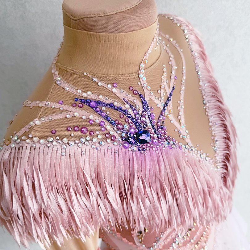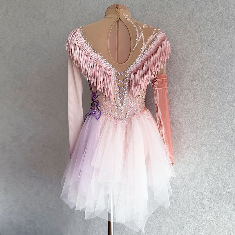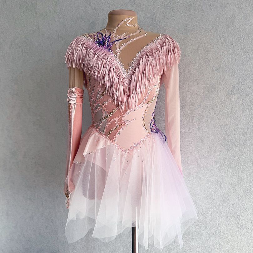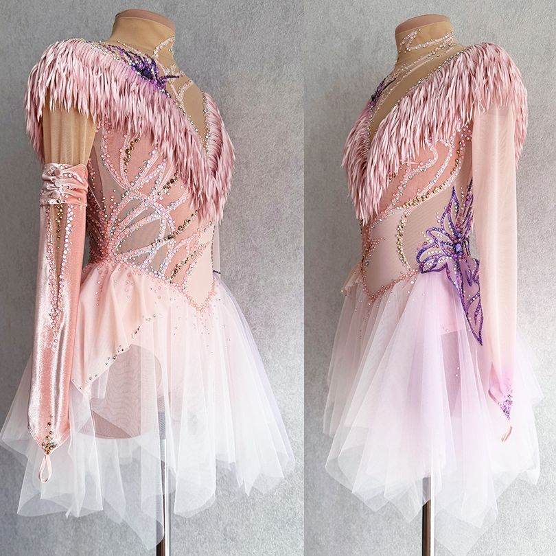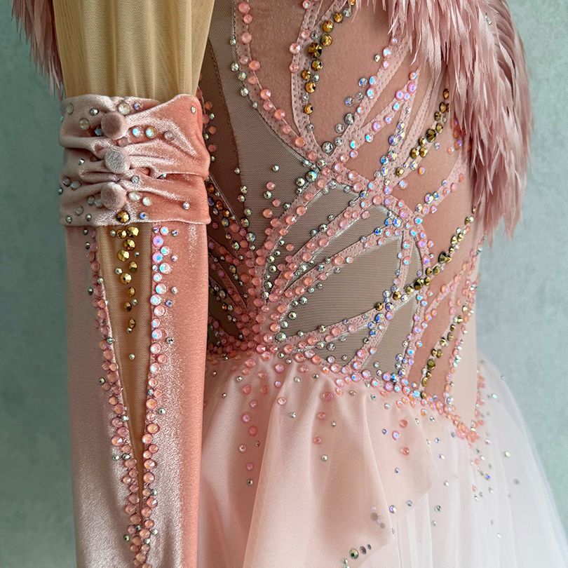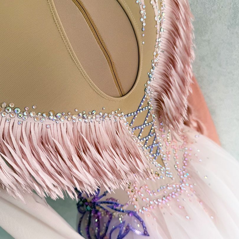 Персиковый цвет с лавандовыми акцентами означает теплоту и нежность, присущие мелодии, наполняющие произведение светом и глубиной. Ткань платья сочетает в себе струящиеся и мягкие элементы, создающие ощущение плавности и гармонии, и плотные, насыщенные материалы, такие как бархат, добавляющие изысканности и структурности образу. Платье воплощает волнующую и одновременно спокойную энергию, присущую концертному произведению, подчёркивая внутреннюю силу и грацию спортсменки.
