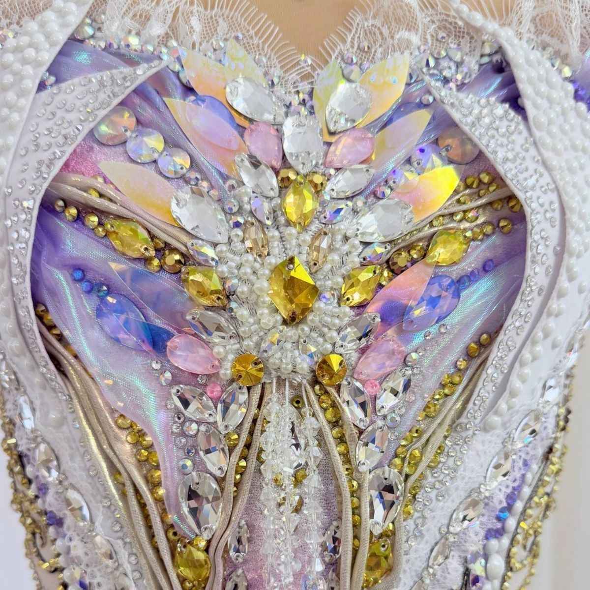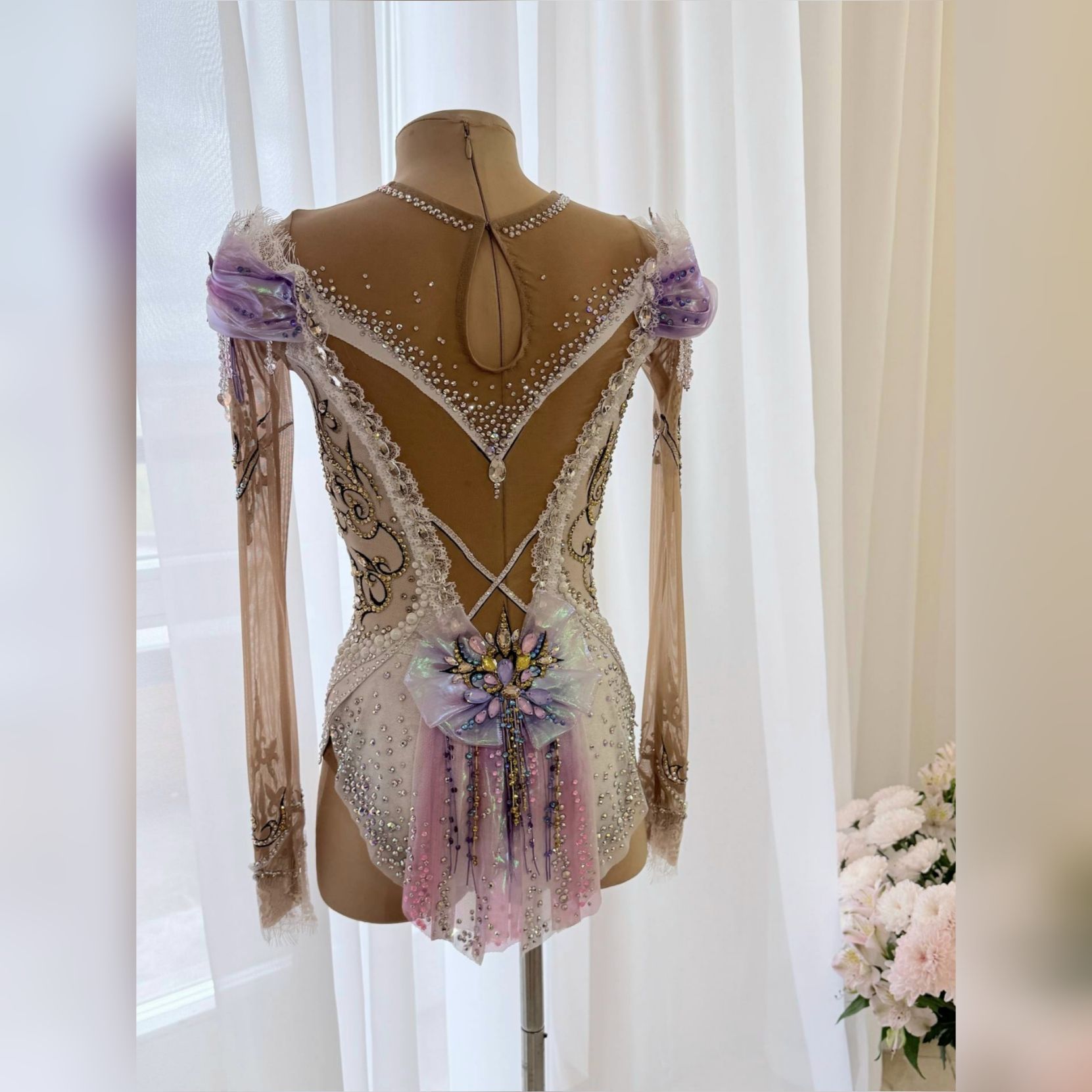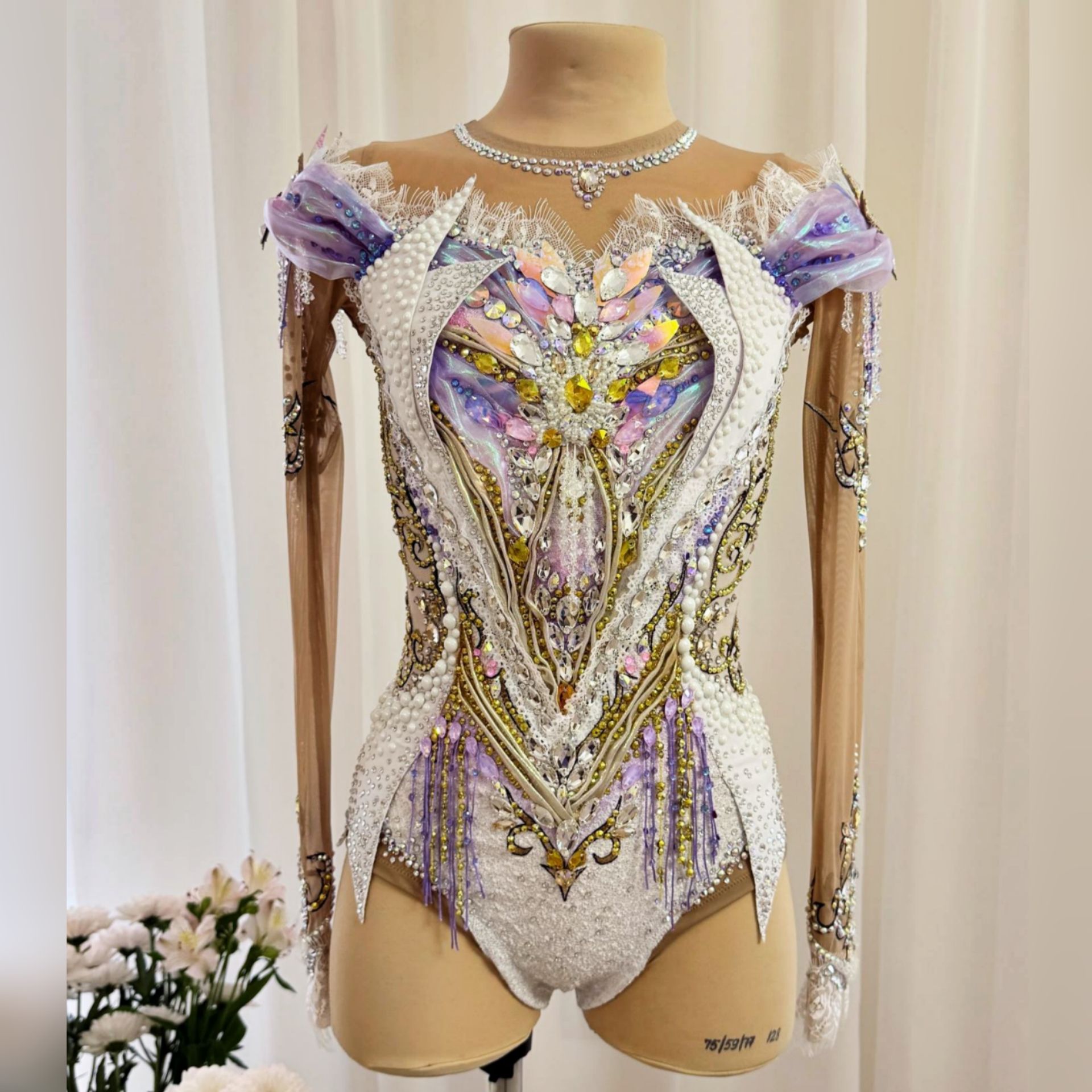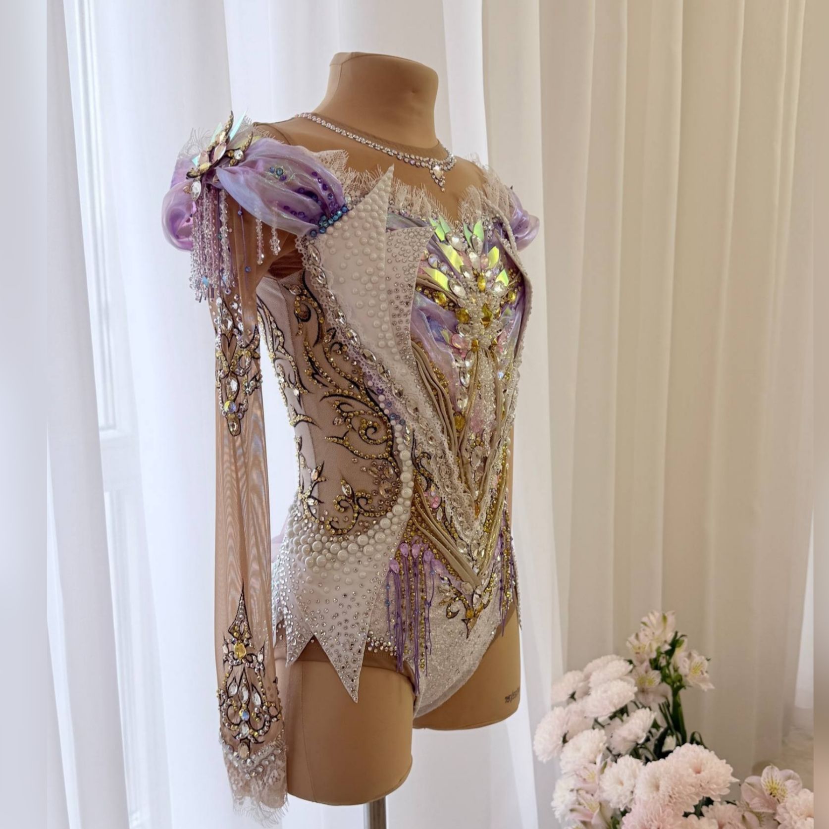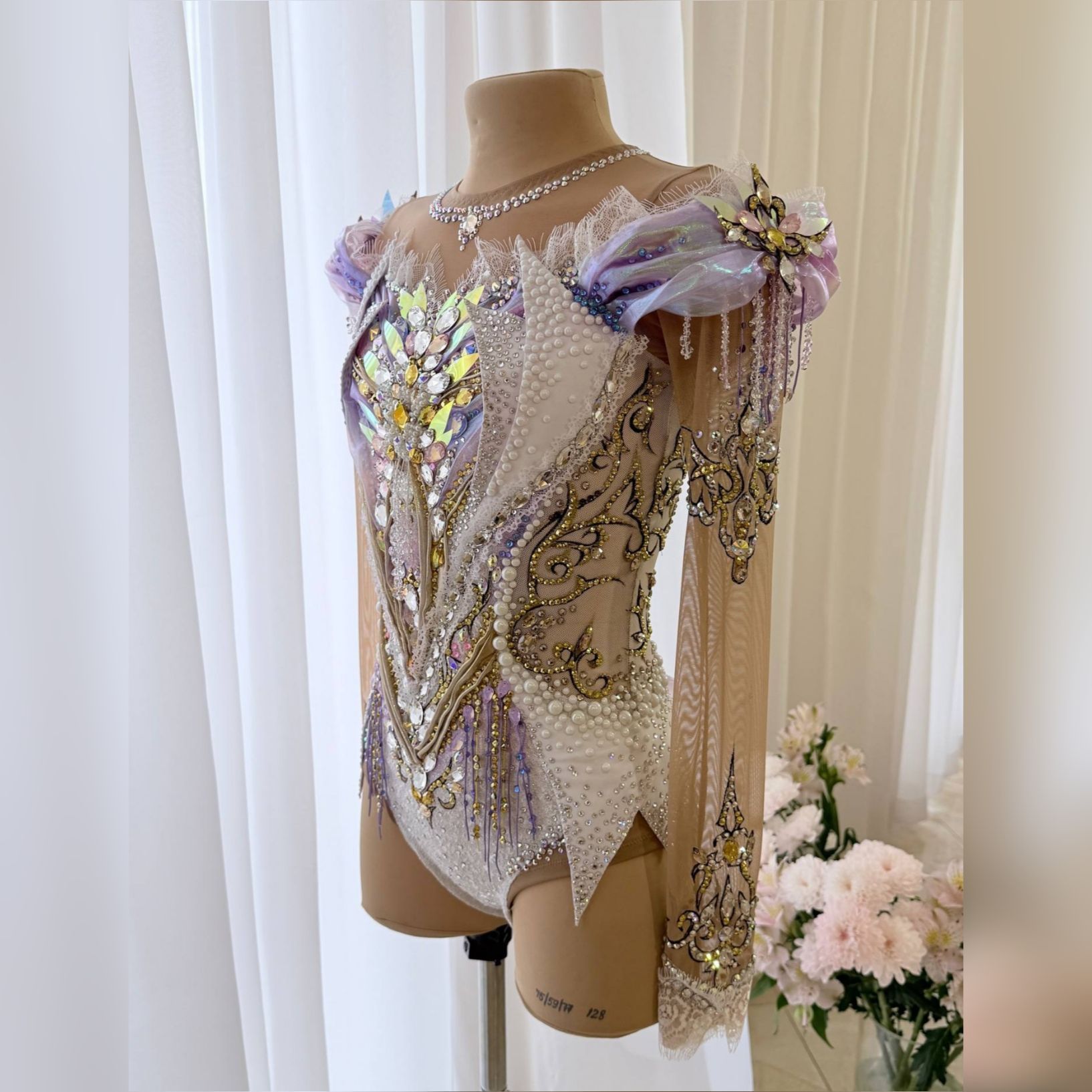 Купальник,  в котором каждая грань сияет, словно отражение бликов  в зеркальном зале Венского бала. Белый фон, золотые узоры , переливы сиреневого и россыпь кристаллов создают эффект настоящей феерии. Каждое движение в нем превращается в танец света и волшебства , делая образ по-настоящему королевским . Он создан , что бы покорять сердца и сиять на ковре , словно вальс под светом хрустальных люстр, превращая гимнастку в настоящую принцессу бала .