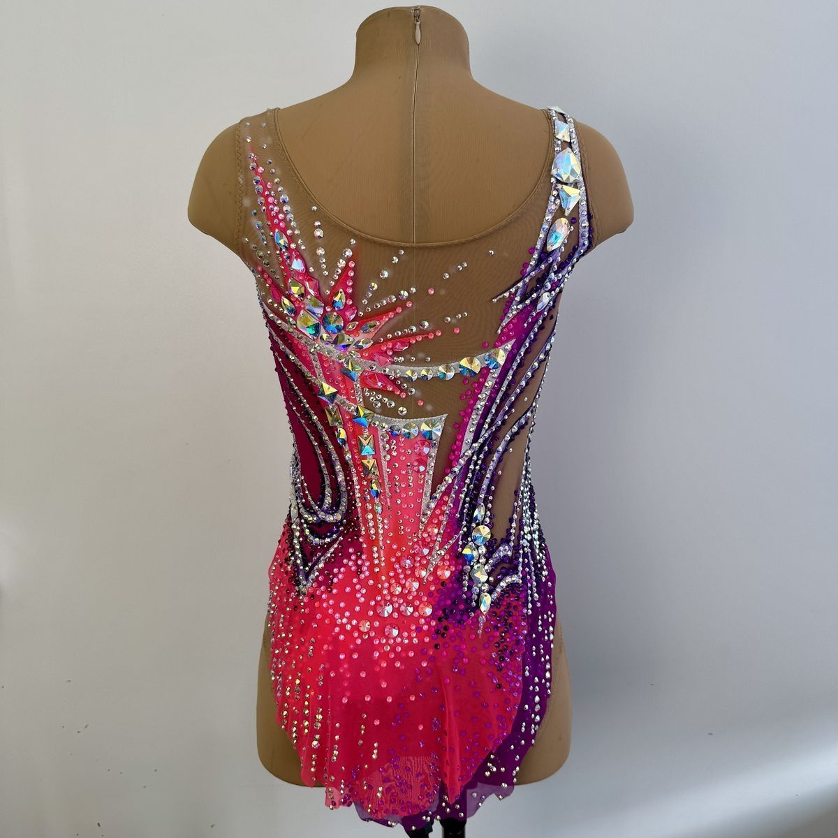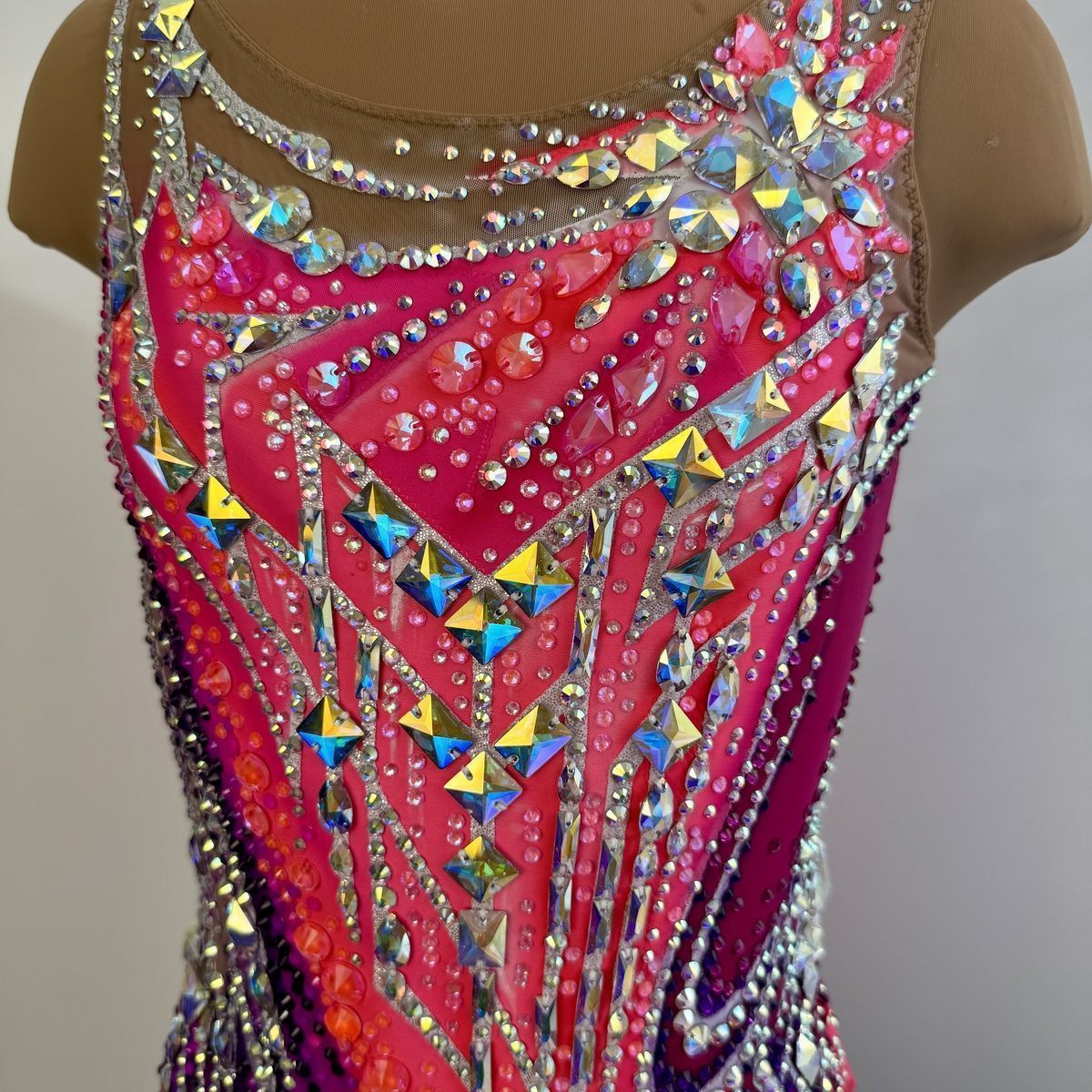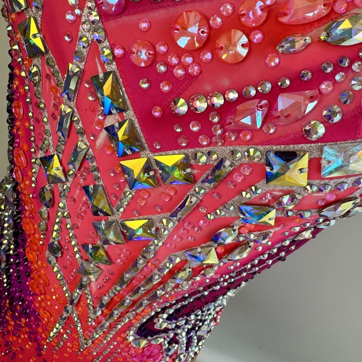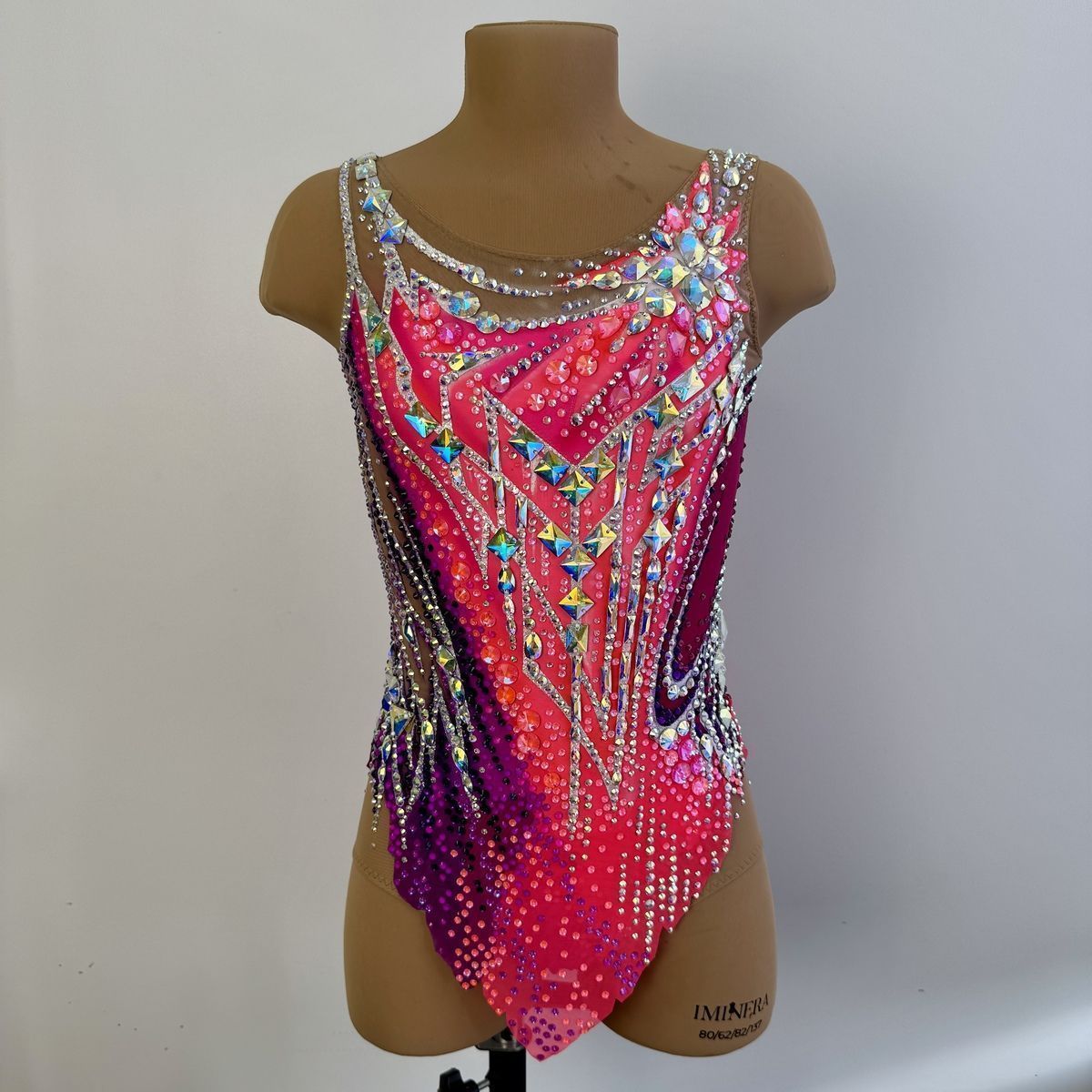 Этот купальник — воплощение изящества Венского бала. Оттенки розового напоминают о бутонах роз в пышных букетах на балах, а мерцающие стразы повторяют блеск хрустальных люстр в роскошном бальном зале. Асимметричный крой и динамичные линии добавляют современной дерзости, создавая гармоничный диалог между классической эстетикой и динамикой художественной гимнастики. В этом наряде юная гимнастка подобна звезде, кружащейся в бессмертном вальсе.