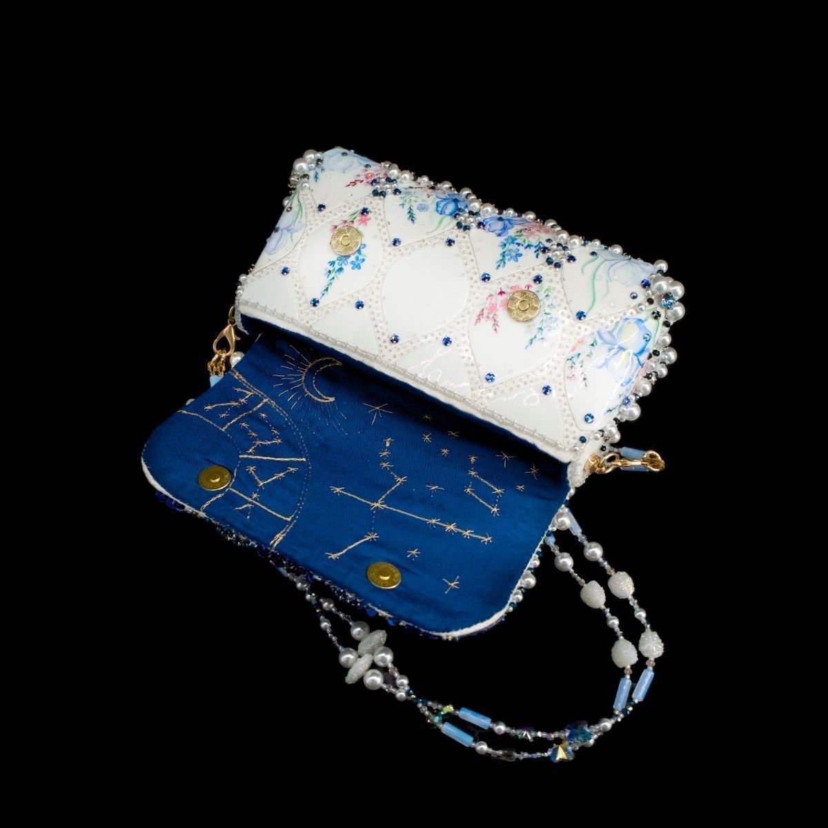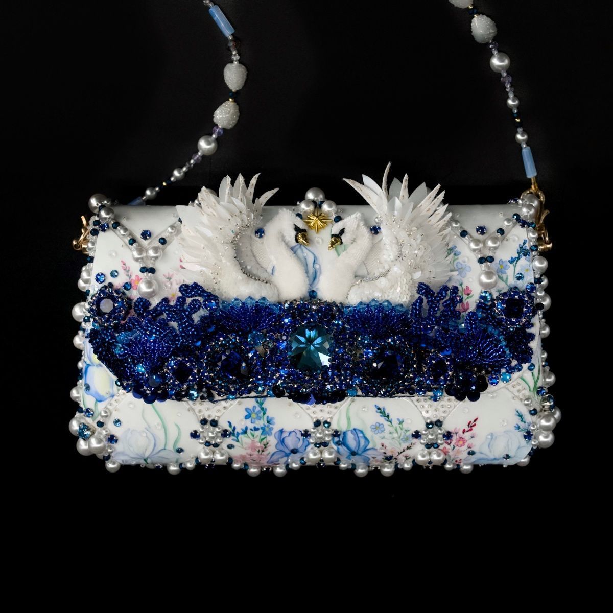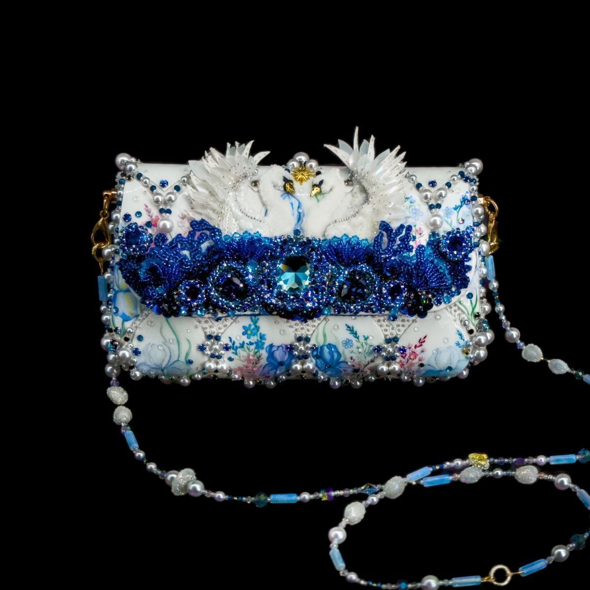 В представленной сумочке этот сюжет обрел свой символичный, счастливый финал, найдя свое отражение в мерцании хрусталя и жемчуга, в бликах расписного «фарфора», как напоминание о хрупкости, казалось бы, незыблемых идеалов и традиций.