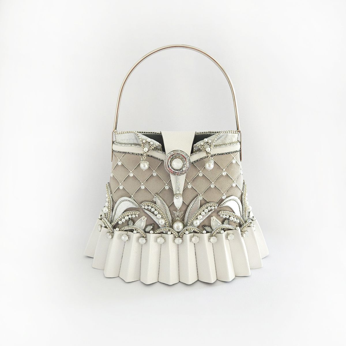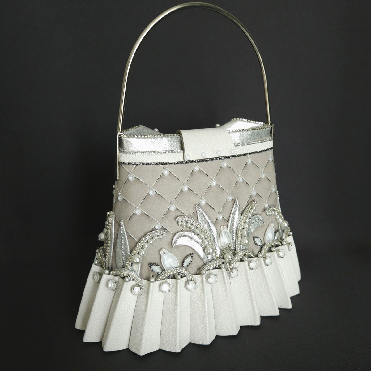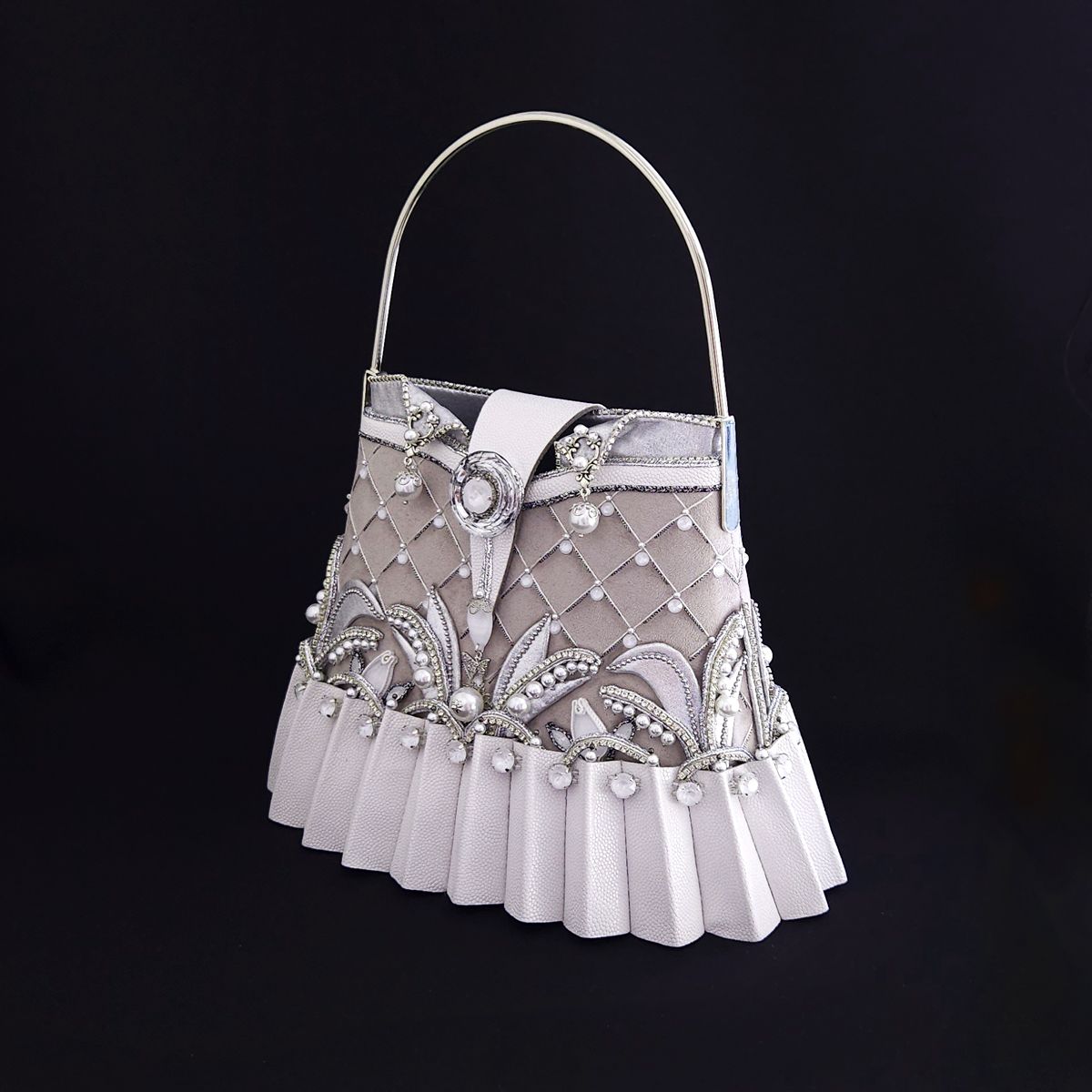 При создании сумки я попыталась соединить два мира: мир традиций, где царят вальс и этикет, и мир будущего, где правят чистые линии и технологии. За классику отвечают: жемчуг, превратившийся в нежные ландыши, общий цветочный мотив и имитация каретной стяжки. Футуристическим контрастом выступают элементы, лишенные декора: строгое геометричное плиссированное основание и лаконичная ручка простой формы.