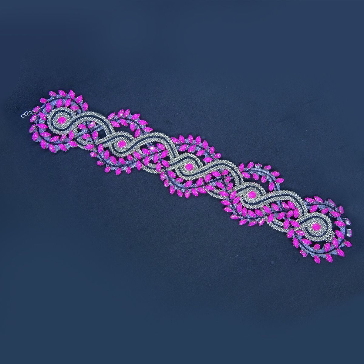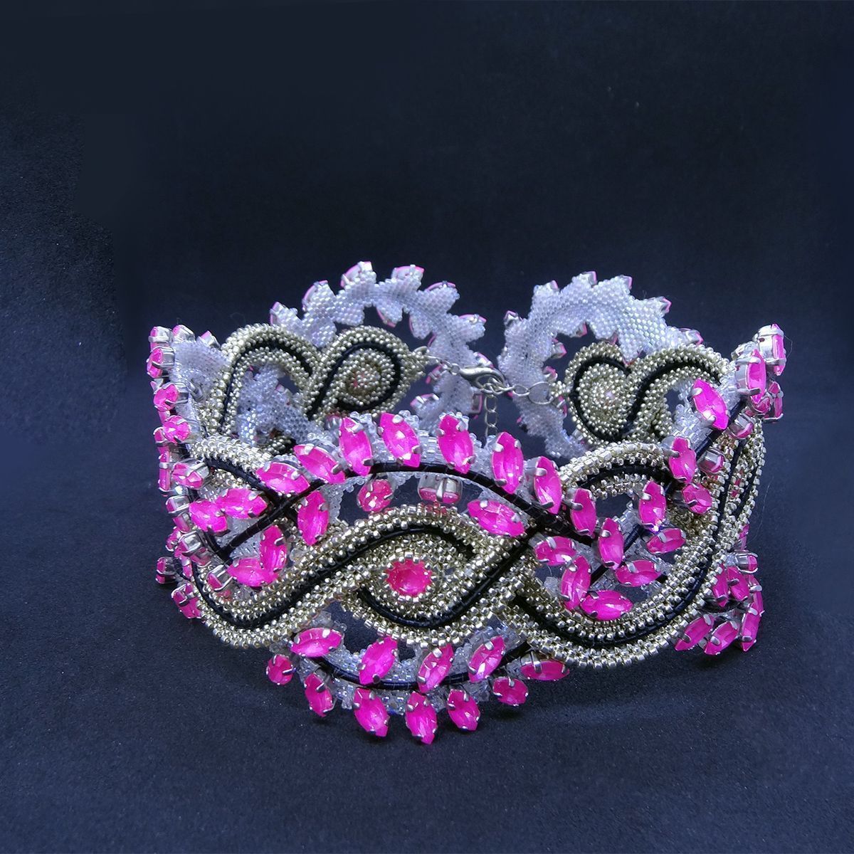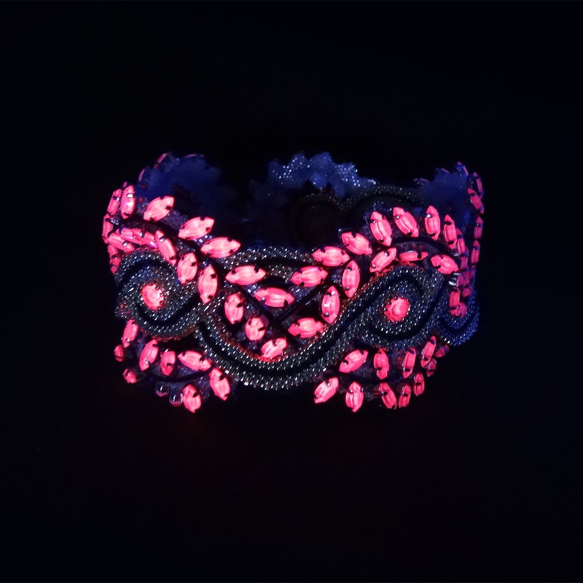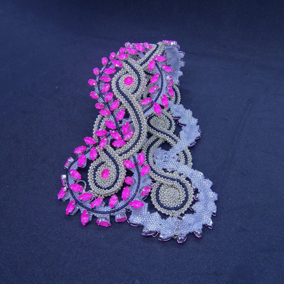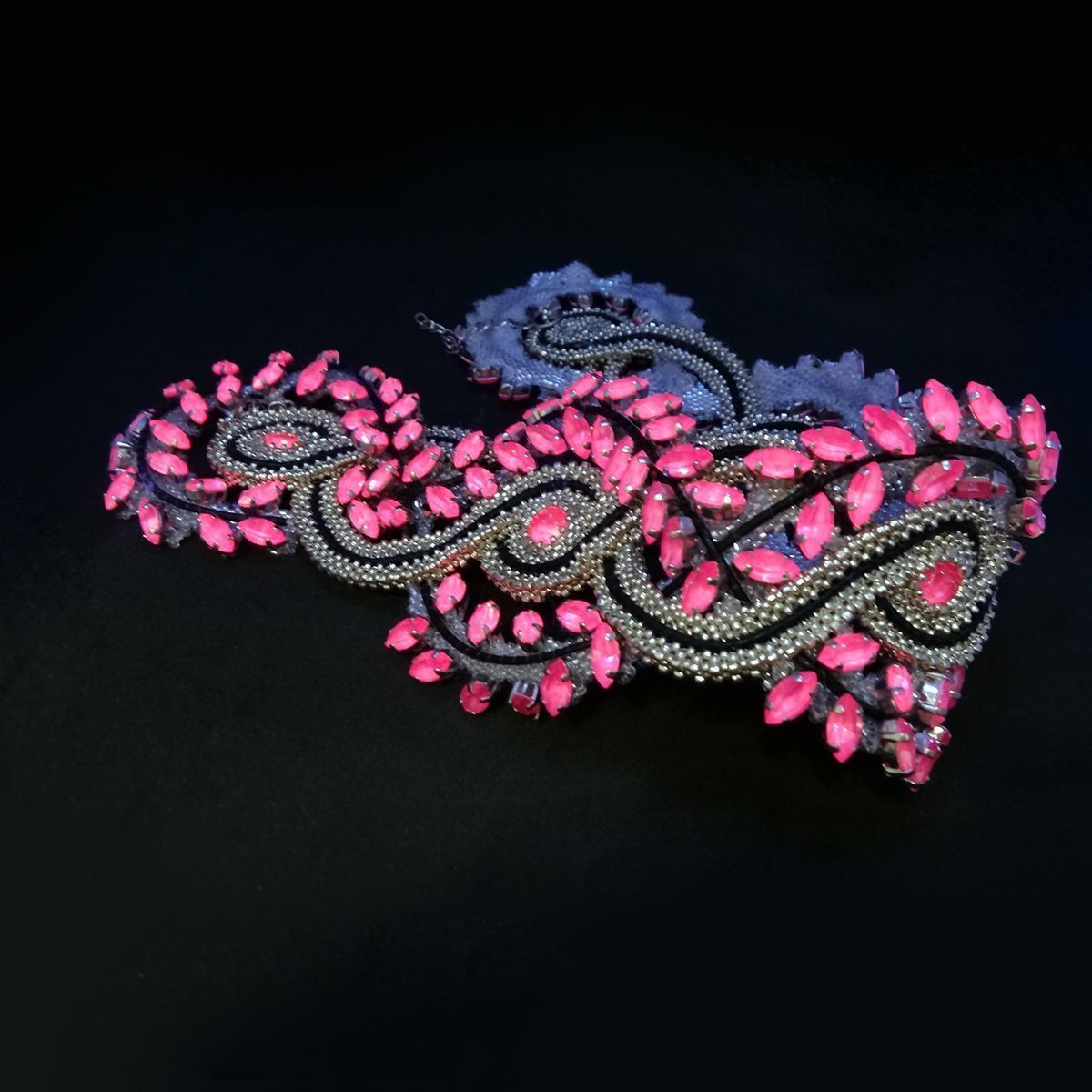В данной работе я хотела обратиться к классическому дизайну, но решить его в ярком современном цвете. Основной тон задает растительный орнамент в тесном переплетении со строгими графическим формами. Такое украшение будет актуально в современном варианте Венского бала, а если там еще будут и ультрафиолетовые лампы, то колье заиграет неожиданными красками и в темноте.