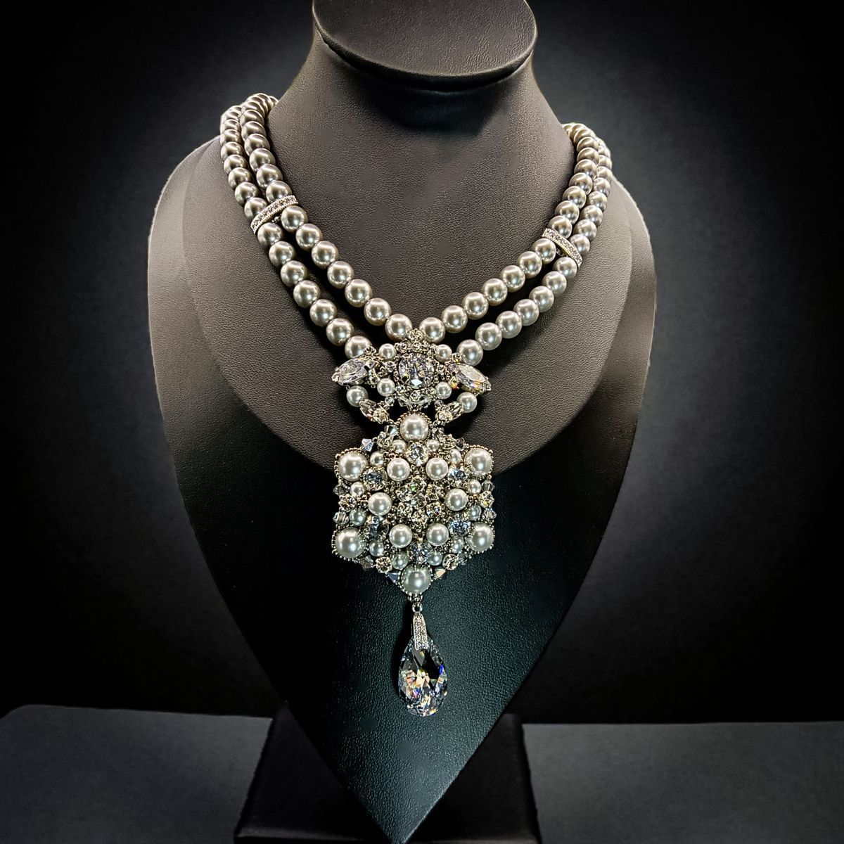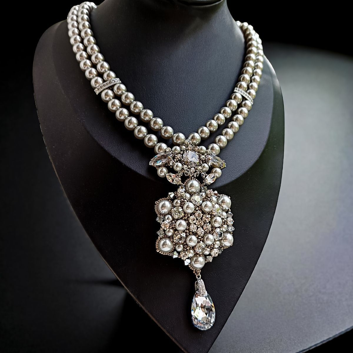 Это колье — воплощение аристократической элегантности и вечной классики. Две изящные нити жемчуга соединяются в роскошный кулон, переливающийся сиянием кристаллов и утончённым блеском жемчужин. Завершающий акцент — каплевидный кристалл, словно луч света, упавший из хрустальной люстры дворца Хофбург.