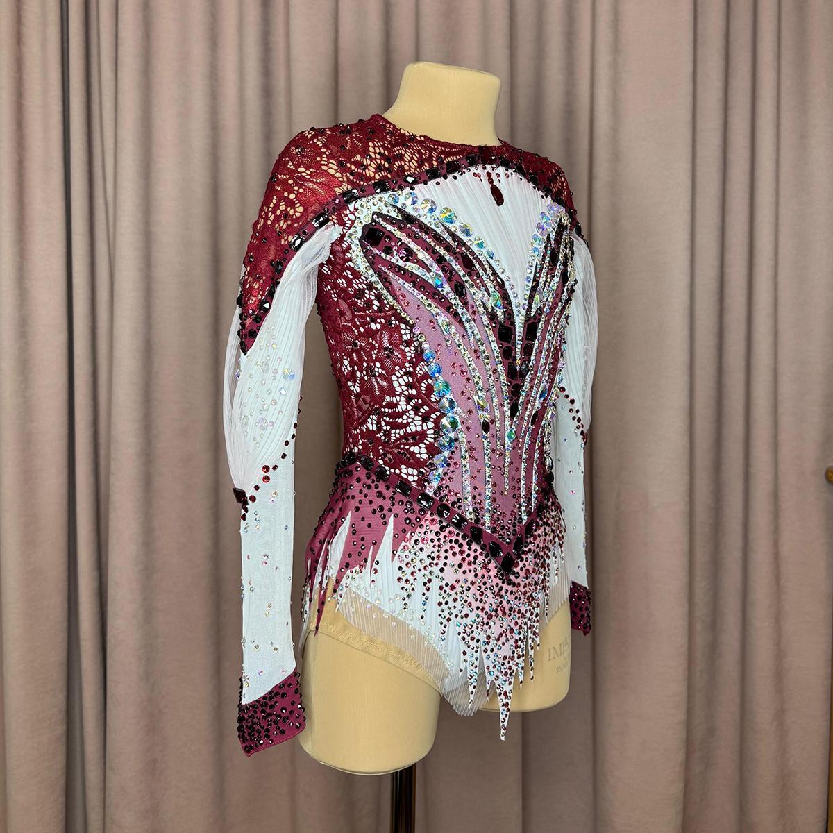 Материалы: Костюм выполнен из бифлекса, эластичной сетки и кружева,струящегося плессированного материала. Все эти ткани обеспечивают свободу движений и подчеркивает грацию гимнастки. На поверхности ткани использованы блестящие стразы, которые добавляют эффект сияния и делают костюм более нарядным.